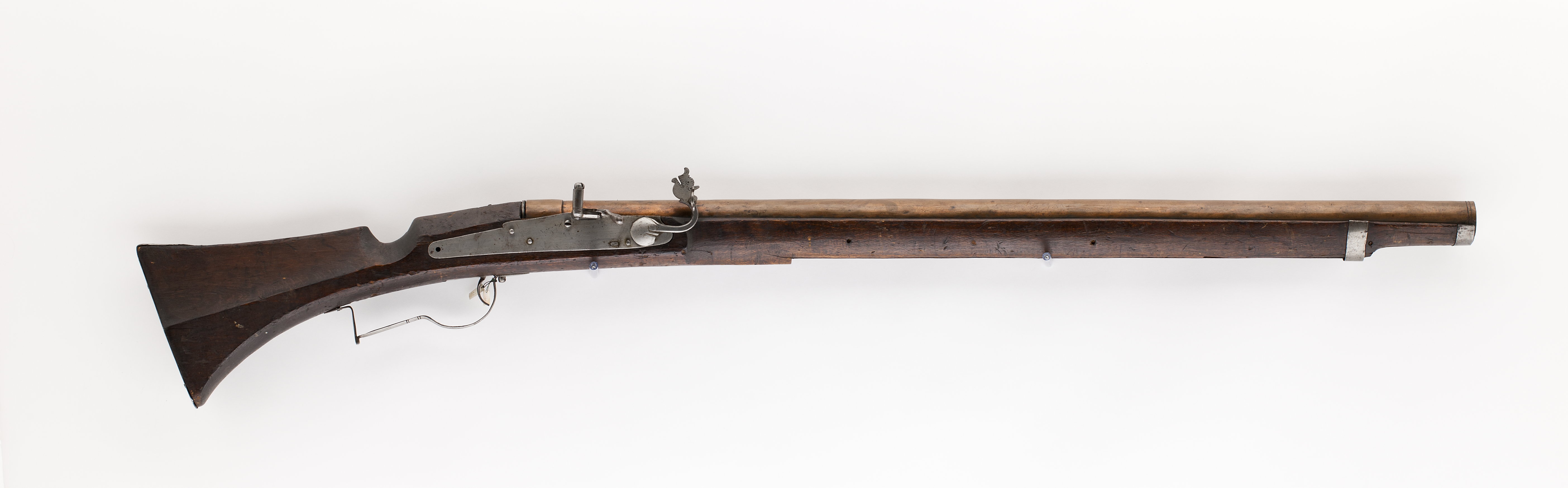 Rund, slätborrad pipa av koppar, förstärkt i kammarens bakre del. Svansskruv och rektangulärt svansskrublad av stål. Riktmedel saknas. Fästning: Pipan fäst med krysskruv underifrån (främre v4arbygelskruven) samt tre pipstift av trä. Luntlås med hävstångsmekanism, plant låsbleck. Kantig fängpanna fäst vid låsblecket, rektangulärt fängpannelock med kraftigt, droppformigt fingergrepp, horisontellt vridbart runt skruv, vid vilken också en rak krutskärm med konturerad överkant är fäst, en flik av skärmen går in över pipan. Böjd hane med rund, välvd kropp. Drakformig luntklämma, punsad dekor, klämskruv med c-formigt huvud. Fästning: Två låsskruvar. C-formig avtryckare. Rektangulärt avtryckarbleck med spetsiga kortsidor. Brun, grov helstock, muskötkolv med nedskuret tumläge, öppen laddstocksränna med nötta kanter. Beslag av stål. Bakplåt med smal tunga, rörka i form av stålband runt framstocken, näsband av stål. Utdragen och framtill nedsvängd varbygel med korta, spetsiga armar, omvänt c-formig, bakre stolpe. Två fästskruvar, den främre krysskruv.