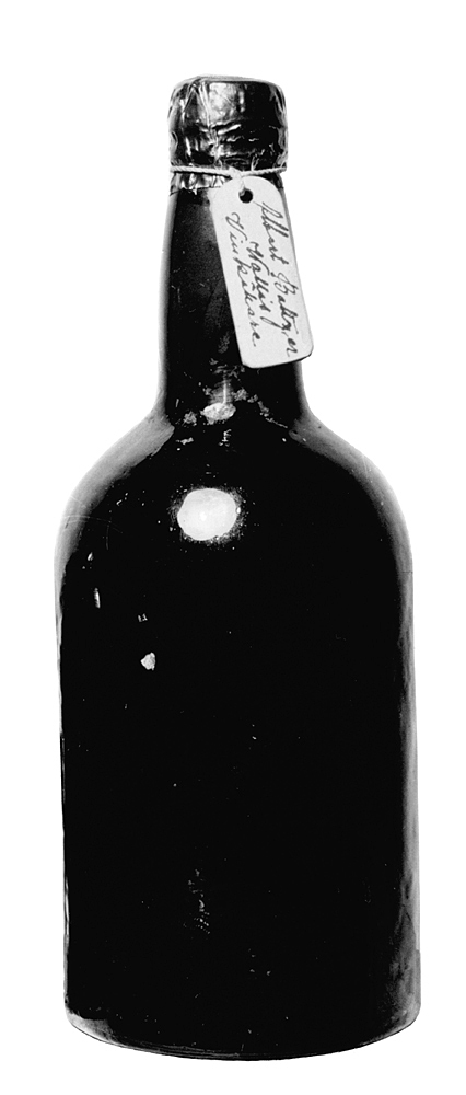 GAMMALT VIN, sju helbuteljer Buteljer av mörkbrunt glas. Cylindriska, med kupigt indragen skuldra och svagt spolformig hals; kring mynningen en vulstig utsvällning (s. k. stärkring); botten på en butelj konisk, högt uppskjutande, på två konisk samt på de fyra övriga skålig; två av buteljerna något högre. Kapsyler av förtent bly, blåfärgade, ovanpå en druvklase i relief. På buteljhalsarna senare vidfäst en träbricka, varpå skrivet med bläck, på den vidare buteljen på ena sidan: "Vin", på den andra: Albert Baltzar Wallis Vinkällare". Höjd: 23,5 - 27 cm.; diameter: 9,1 - 9,6 cm. Emottagna av Johanna Kempe, f. Wallis, som arv efter hennes mor, Johanna Friederica Catharina Wallis.