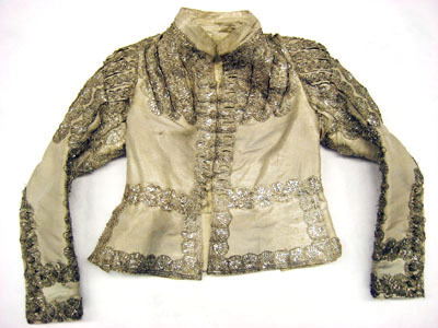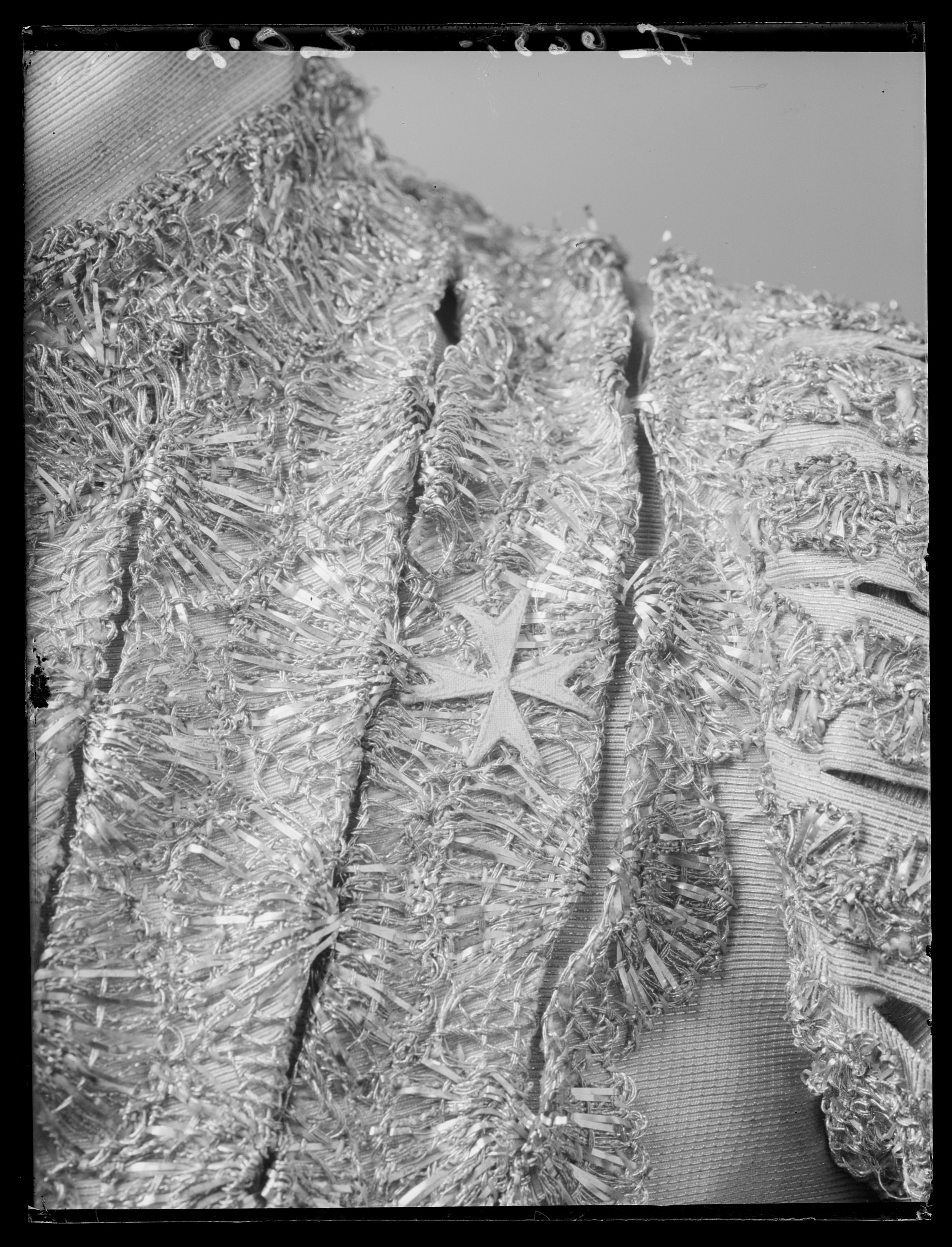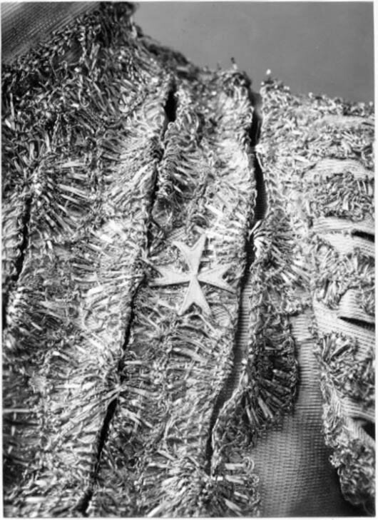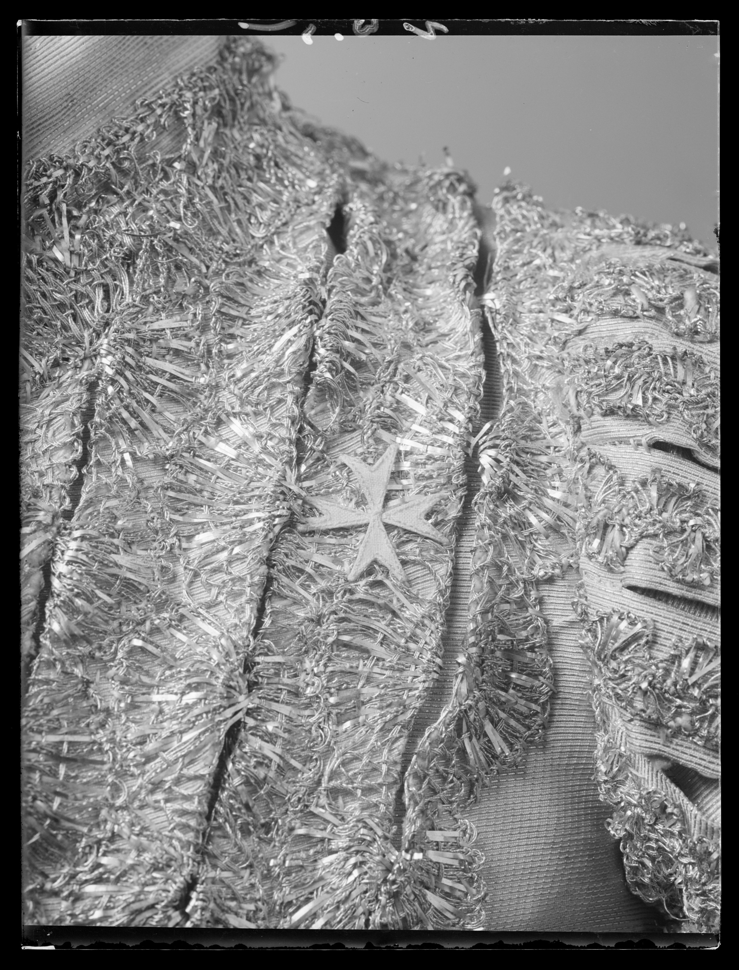 Jackan är sydd i ripsvävt silvertyg och har en silverspets runt hela jackans nedre kant, 27 mm bred. Samma silverspets, 30 mm bred, är även fastsydd på jackans midja. På jackans axlar fram och bak är tre lodräta slitsar dekorerade med silverspetsar (100 mm). Slitsarna med silverspetsar löper även över ärmarna på båda sidor. På höger axel är ett Johanniterkors (20 x 20 mm) sytt i linne och en knapp för ordensband. Halskragen är en sk ståkrage och 22 mm hög. Jackan knäpps mitt fram med nio stycken knappar och de nio knapphålen är 20 mm breda. Även från armbågen och och ner till ärmens slut löper en 155 mm lång knäppning med sju stycken knappar beklädda med silver. Nertill från midjan är är åtta trapetsformade skörtkappor.