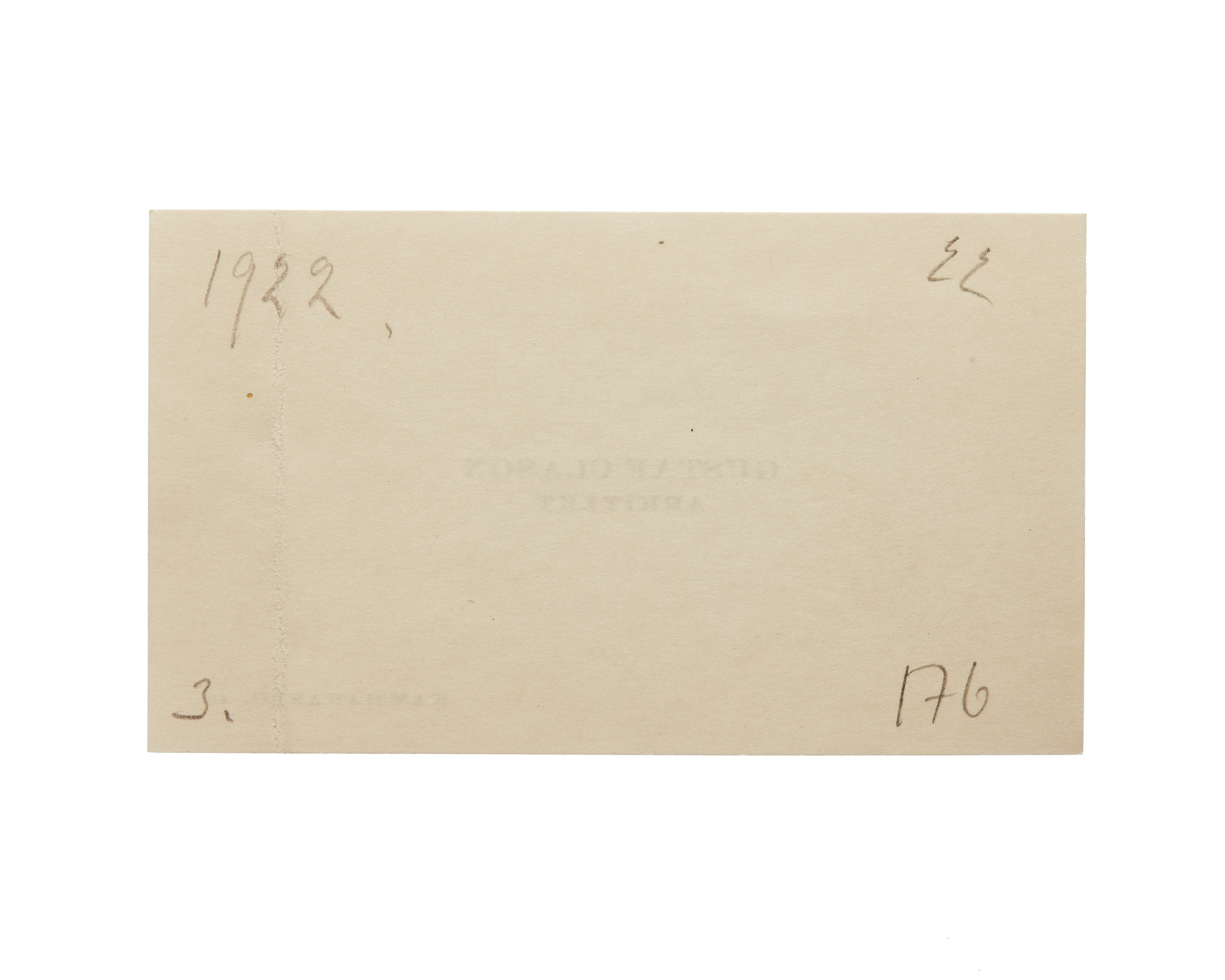 Tre visitkort från Arkitekt Gustaf Clason. Första kortet daterat 1921, adress (nedre högra hörnet) Kammakareg. 10. Andra kortet daterat 1922, vikt i högra sidan. Tredje kortet daterat 1922, vikt i högra sidan.