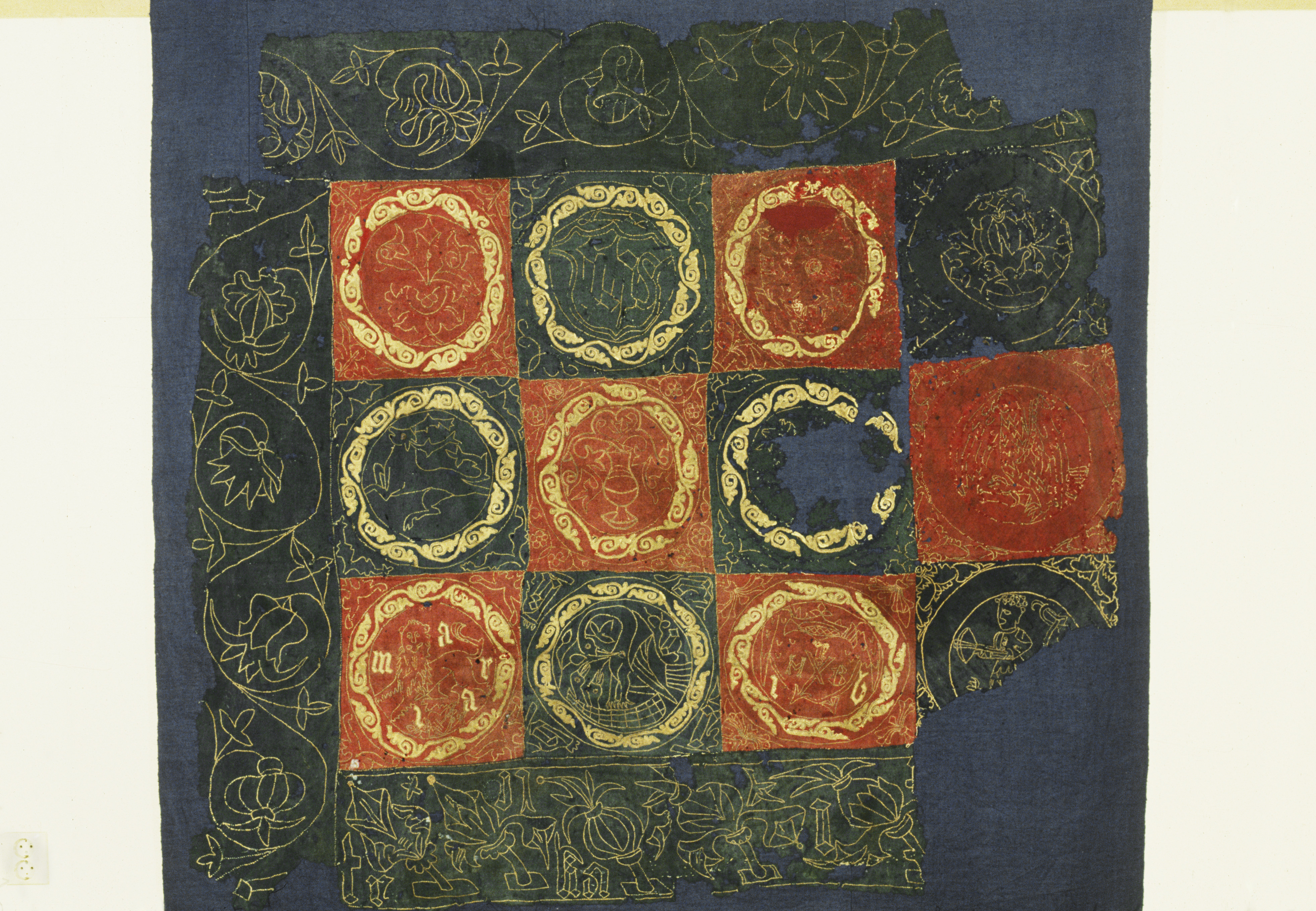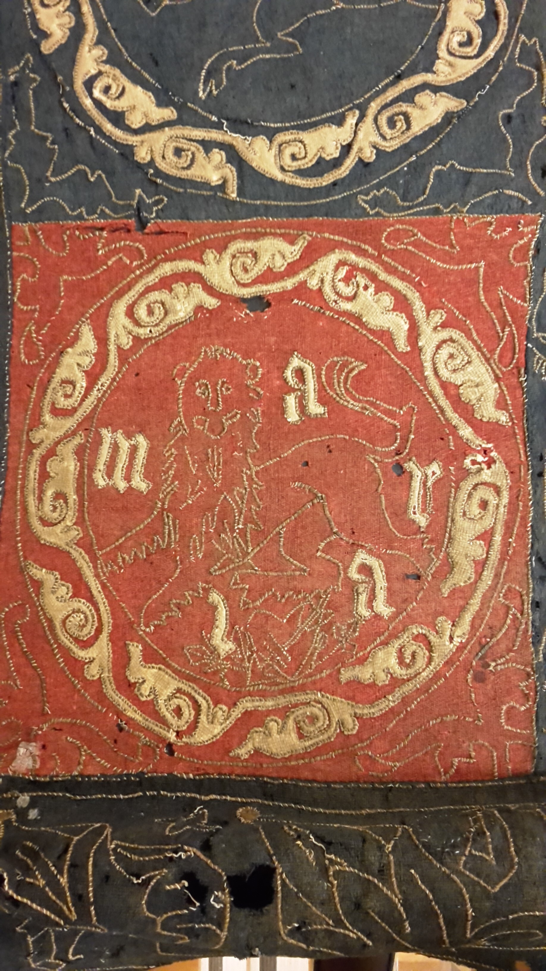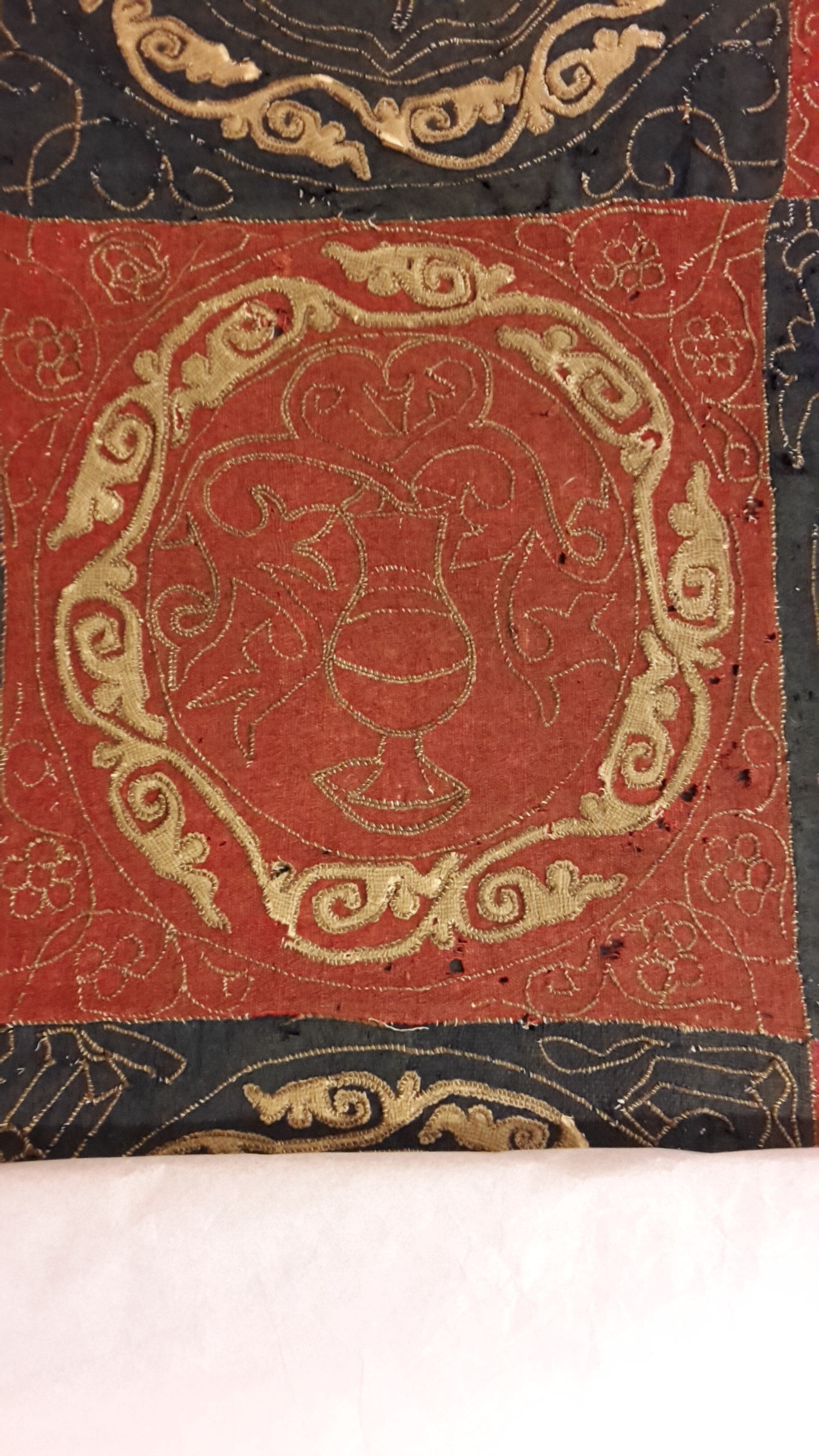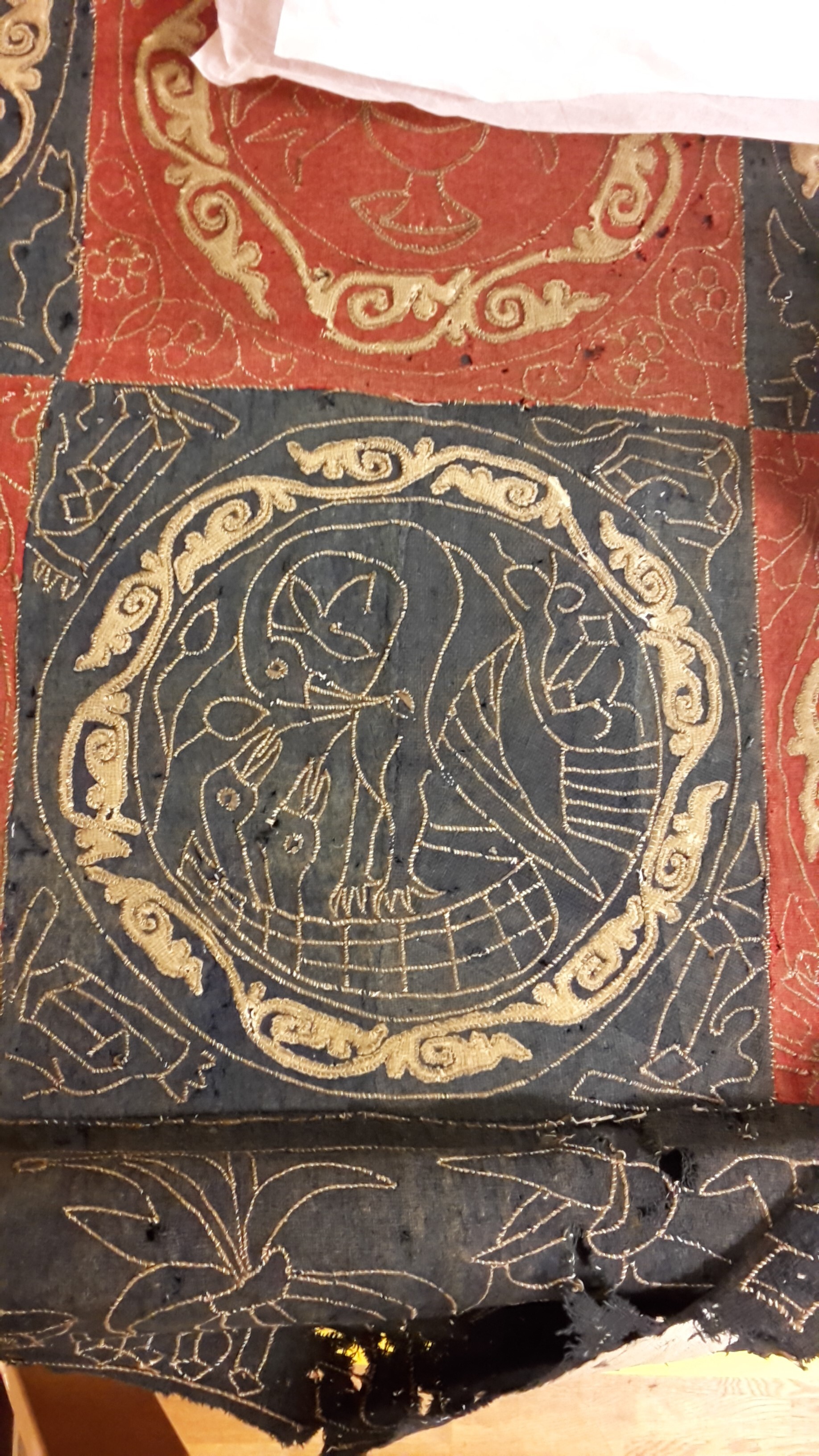 Röd och blå vadmal med 12 kvadrater med figurer i motstående färg, intarsiabroderi med guldskinnsremsor. Blå bård med ranka och tistelblommortecknade i guldskinnsremsor. Stödtyg av blå lärft. Åtkomsthandlingar saknas.