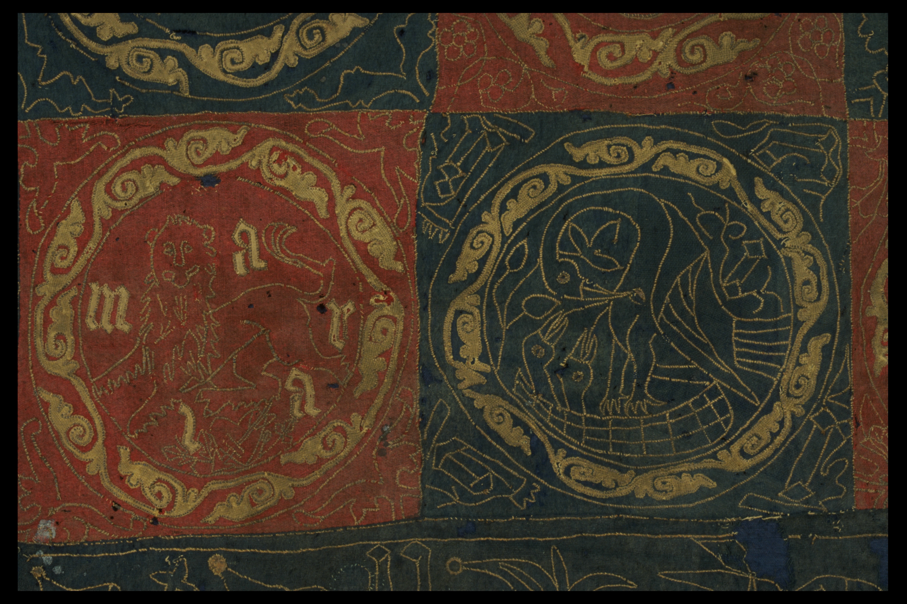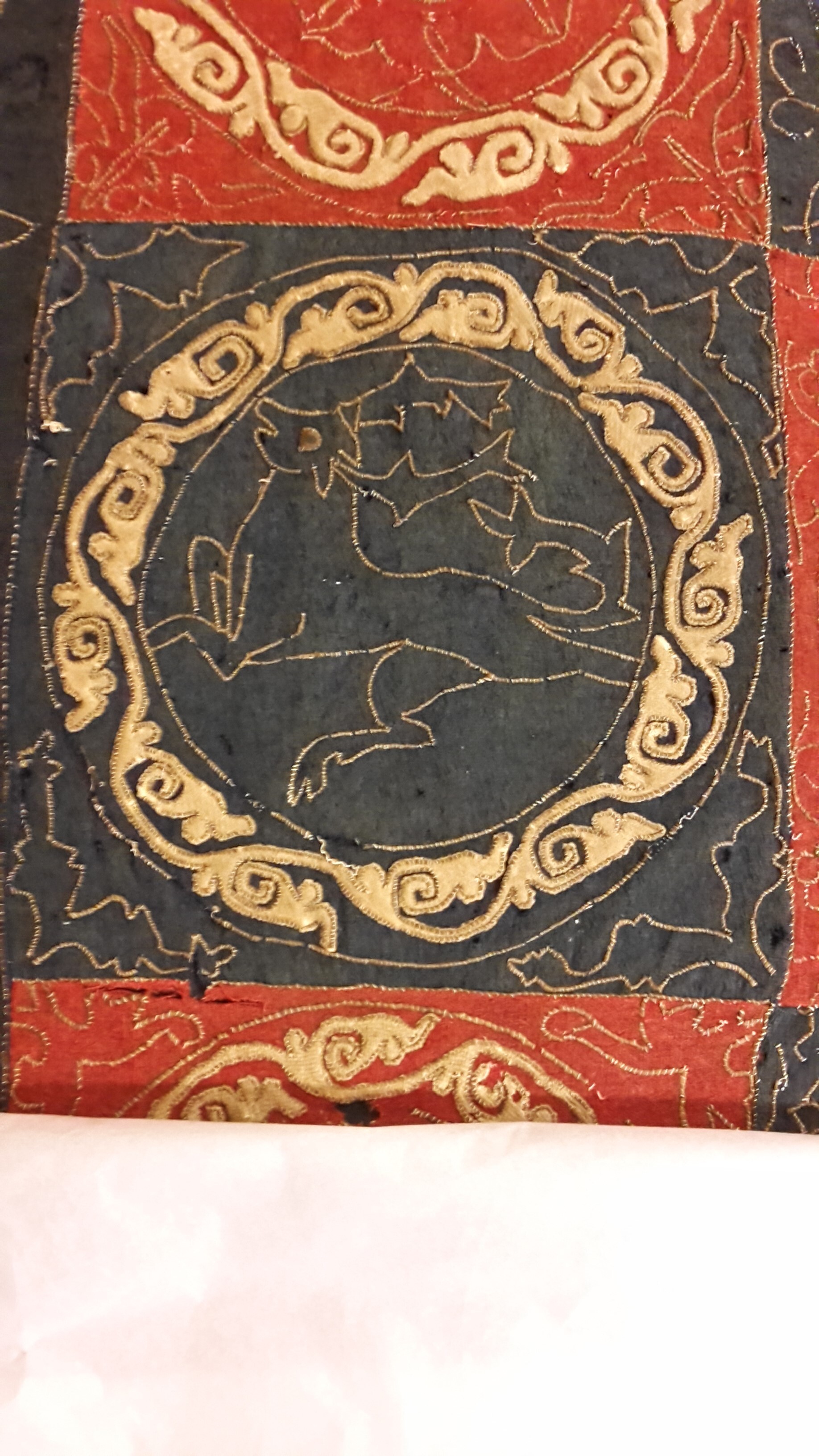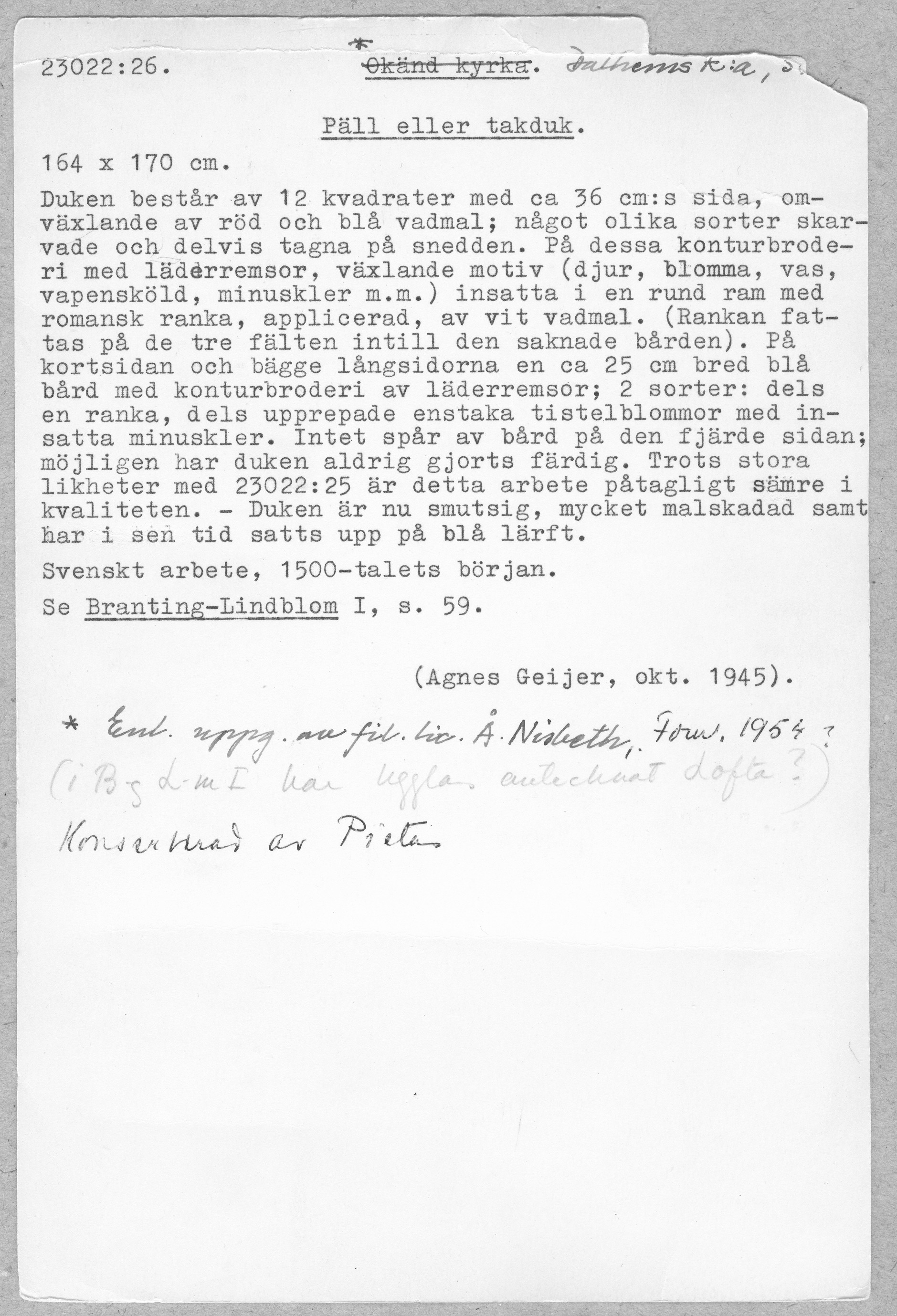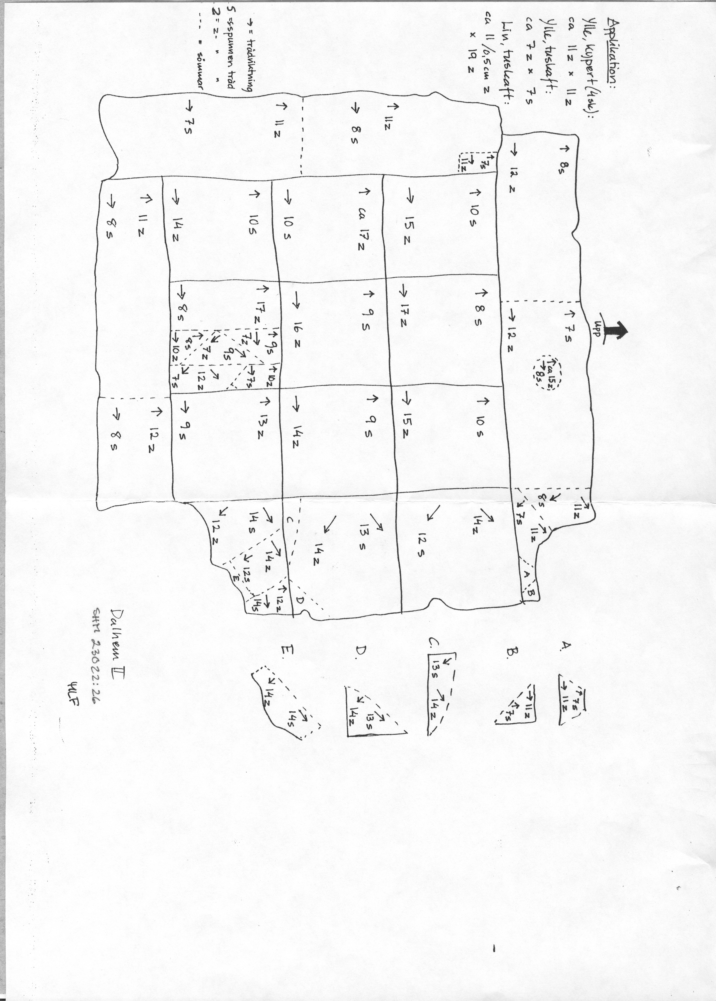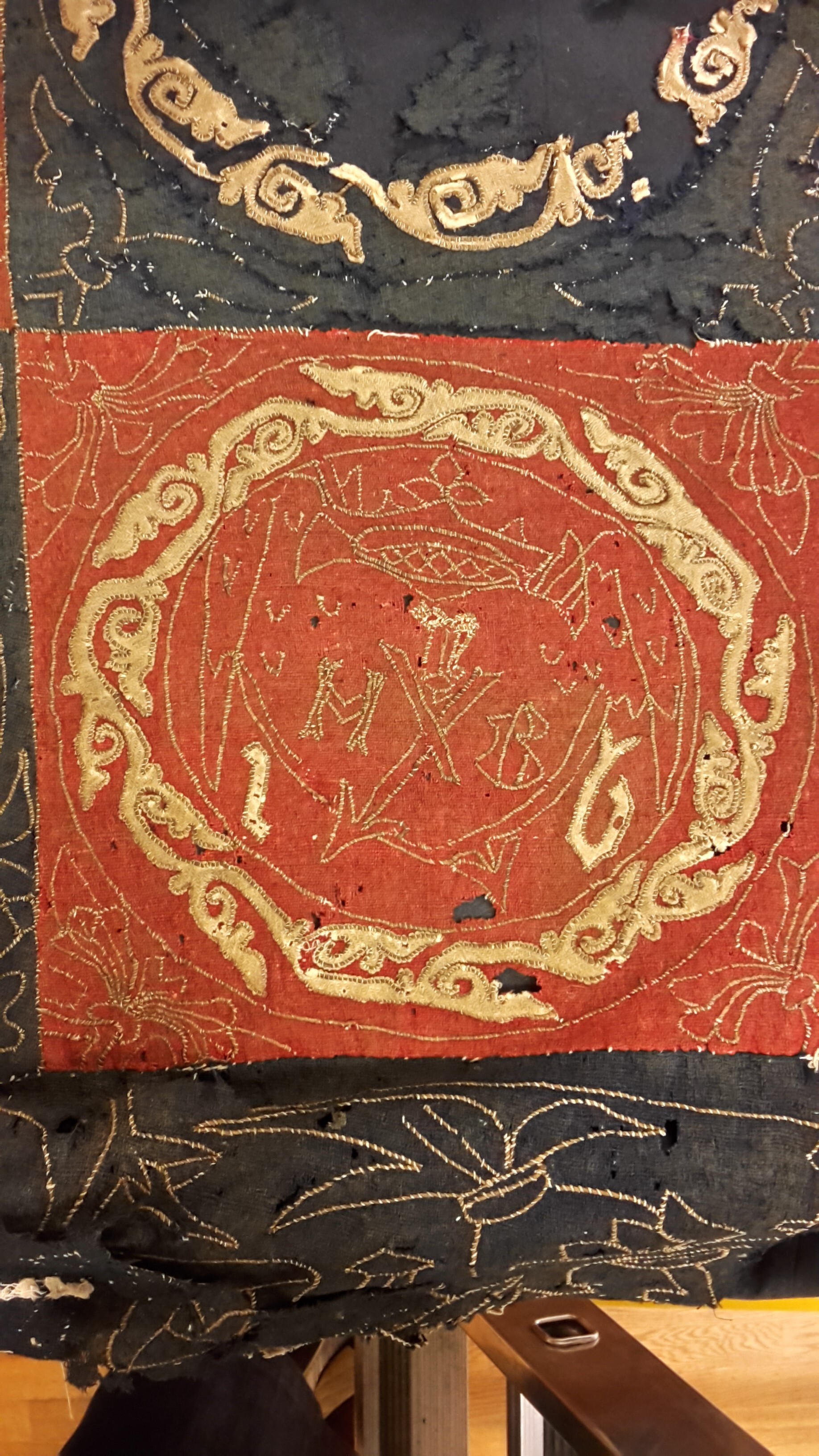 Röd och blå vadmal med 12 kvadrater med figurer i motstående färg, intarsiabroderi med guldskinnsremsor. Blå bård med ranka och tistelblommortecknade i guldskinnsremsor. Stödtyg av blå lärft. Åtkomsthandlingar saknas.