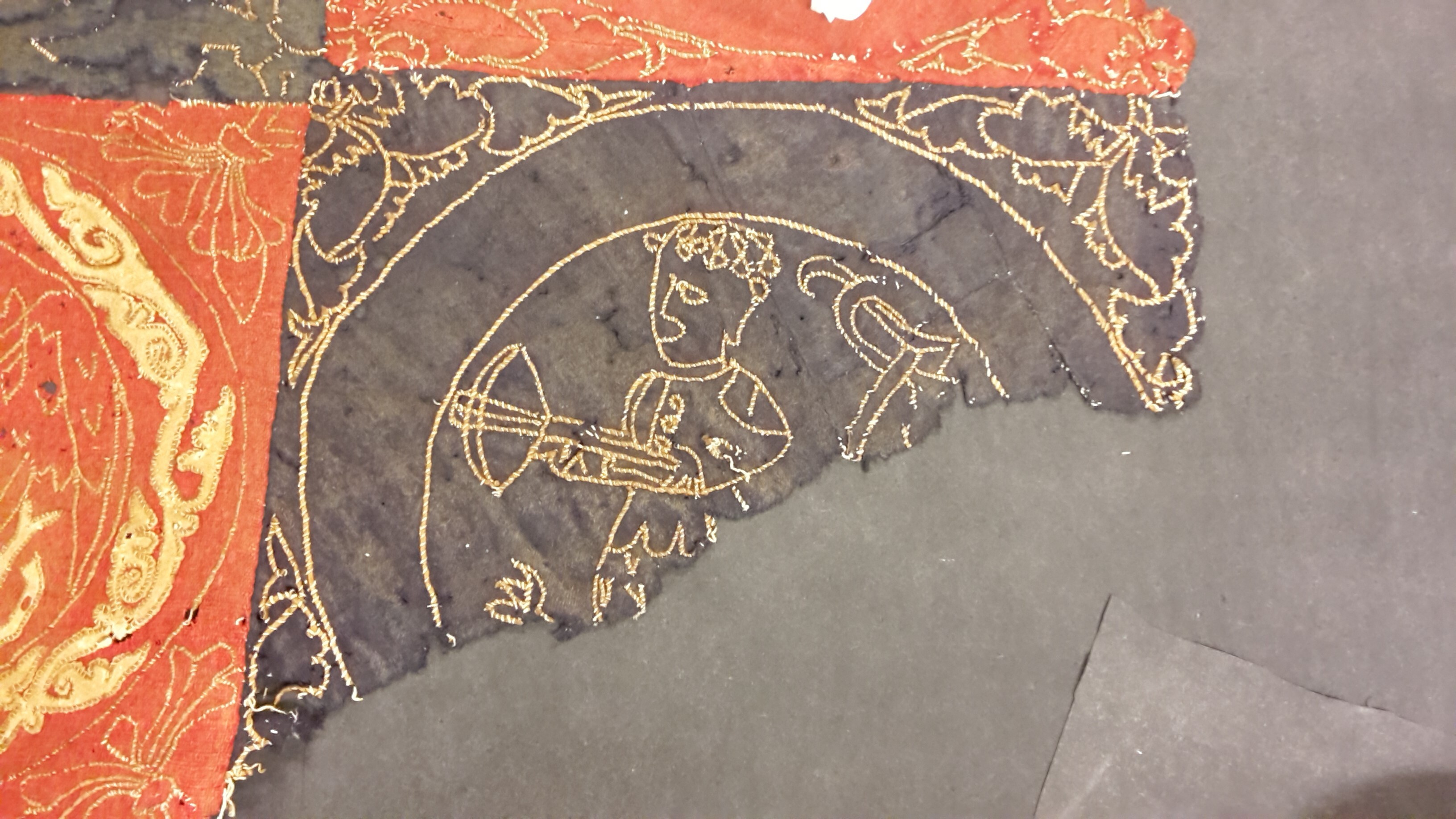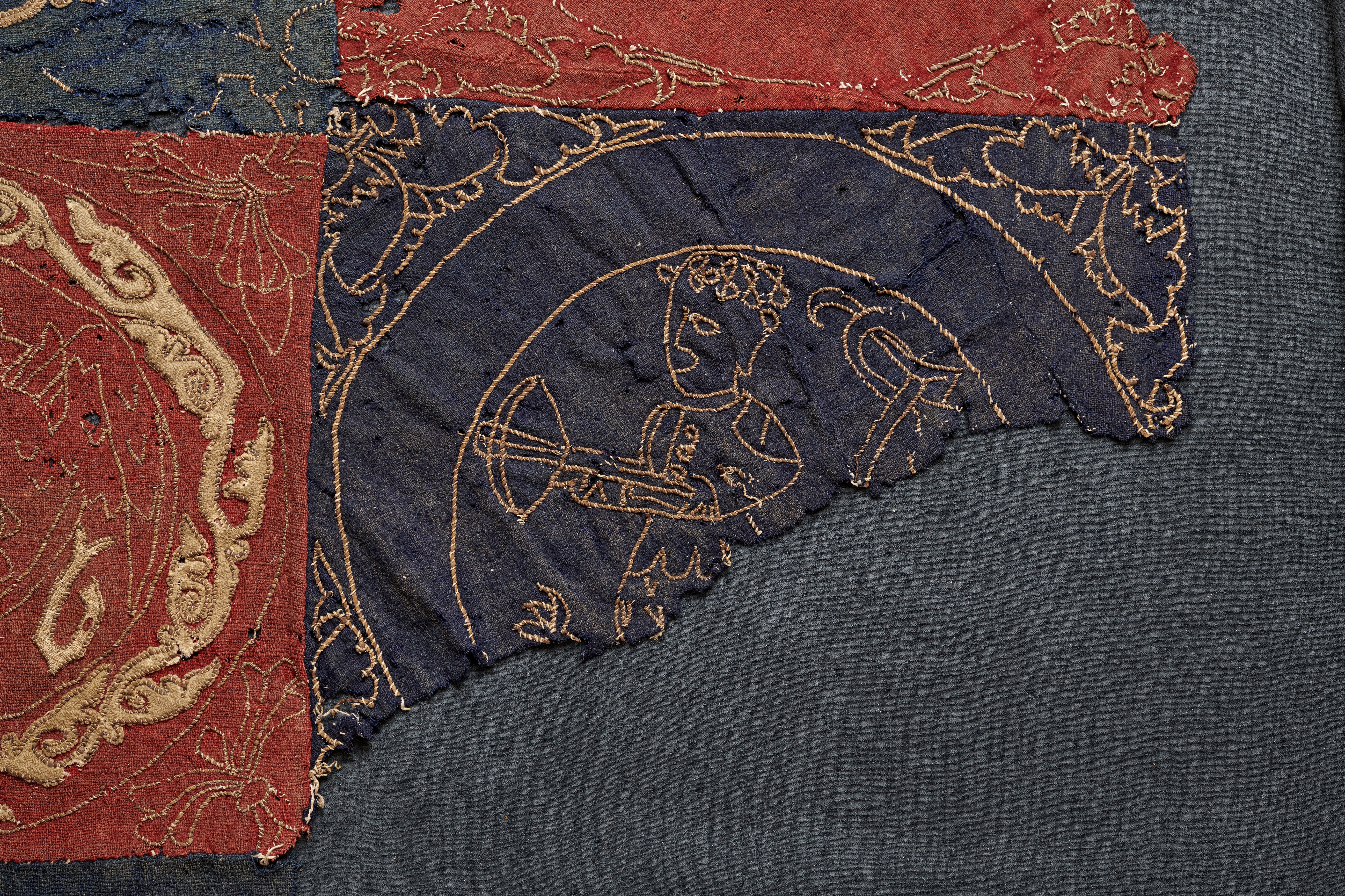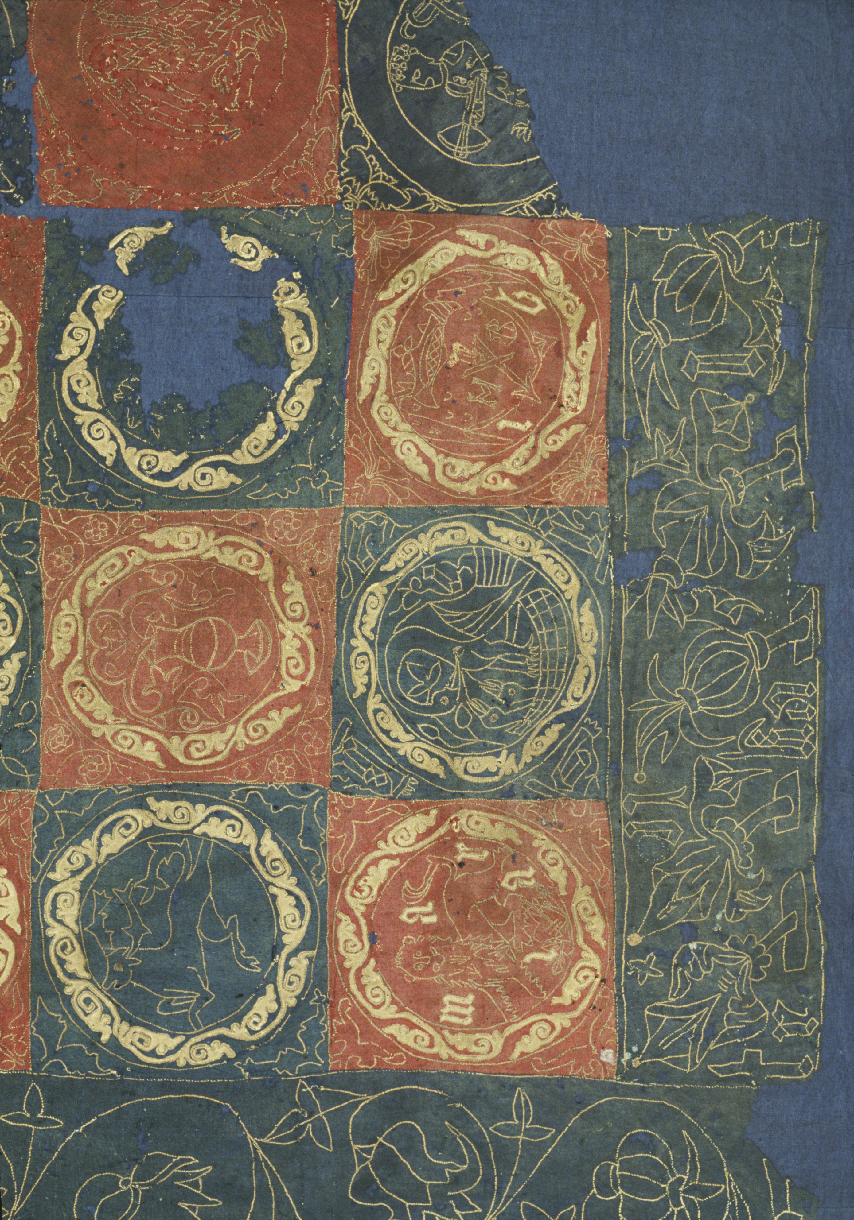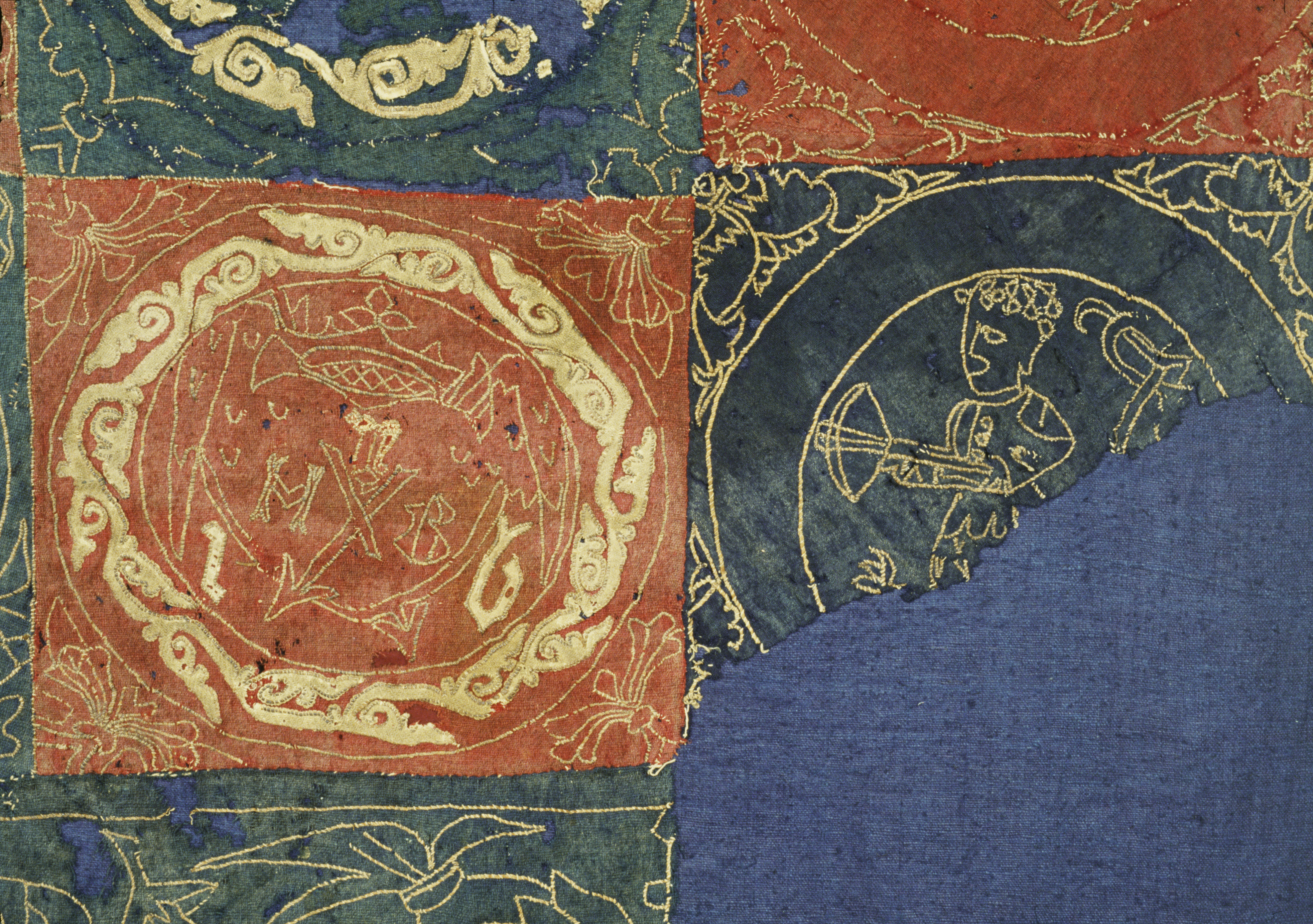 Röd och blå vadmal med 12 kvadrater med figurer i motstående färg, intarsiabroderi med guldskinnsremsor. Blå bård med ranka och tistelblommortecknade i guldskinnsremsor. Stödtyg av blå lärft. Åtkomsthandlingar saknas.