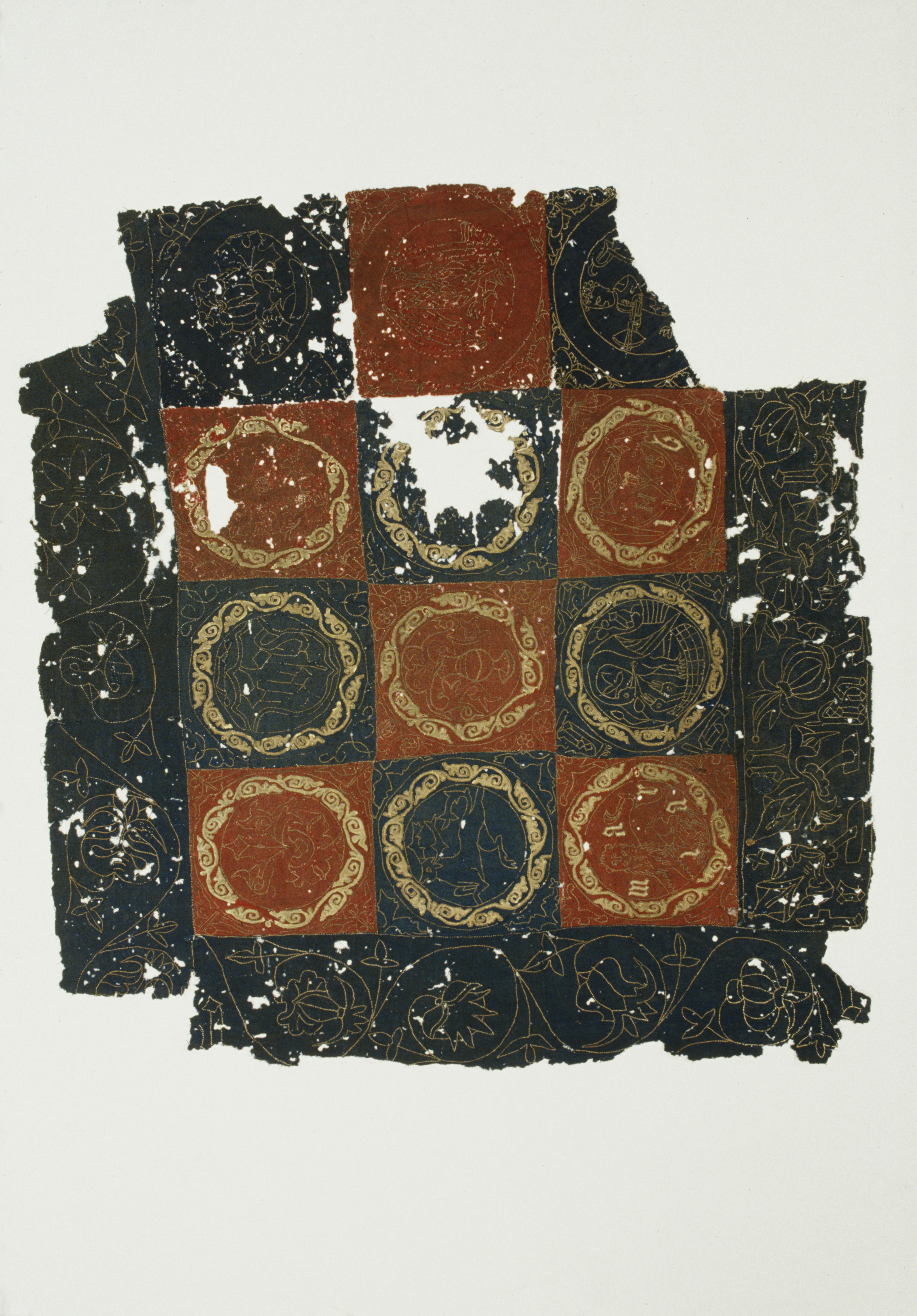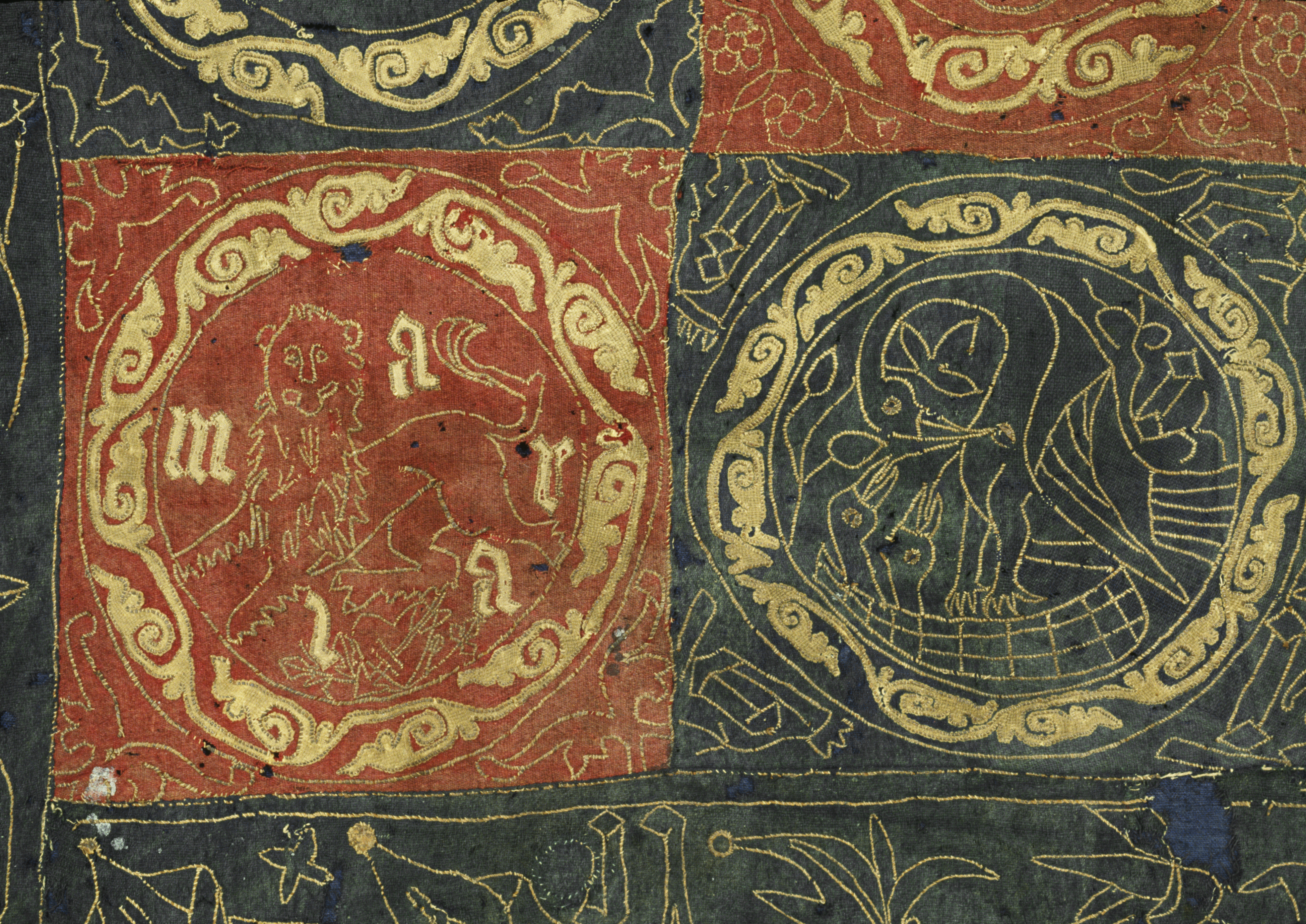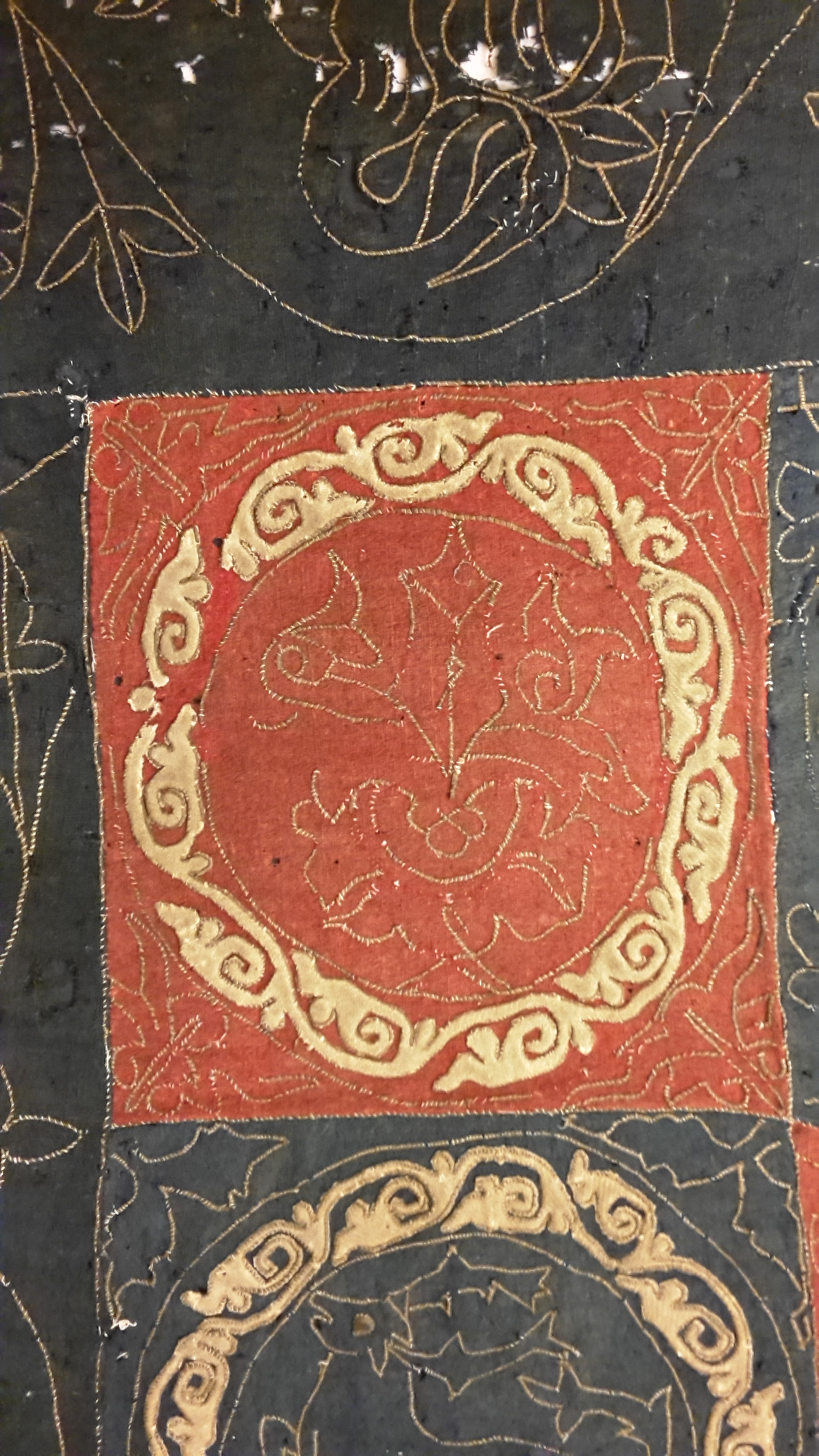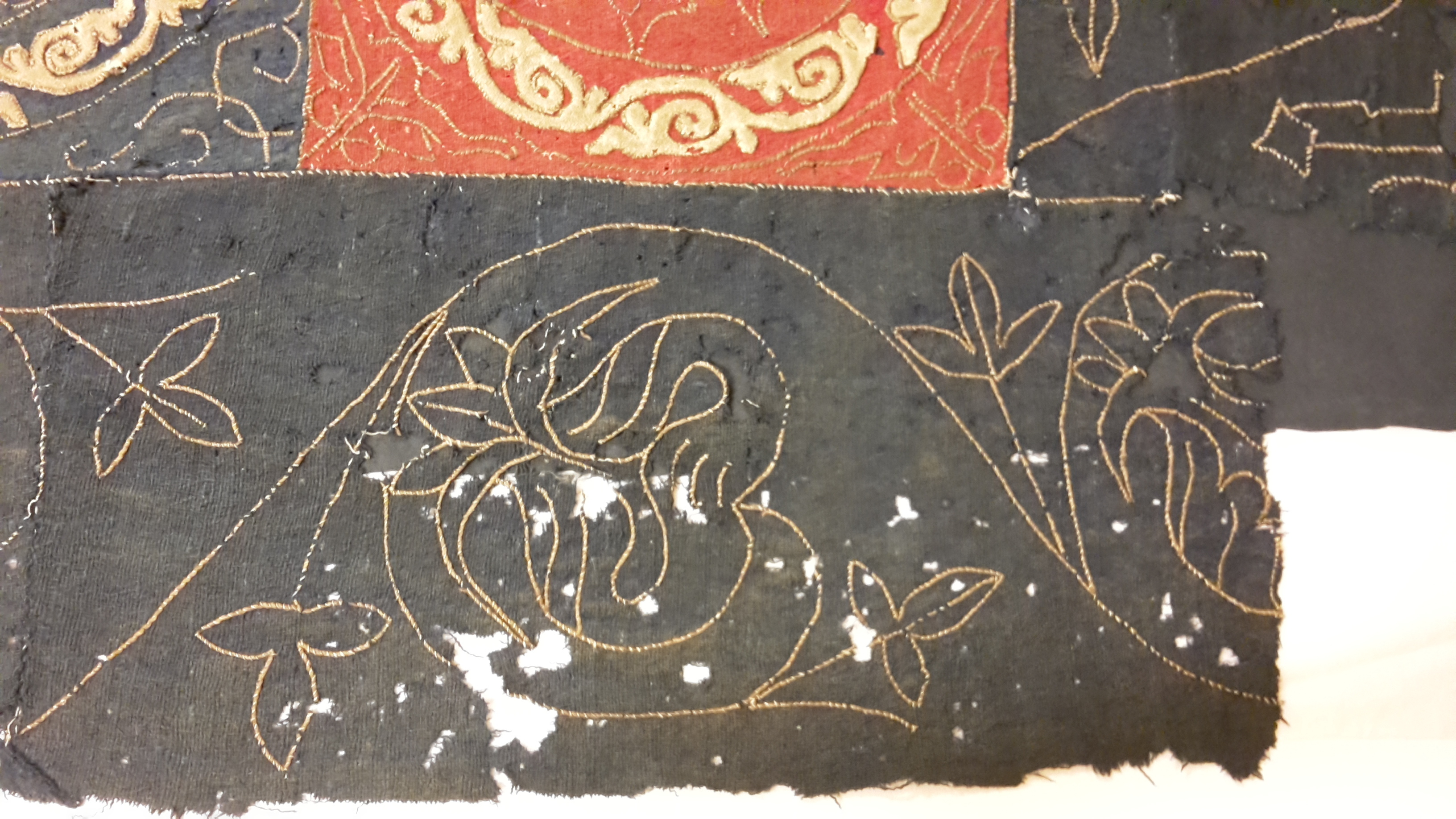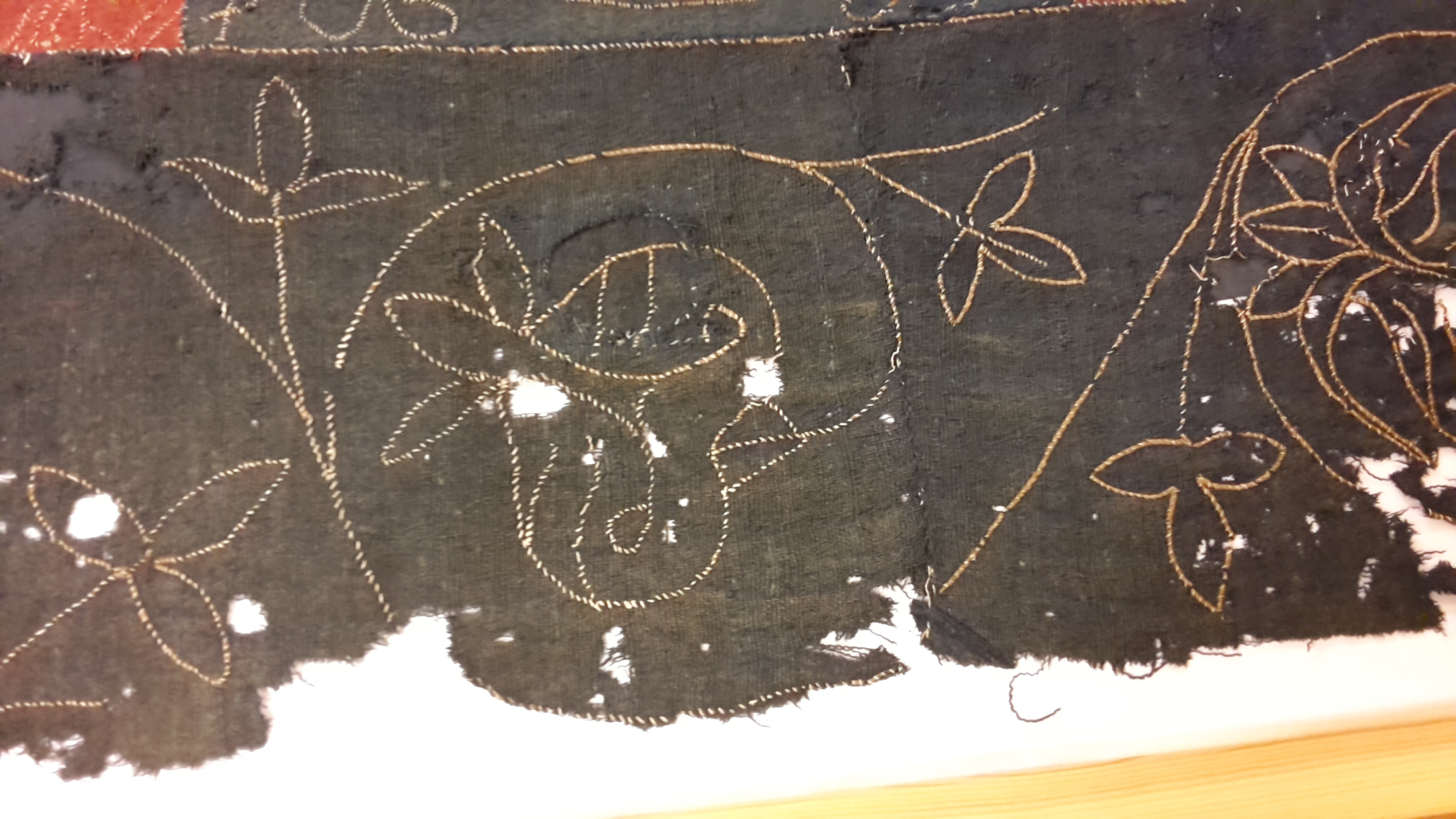 Röd och blå vadmal med 12 kvadrater med figurer i motstående färg, intarsiabroderi med guldskinnsremsor. Blå bård med ranka och tistelblommortecknade i guldskinnsremsor. Stödtyg av blå lärft. Åtkomsthandlingar saknas.