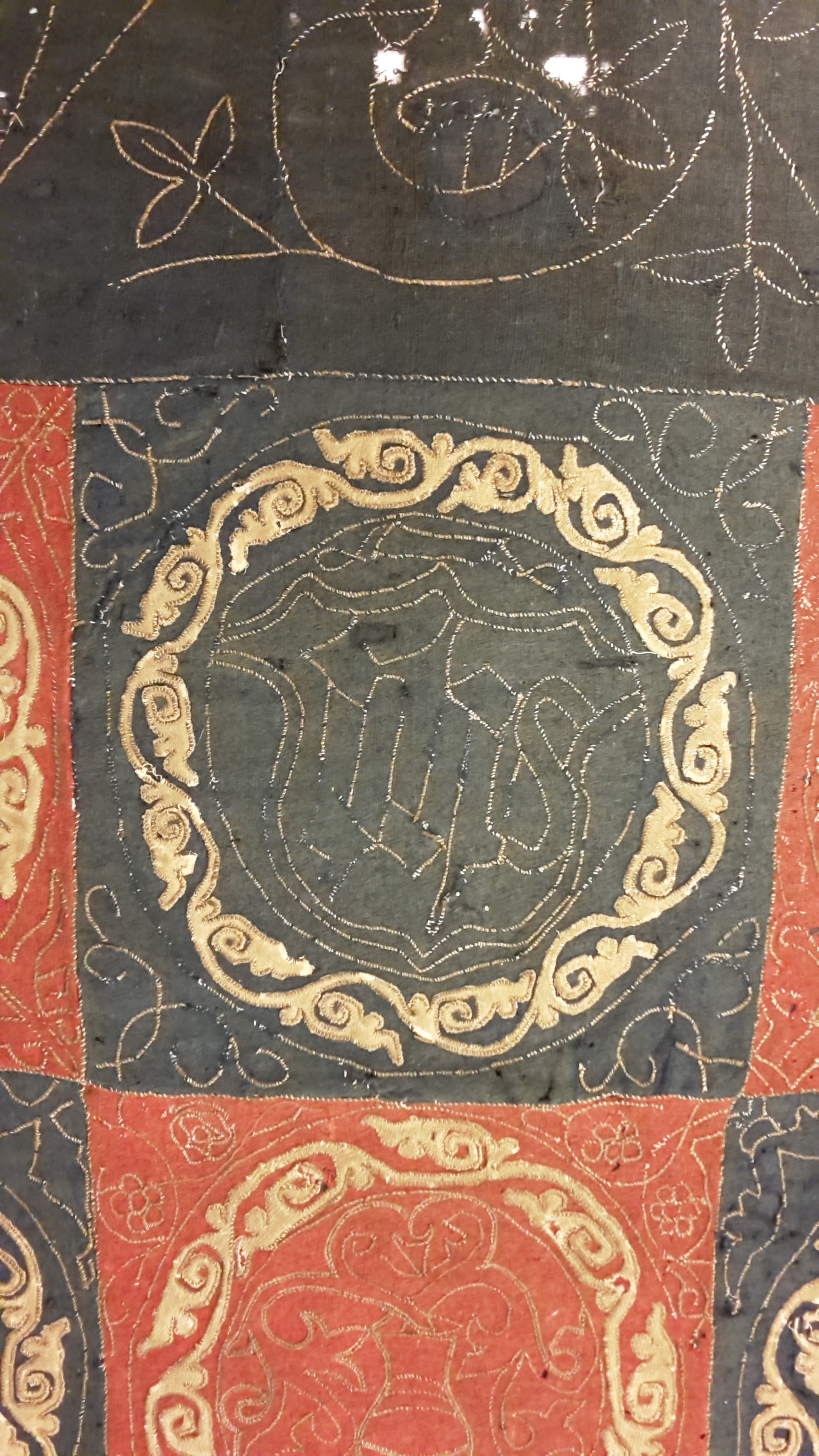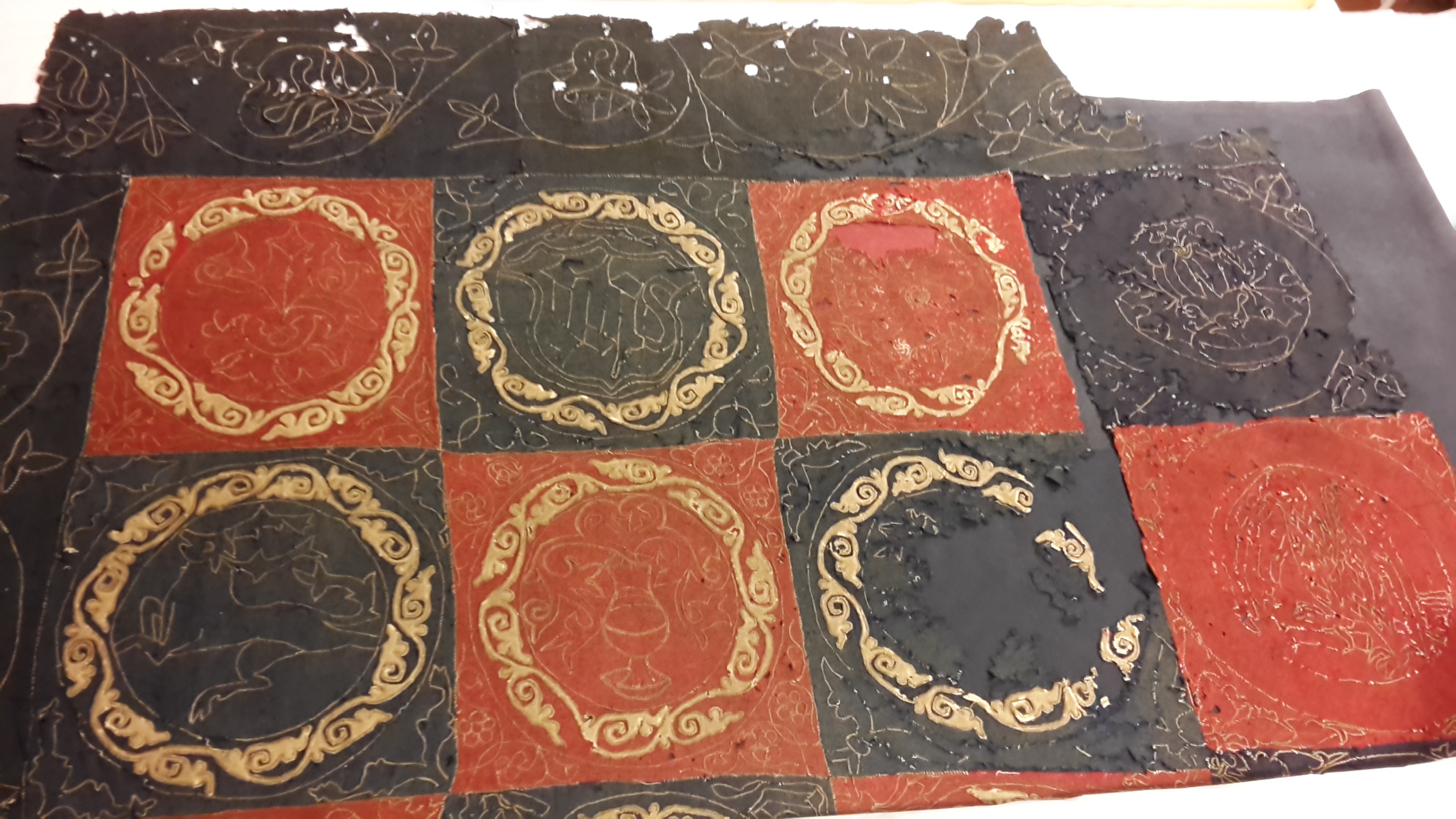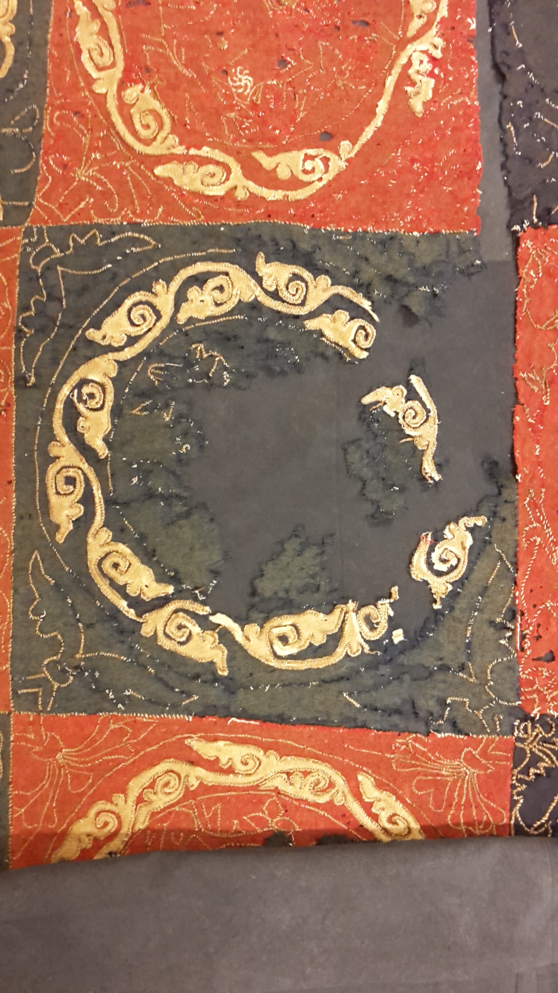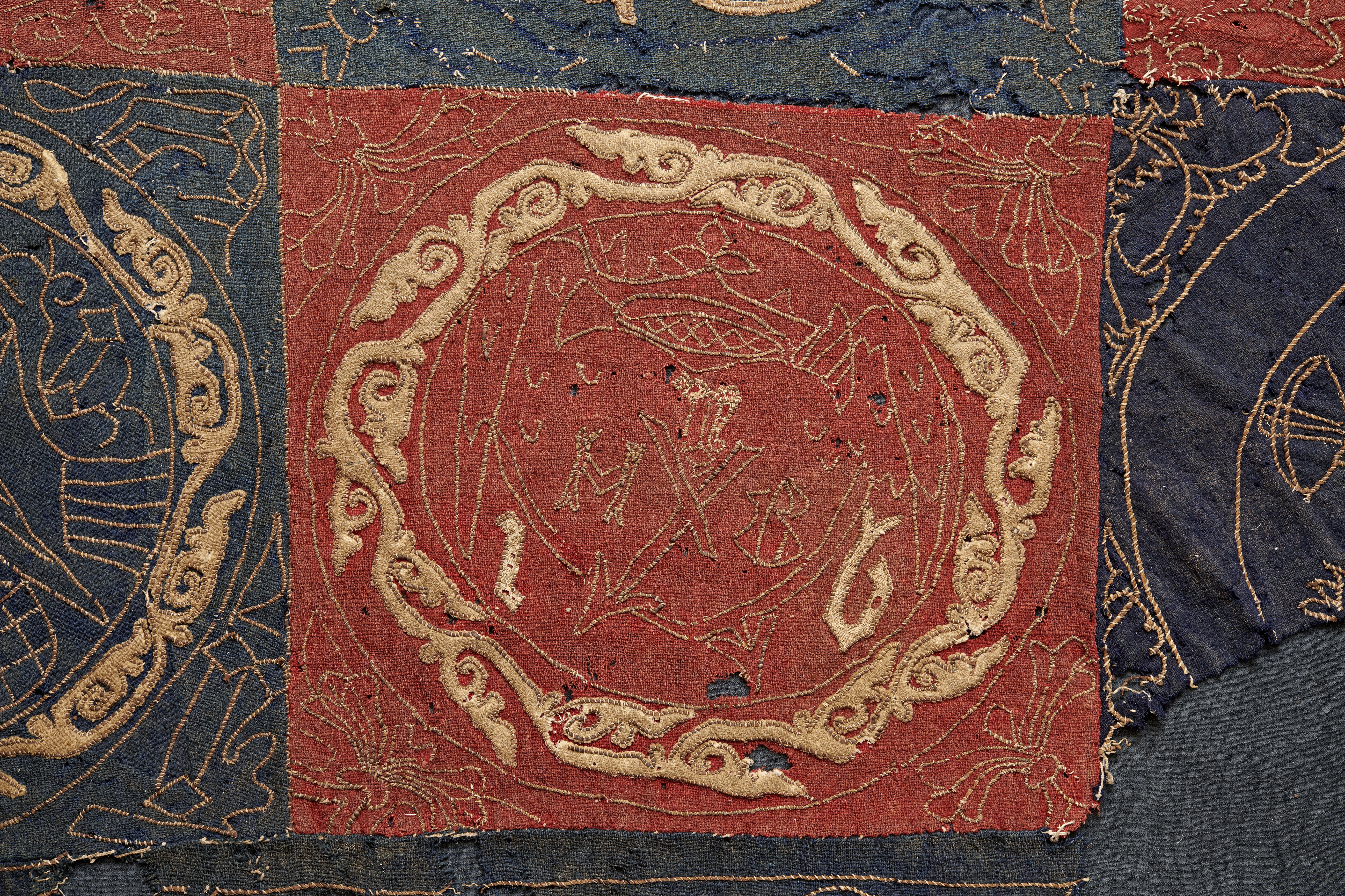 Röd och blå vadmal med 12 kvadrater med figurer i motstående färg, intarsiabroderi med guldskinnsremsor. Blå bård med ranka och tistelblommortecknade i guldskinnsremsor. Stödtyg av blå lärft. Åtkomsthandlingar saknas.