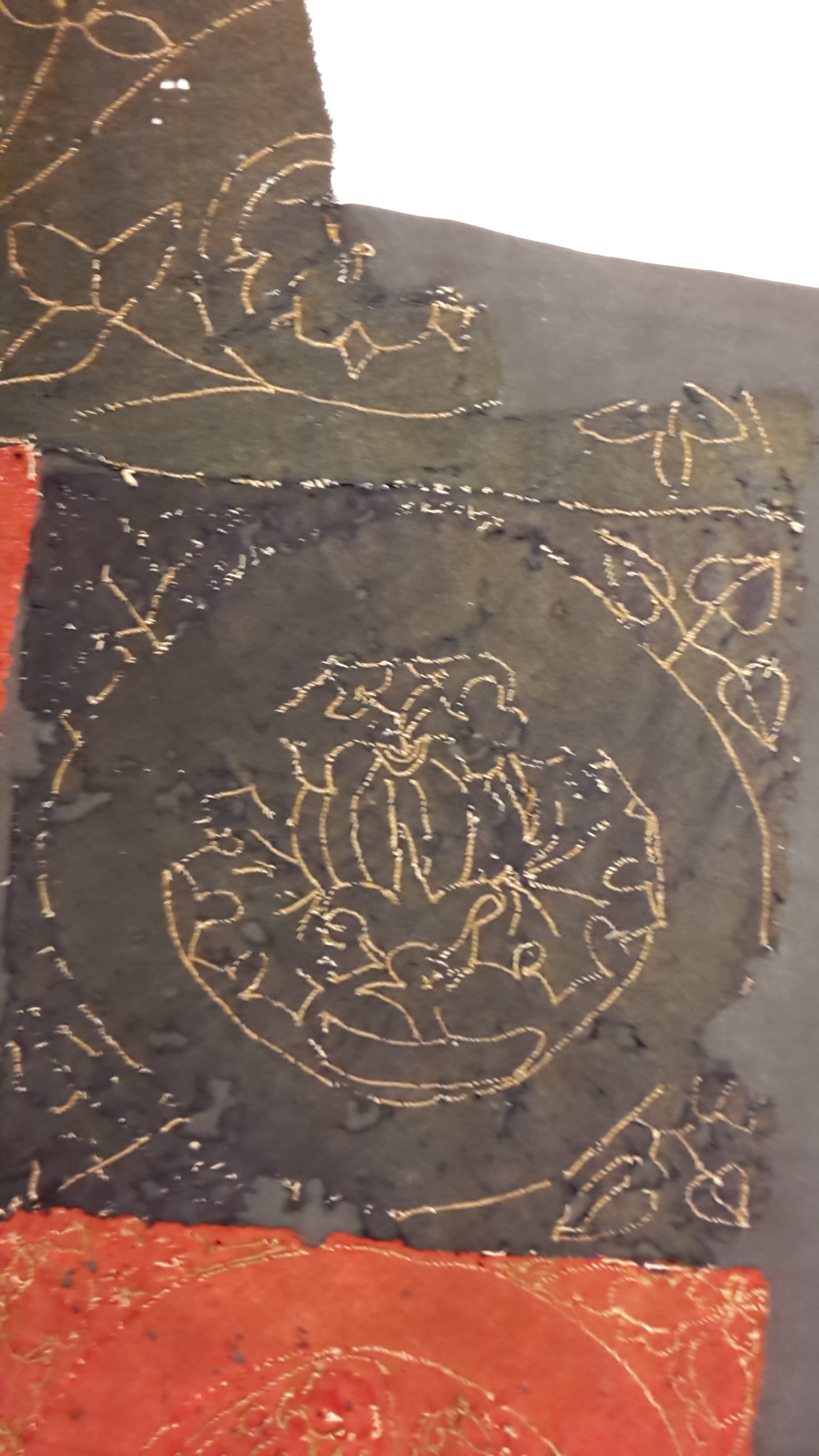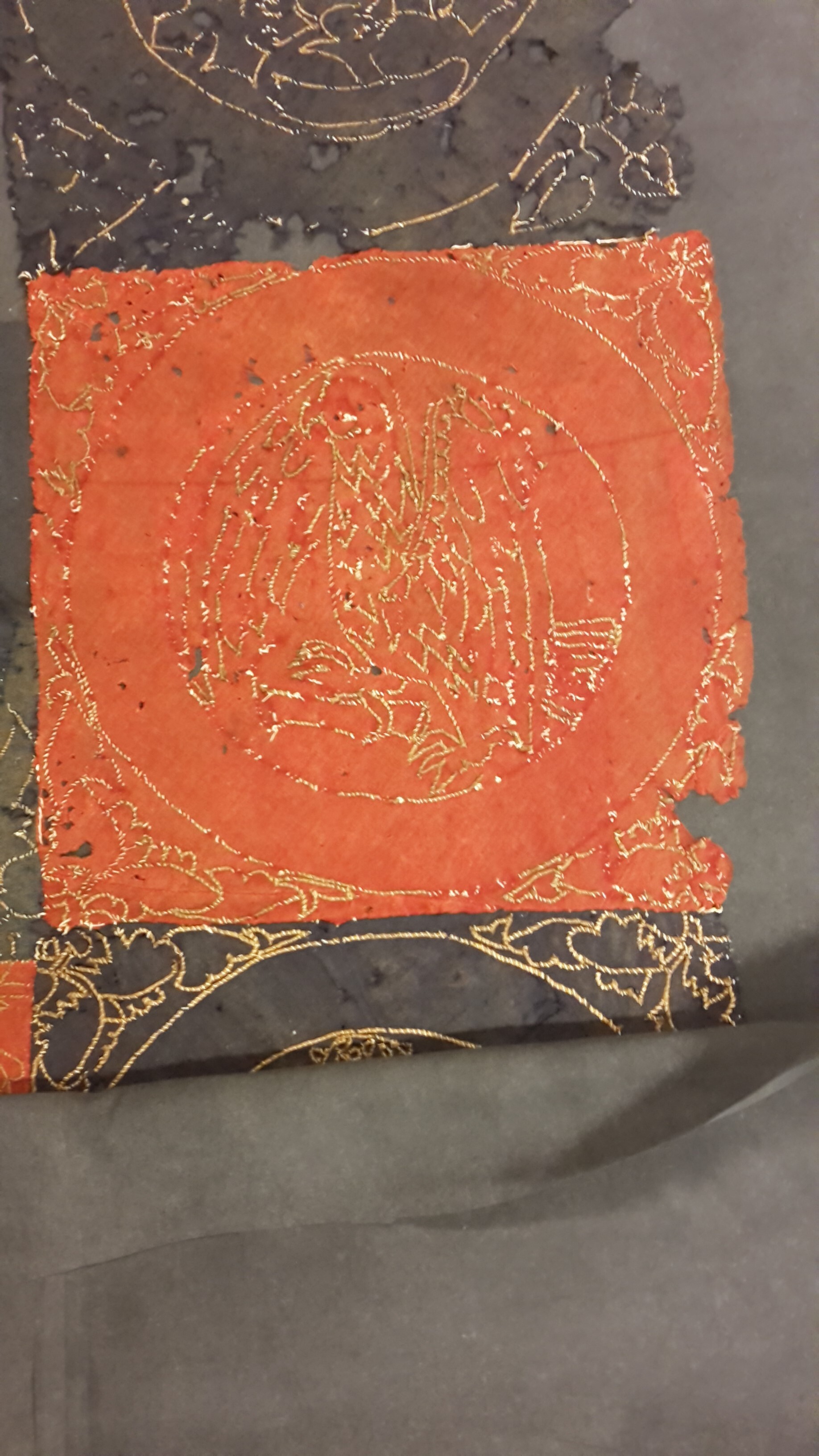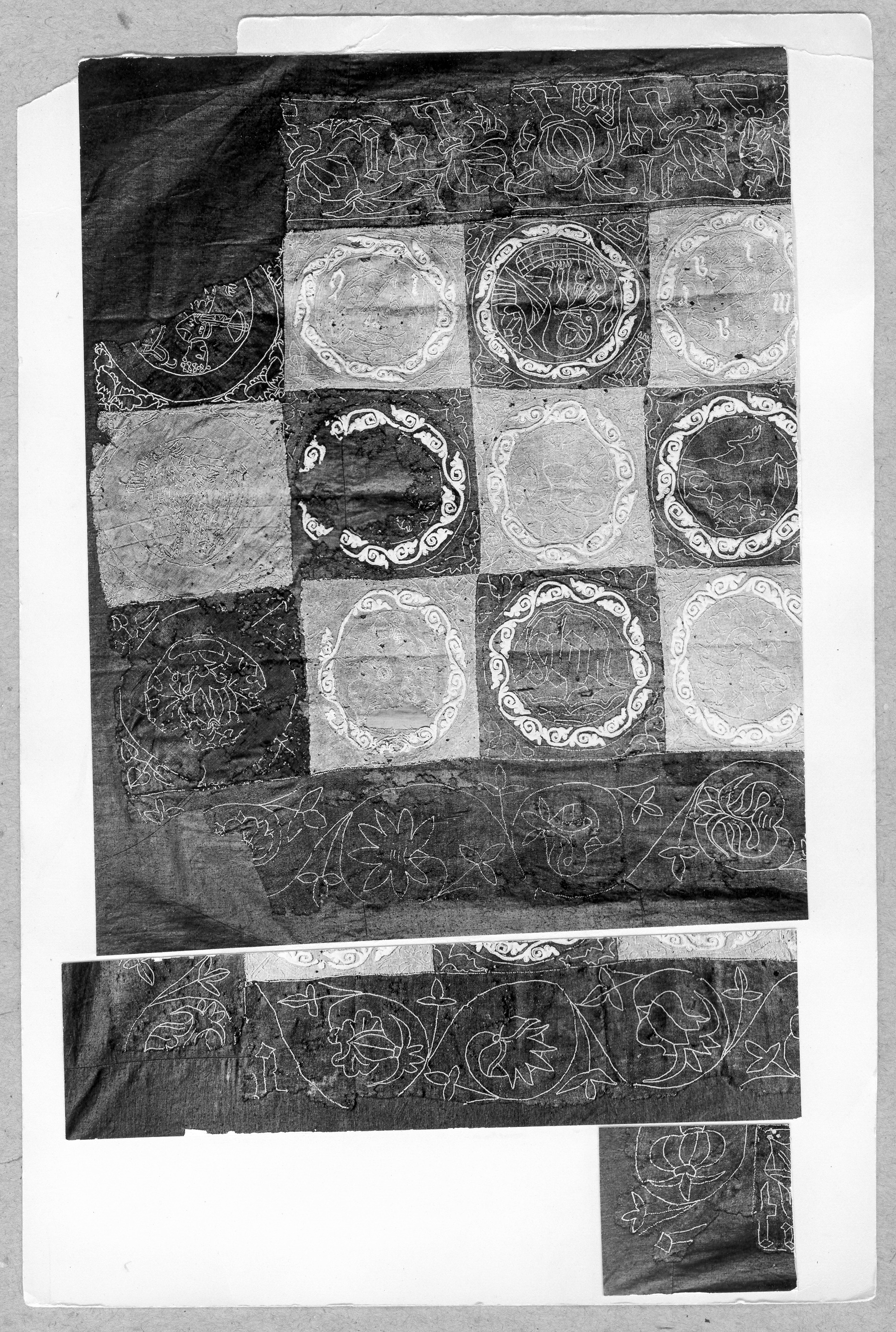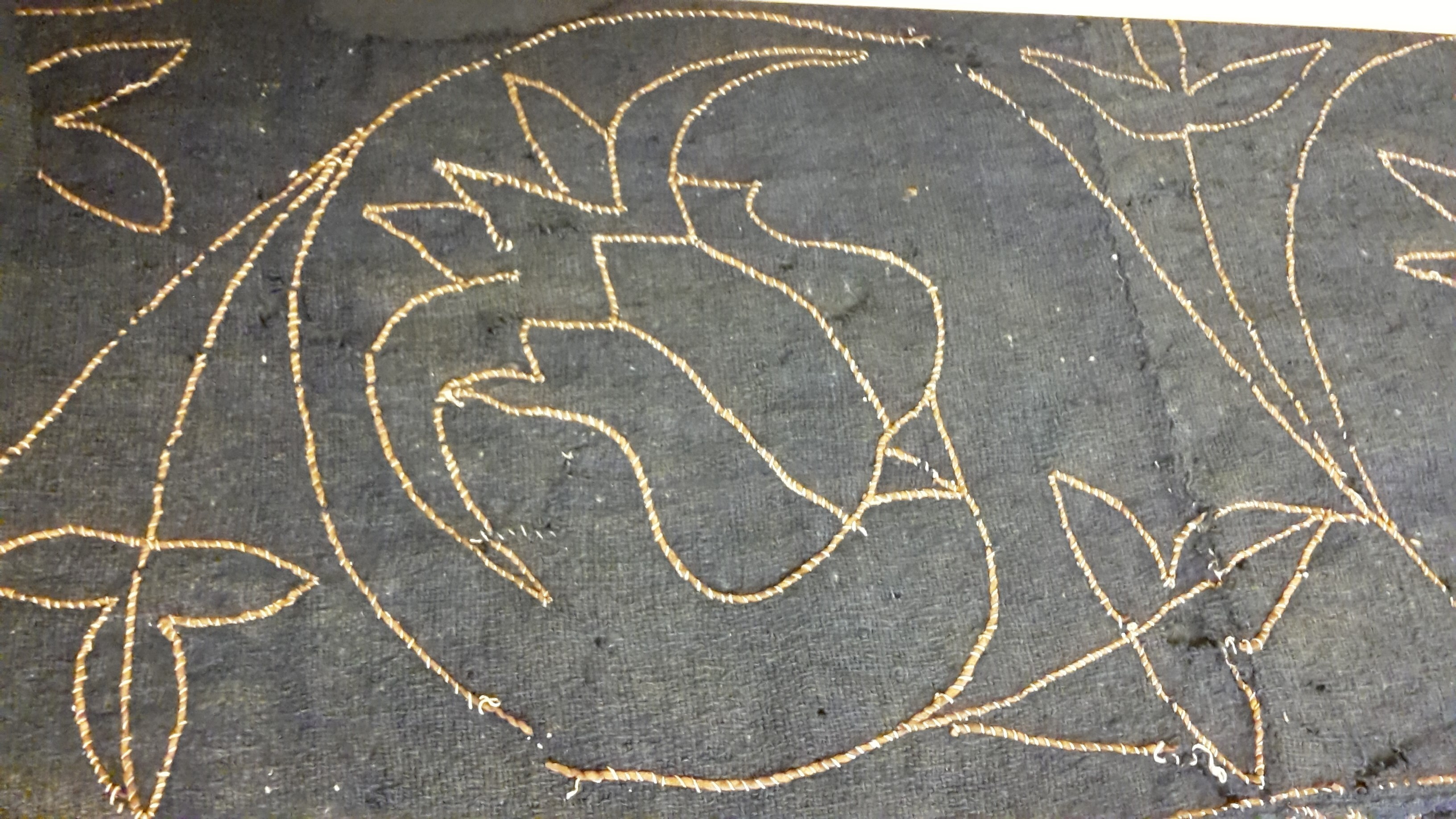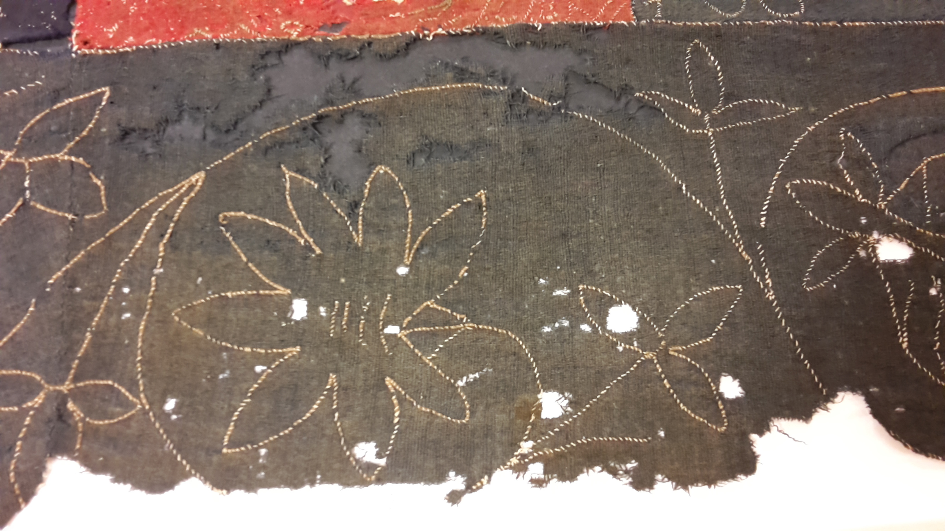 Röd och blå vadmal med 12 kvadrater med figurer i motstående färg, intarsiabroderi med guldskinnsremsor. Blå bård med ranka och tistelblommortecknade i guldskinnsremsor. Stödtyg av blå lärft. Åtkomsthandlingar saknas.