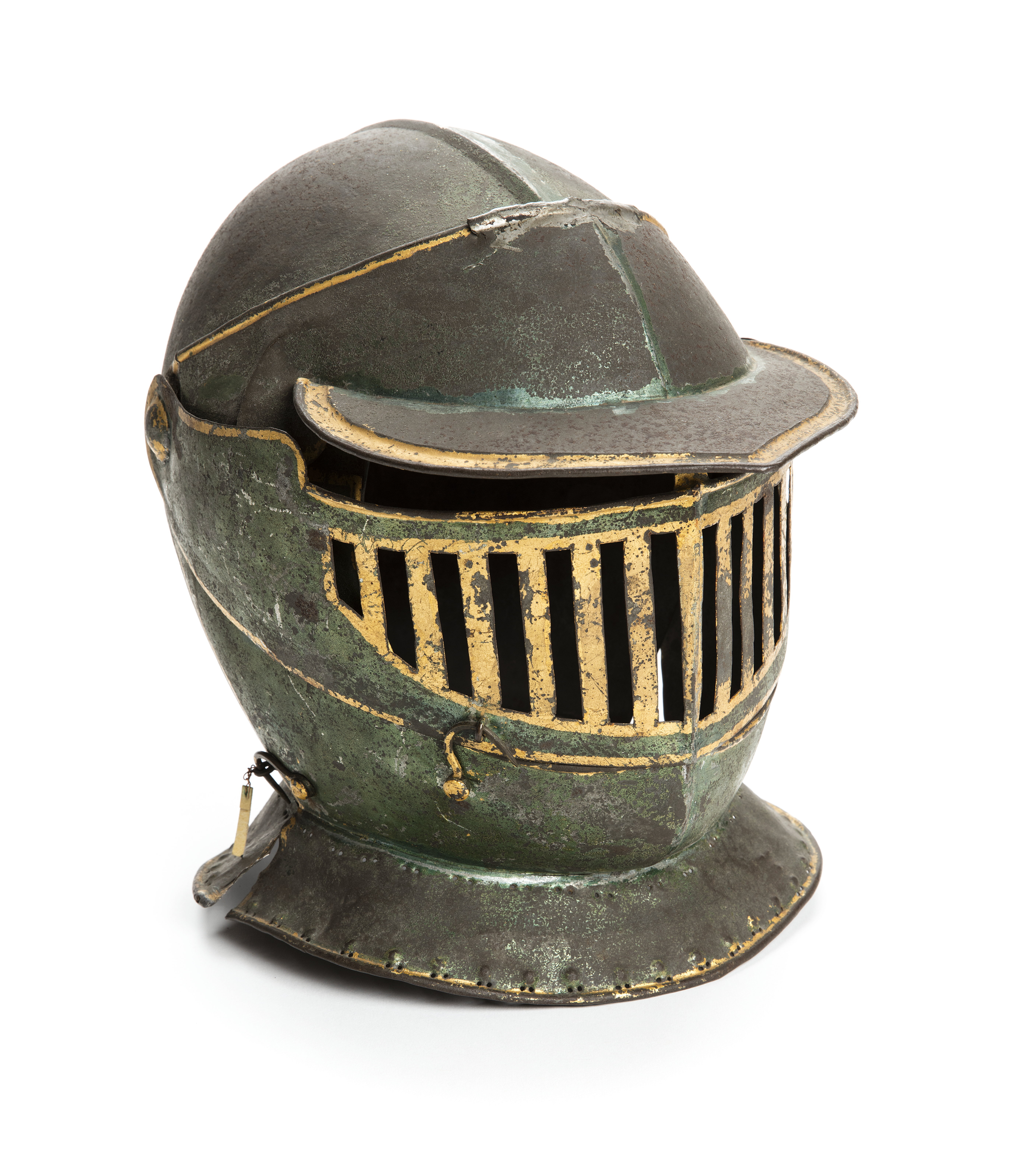 Av bleckplåt, blå/grön lackerad med förgyllda kanter, nitar och visir-galler. Förgylld plymhållare. Använd av någon av riddarna i tornerspelet på Adolf Fredriks torg 1777.