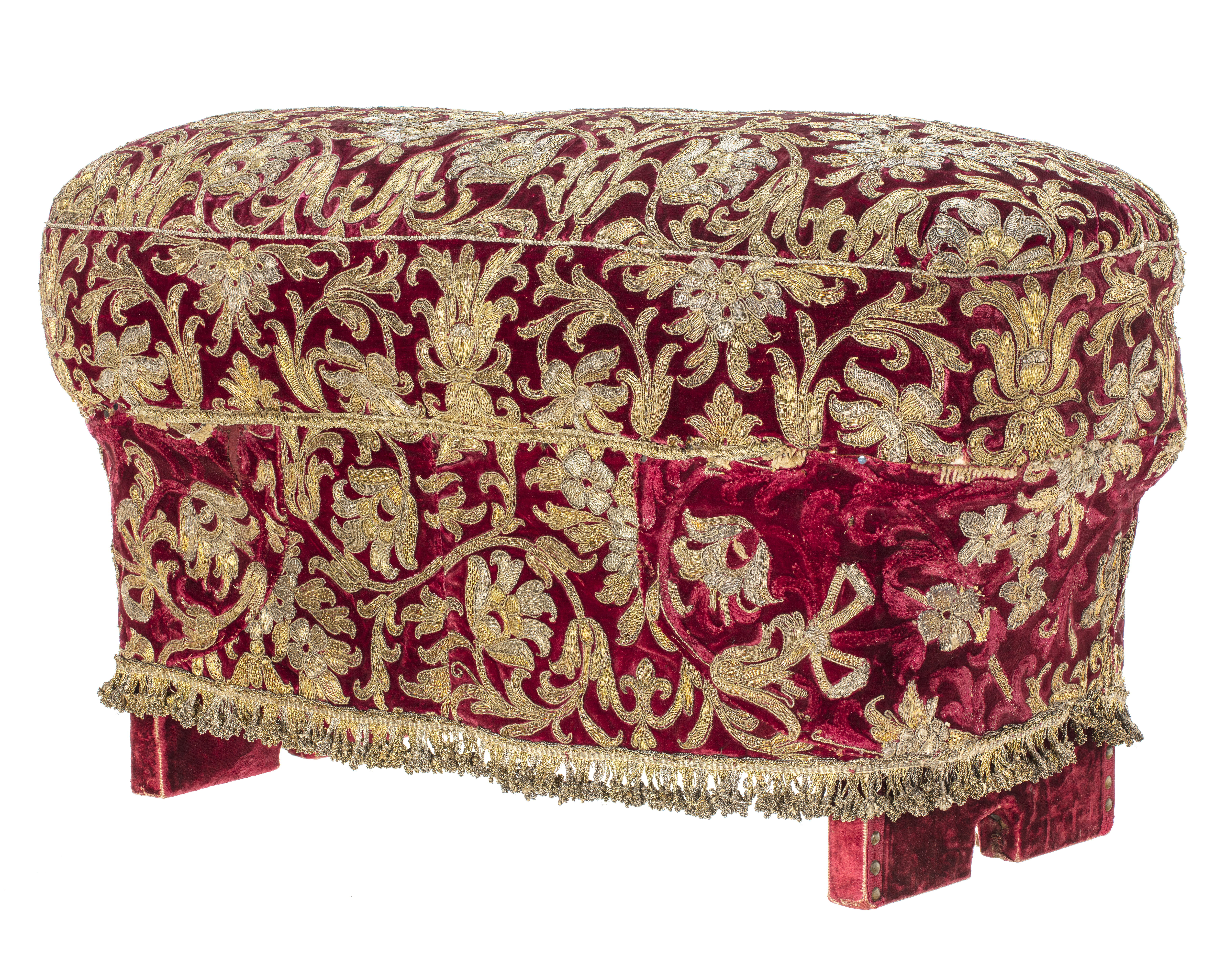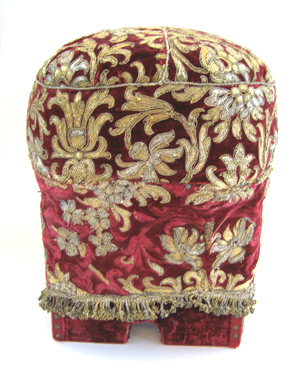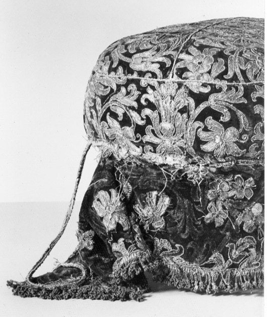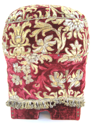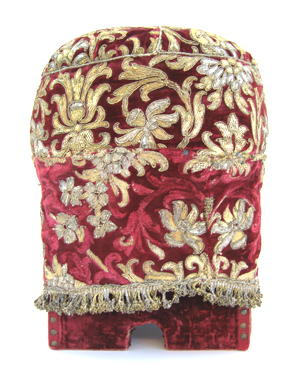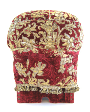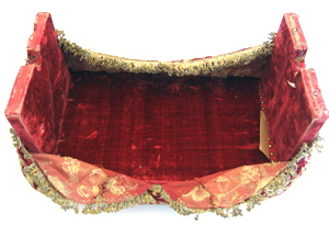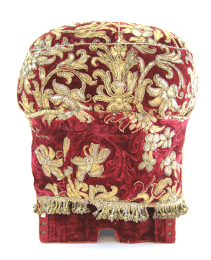- Pall af trä, öfverdragen med rödt sammet samt med vidfästad dyna och treklufvet upslag af do. (rödt sammet); sätet och upslaget äro broderade o guld och silfver samt försedde med små silfver- och guldfransar och en galon af guld och silfver.