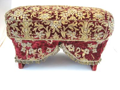 - 1 st kusk pall (hörer till nr 646) af träd med säte öfverdraget med rödt sammet underfodrad med gult Blomerad Damast. Sätet och upslaget med silfver och guld Brodd: samt silfver och guld fransar.