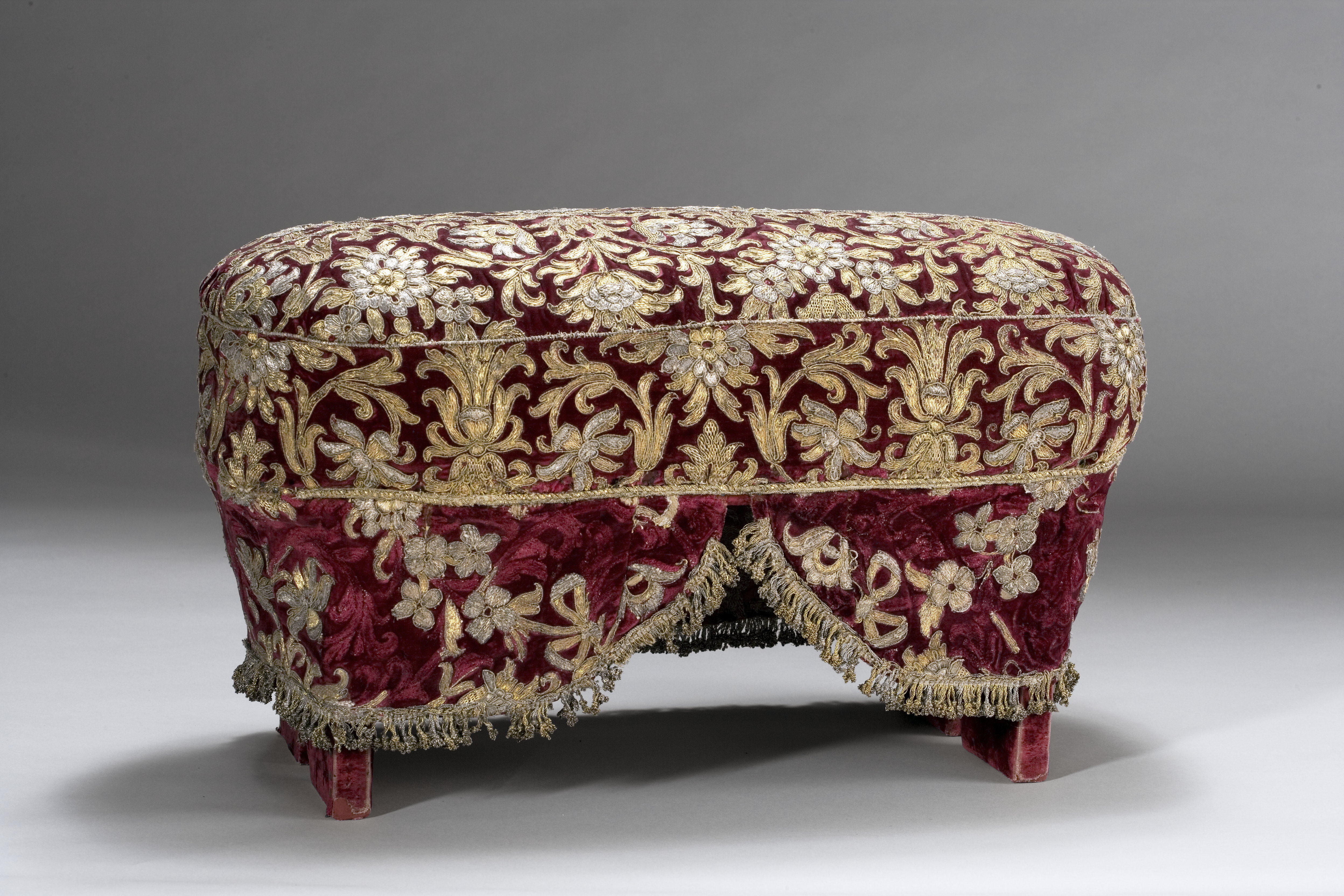 Denna Dyna eller Säte är vid Pallen anslagen med förgylte Krushufvade Mässings Tänlickor uppå en Guld och Silfver Galon -