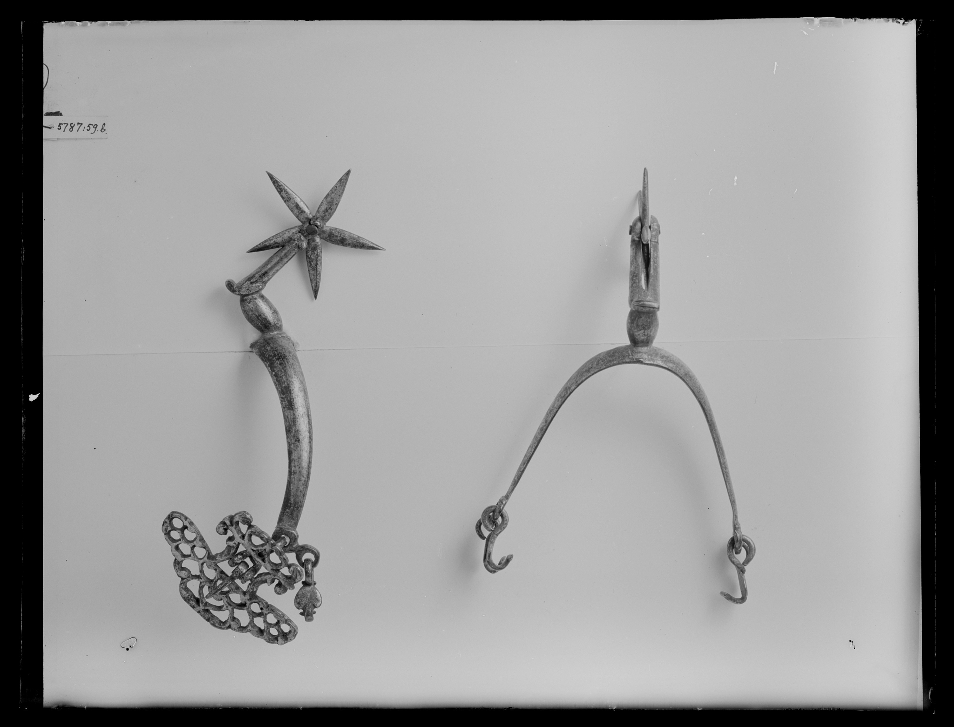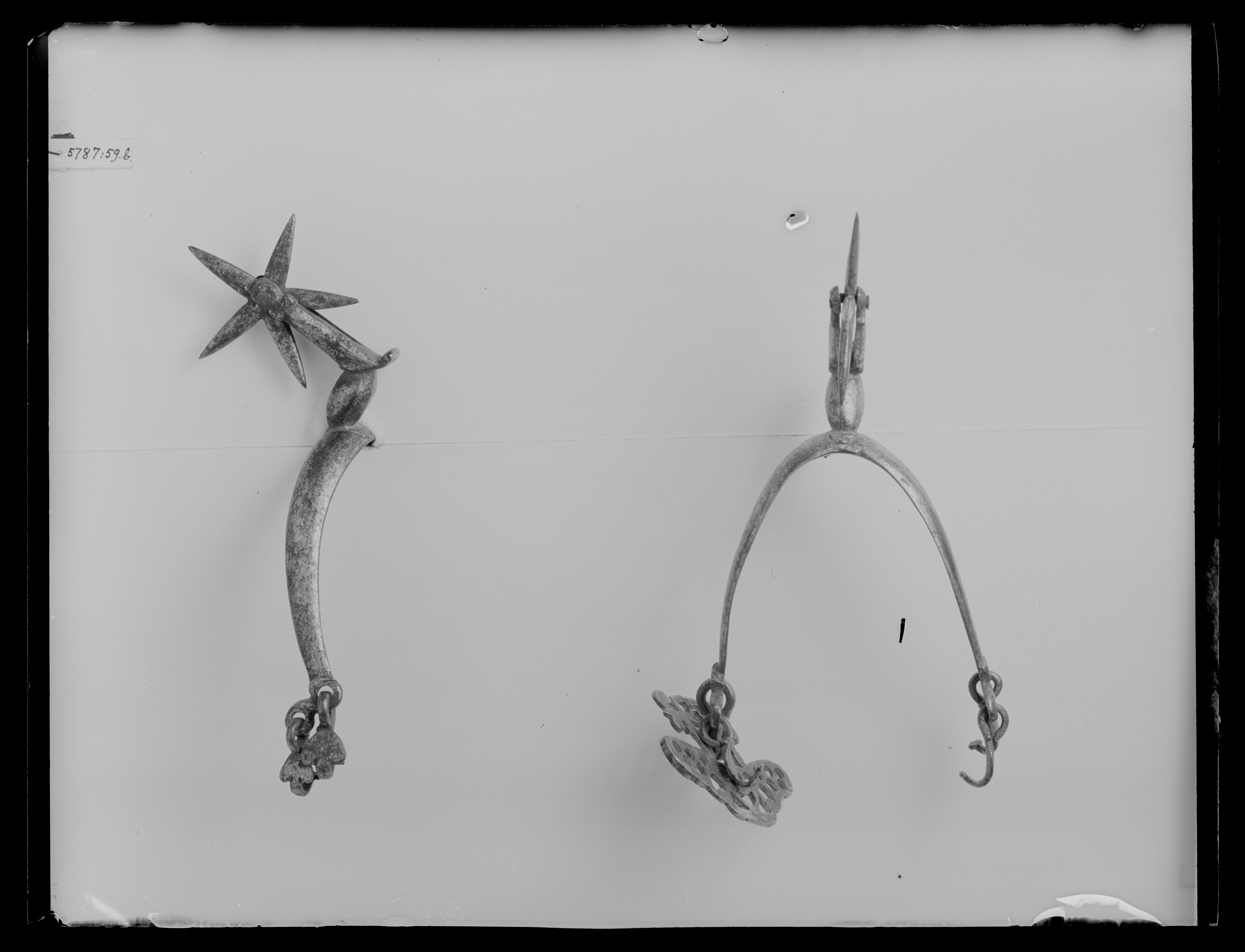 Sporre av förgyllt stål. U-formade något böjda skänklar med konvex utsida. Ändarna böjda med hål, med i ena änden två hakar, i den andra en hake och en avbruten sölja(?). Hals böjd i vinkel, med oval fot. Femuddig klinga.