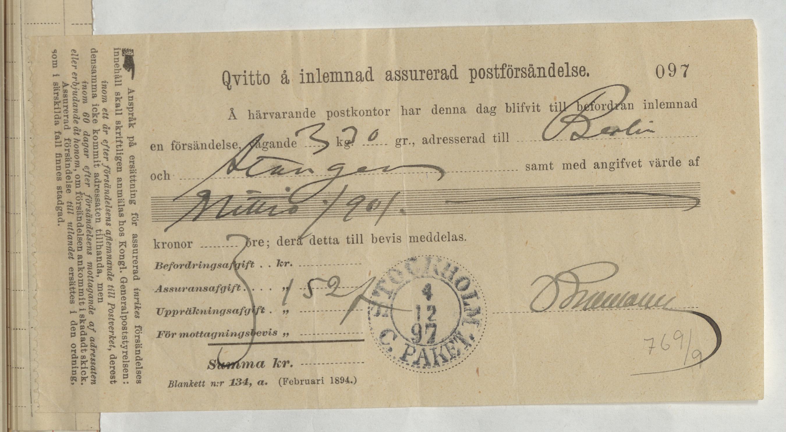 Kvitto på inlämnad assurerad postförsändelse