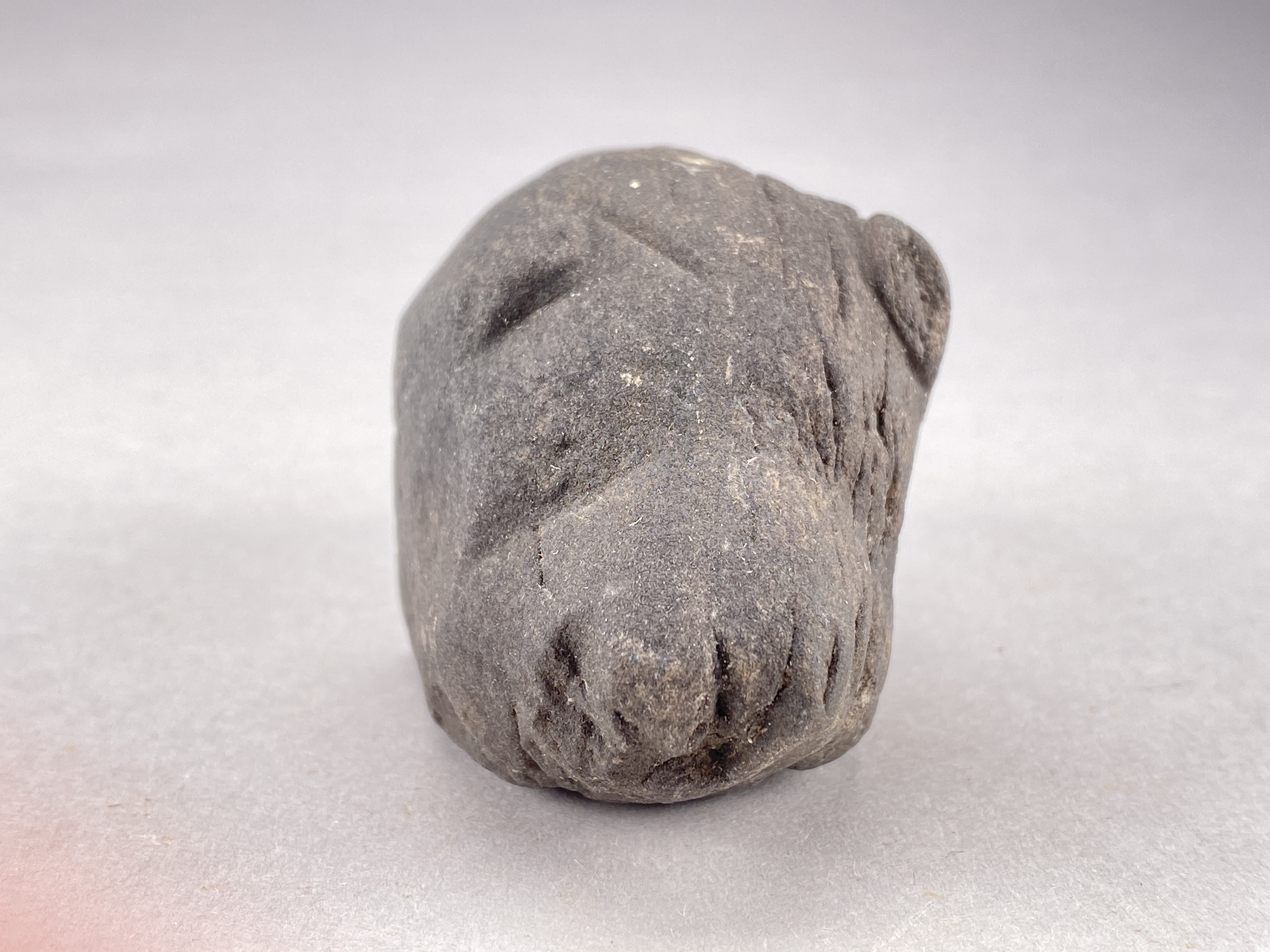 Bryne av sandsten i form av ett skulpterat björnhuvud.