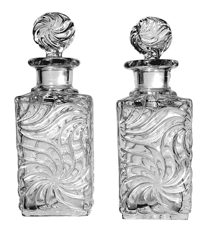 FLASKOR (toilett-), 2 st, med propp Av färglöst glas, blåsta fast i form. Fyrsidiga, med tvärt indragen skuldra, kort cylindrisk hals med starkt utstående mynningskant samt skålig botten. Dekor: I relief. På sidorna ett sammanhängande virvelmönster med blomliknande virvlar. Proppar gjutna, koniska, med sfärisk knopp. Knoppen i dekor som flaskorna. Höjd: 14 cm; utan propp, höjd: 10,8 cm; sidbredd: 5,3 cm Propp, höjd: 5,2 cm; diameter: 3 cm Inköpta av Wilhelmina von Hallwyl på 1880- eller 1890-talet hos en handlande i Stockholm.