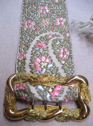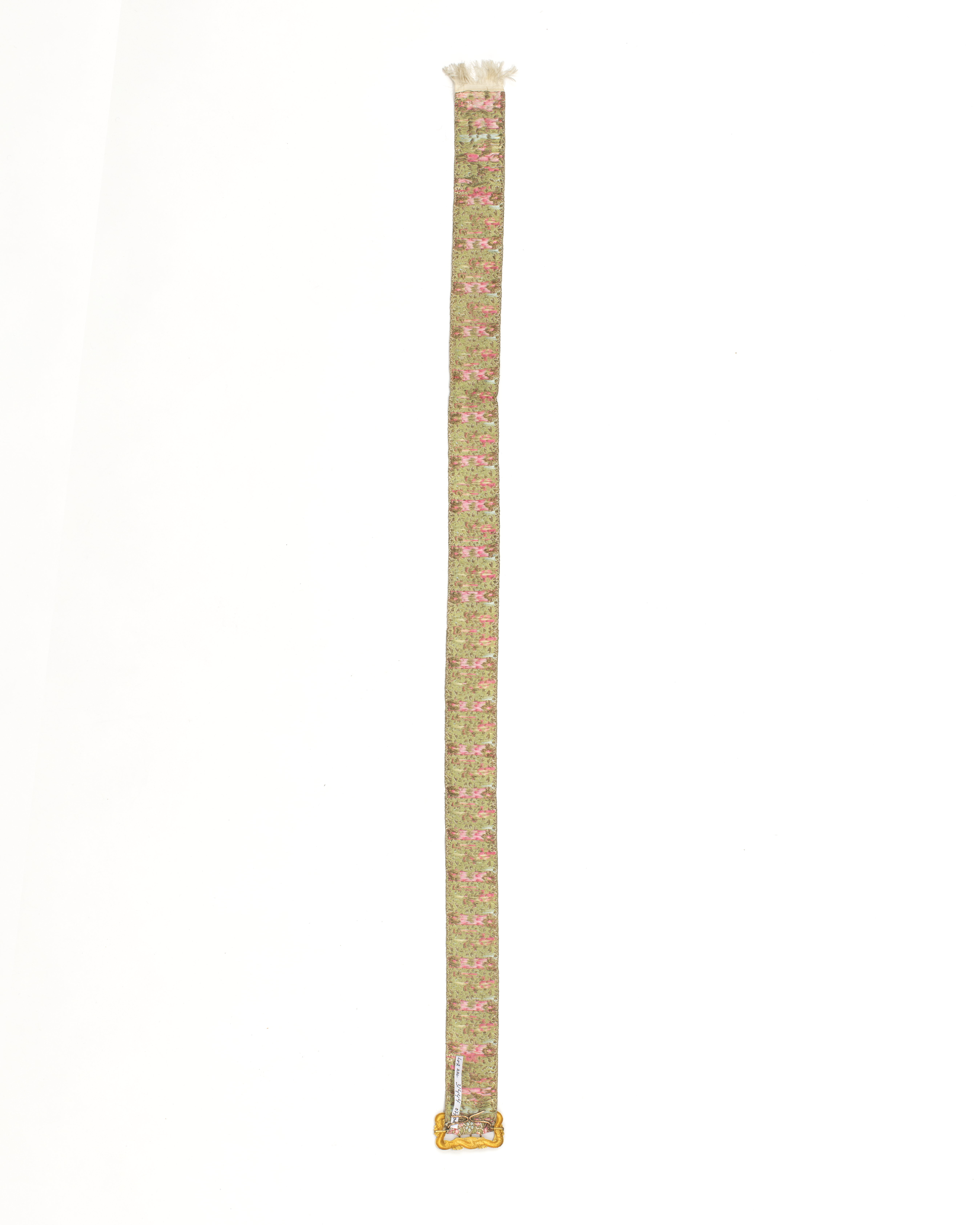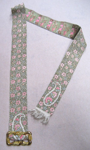 Skärp i siden med invävt blomstermotiv. Beige grund med gröna blad med guldkant och blommor i rosa, gult och blått. I båda ändar finns en broderad, längsgående droppformad kontur i beigefärgat silke, längd: 75 mm, bredd: 30 mm. Skärpet är ofodrat. Rektangulärt guldfärgat spänne med rundade hörn i form av en slingrande orm som biter sig i stjärten, samt västslingor. Spännet har tre nålar och ett kopparfärgat X-format fäste på baksidan. Spännet mäter i bredd: 65 mm, och höjd: 35 mm. På skärpets motsvarande kortände fortsätter textilen ut i en franskant, 20 mm bred.