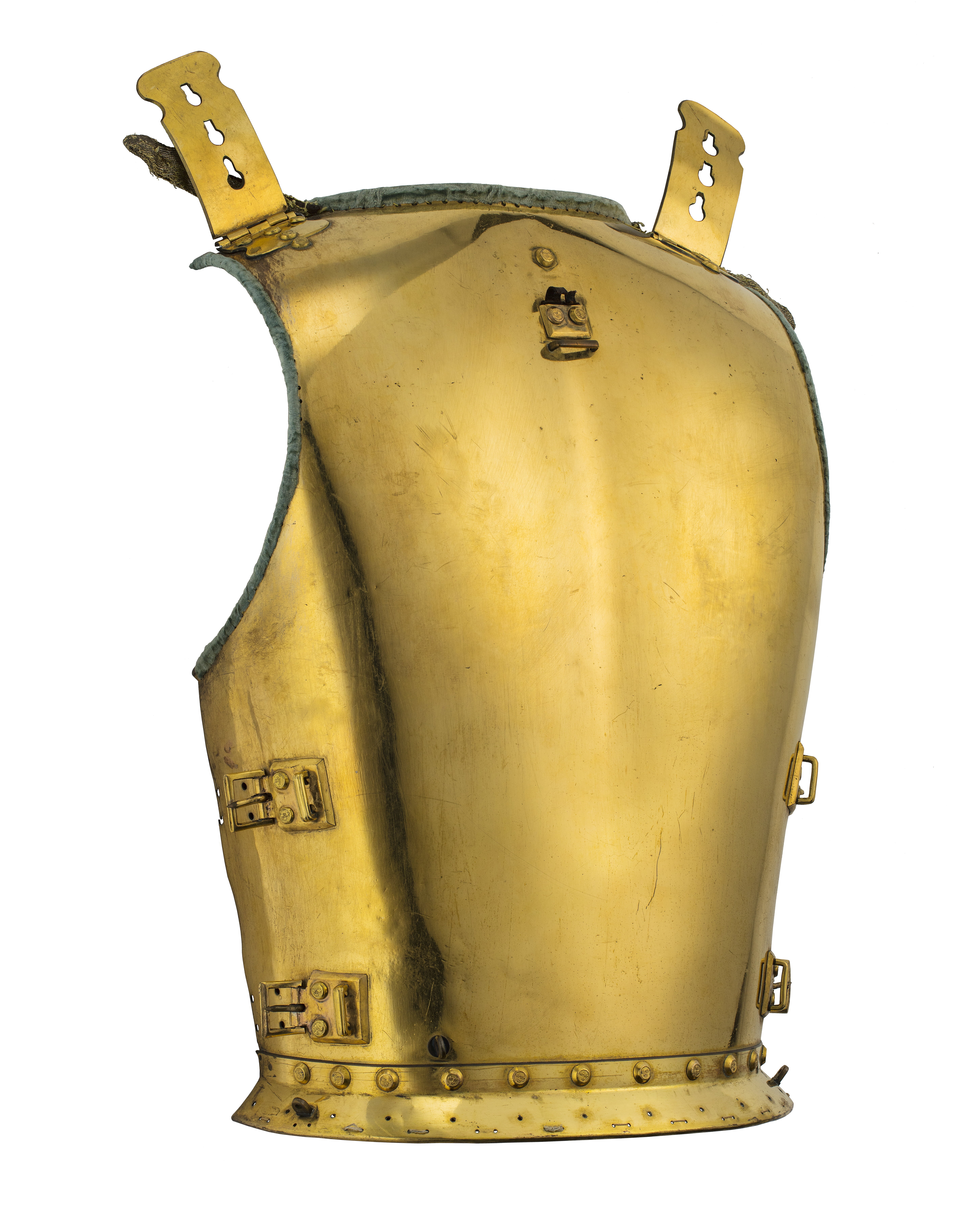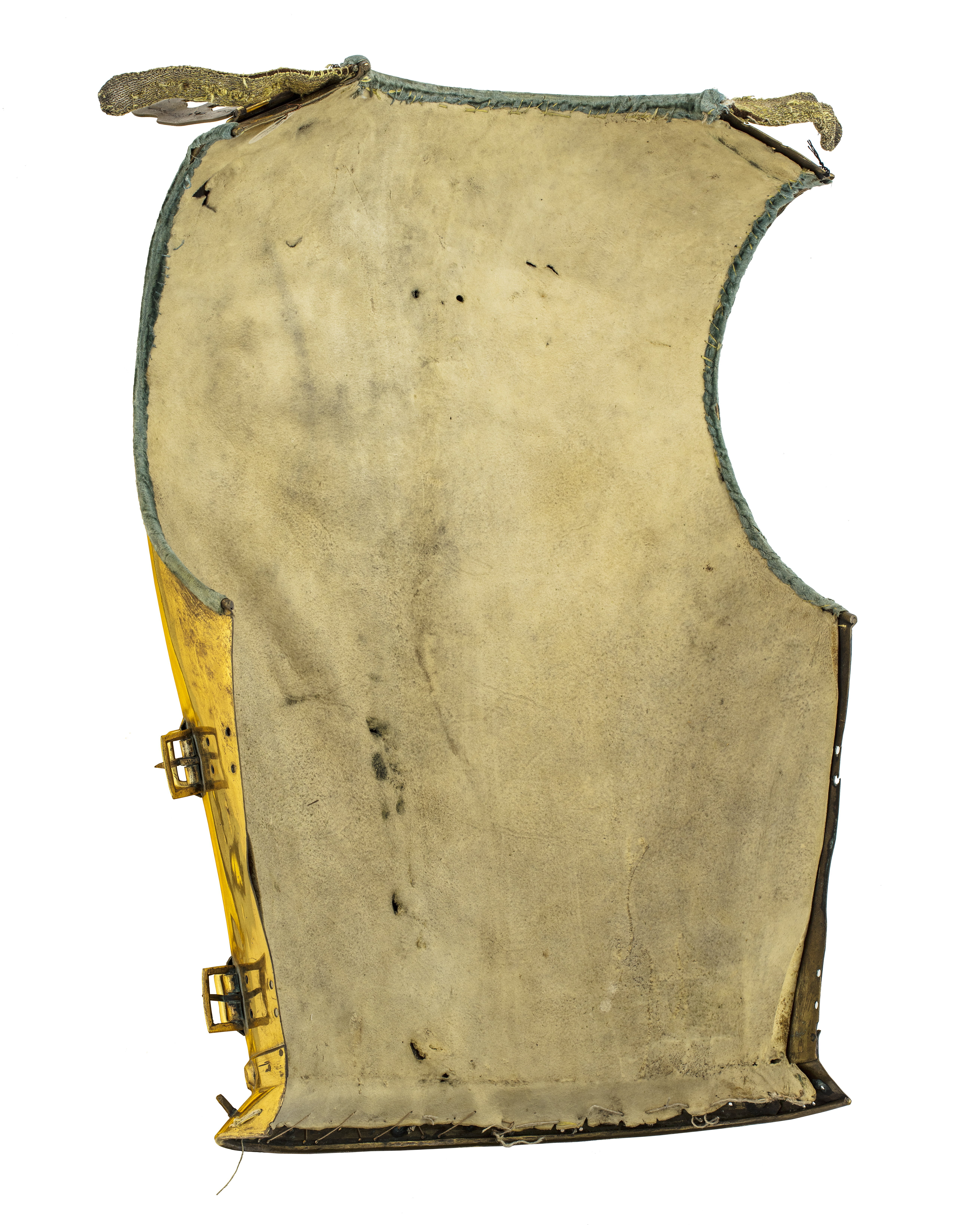 Av förgylld mässing. Upptill mässingsspänne - för fästande av hjälmen. På axlarna läderremmar, klädda med blått siden och guldgalon för fästande i axelstyckena. Blå sammet kring hals och armhål. Foder av vitt tyg.