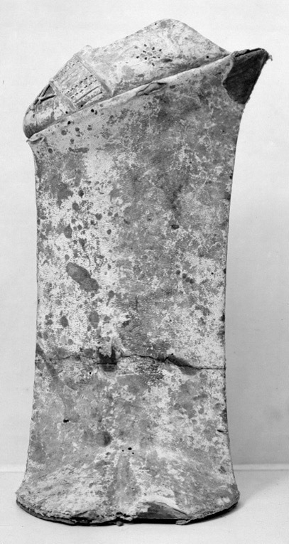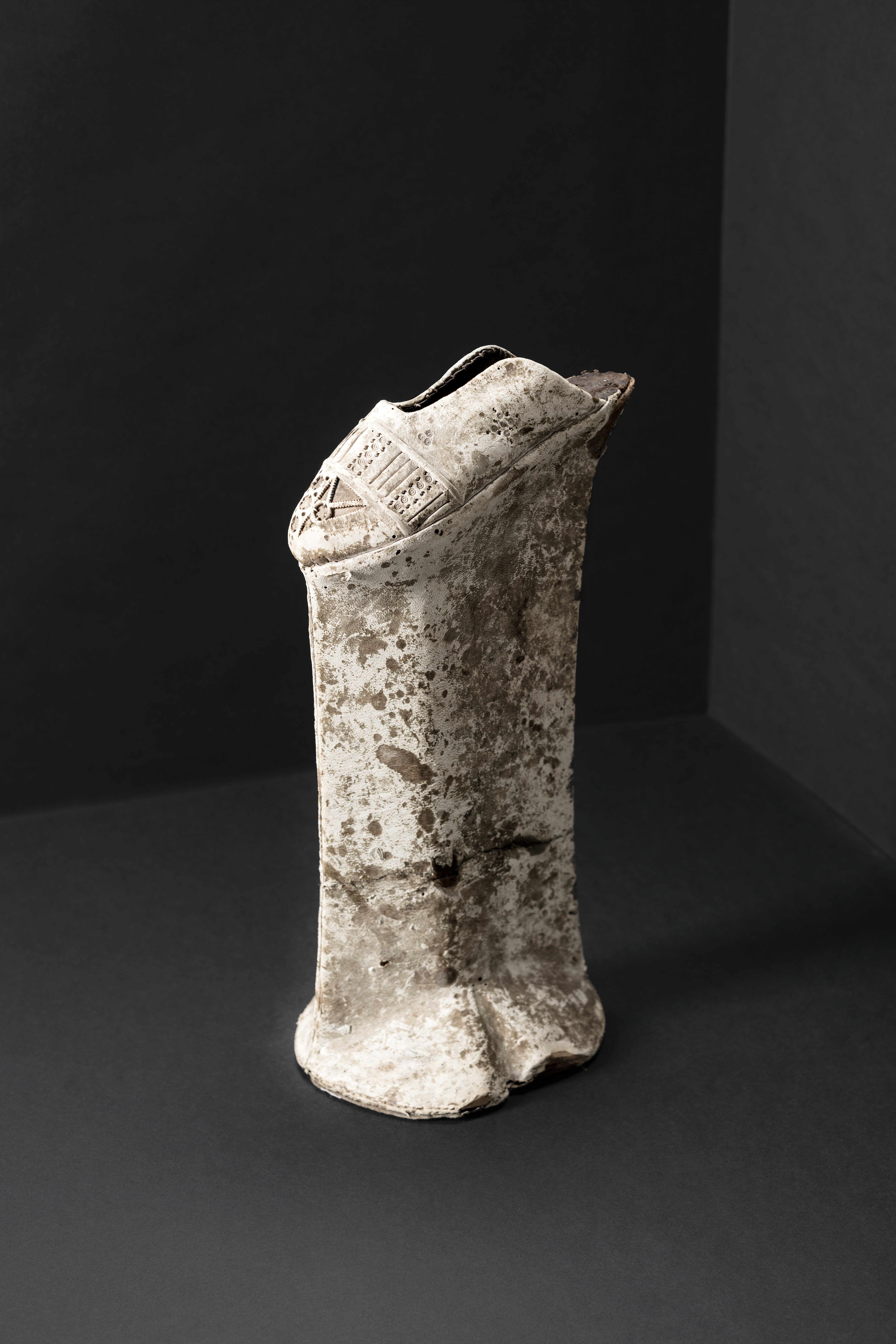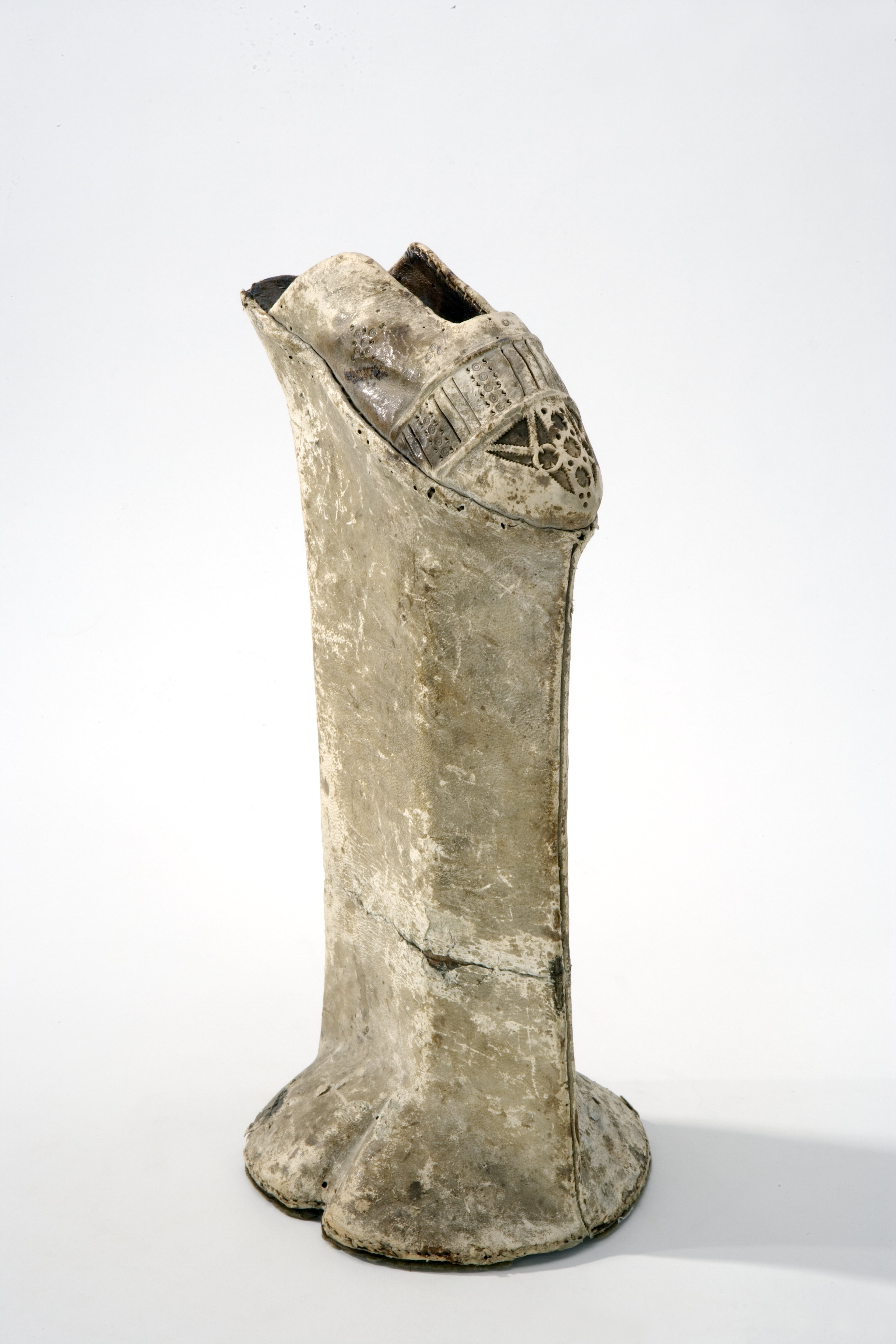 Från Italien från ca 1600. Motsvarar idag storlek 29 cirka. Styltskor, även kallade chopine, var egentligen en galosch som användes tillsammans med en lågsko. Skon består av en 365 mm hög träställning klädd med benvitt skinn. Ställningen har söm mitt fram och bak. Den ovalt utvidgande fotplattan är täckt med en brun lädersula och ytterst filt. På ställningen är i sluttande plan en toffelliknande sko fastsydd. Damtoffeln består av ovanläder, som går upp över vristen. Ovanläder av benvitt, styvt läder är dekorerat med inskärningar, uthuggningar och instansade mönster. Toffeln är fodrad med mörkbrunt läder. Ovanläder och foder har sytts samman med beige linnetråd i toffelns ringning. Beige tyg har lagts under den utskurna dekoren. Tvärs över tån går en mönstrad rand en typisk italiensk utsmyckning som varar in på 1600-talet. I 1720 års inventarium upptagen som "en toffel mycket hög". I en senare inventarieförteckning står det " en sko för en låghalt person".