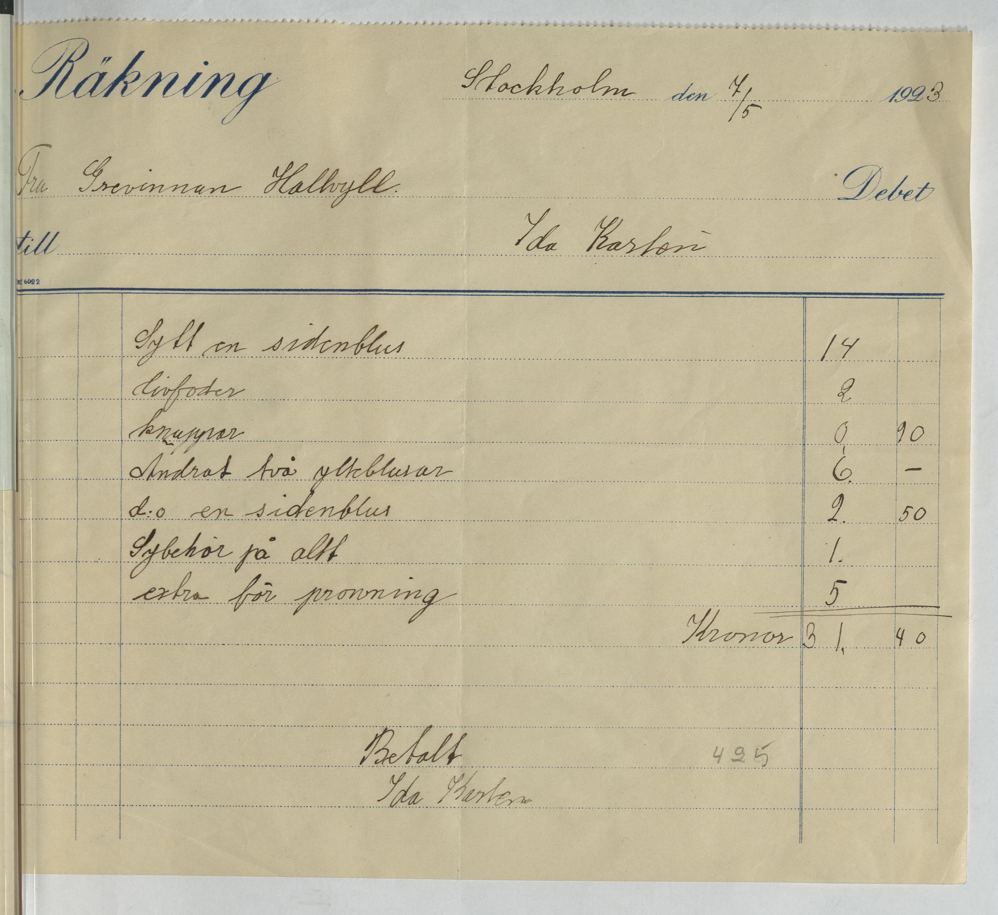 Kvitto från Ida Karlén, sömmerska. Bland annat gällande betalning för en uppsydd sidenblus. Stockholm, 1923.