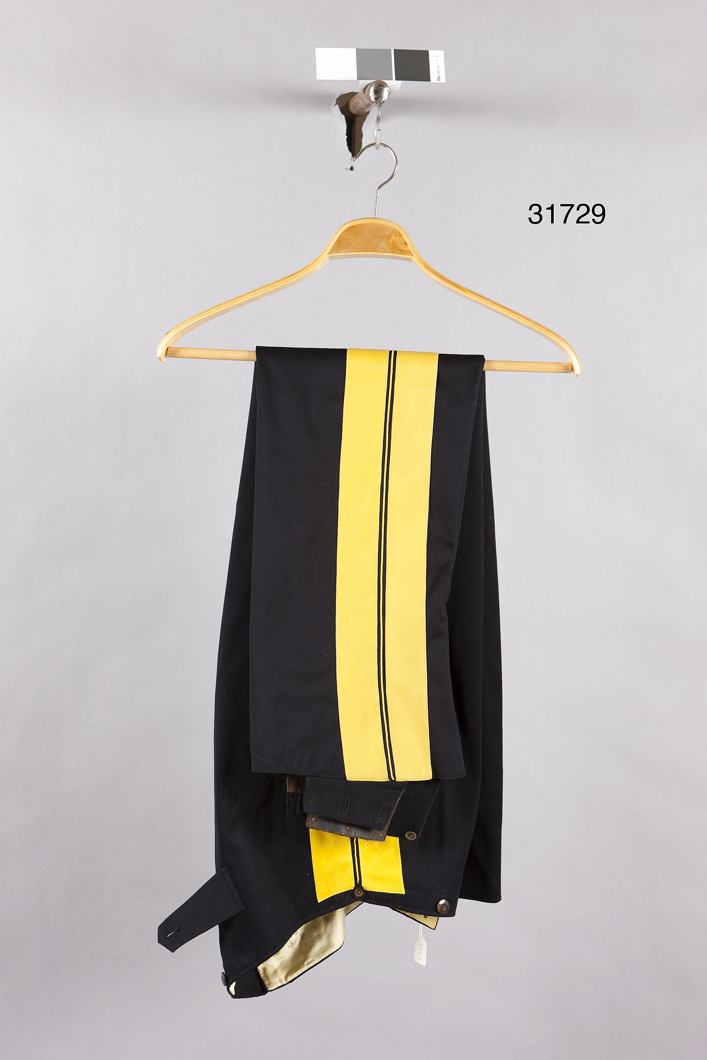 Långbyxor av mörkblått kläde. Rak modell, knäppta med gylf med 4 små svarta knappar, diam 100 mm. På linningen en större, likadan svart knapp, diam 150 mm. Utmed sidsömmen 45 mm breda guldrevärer med en mellanliggande 3 mm bred list. I grenen i sytt två ca 200 mm långa kilar, den högra skarvad av två tygbitar. Byxbenen är fållade nedtill och försedda med hällor med tre knapphål vardera. Hällorna knäppes underifrån.