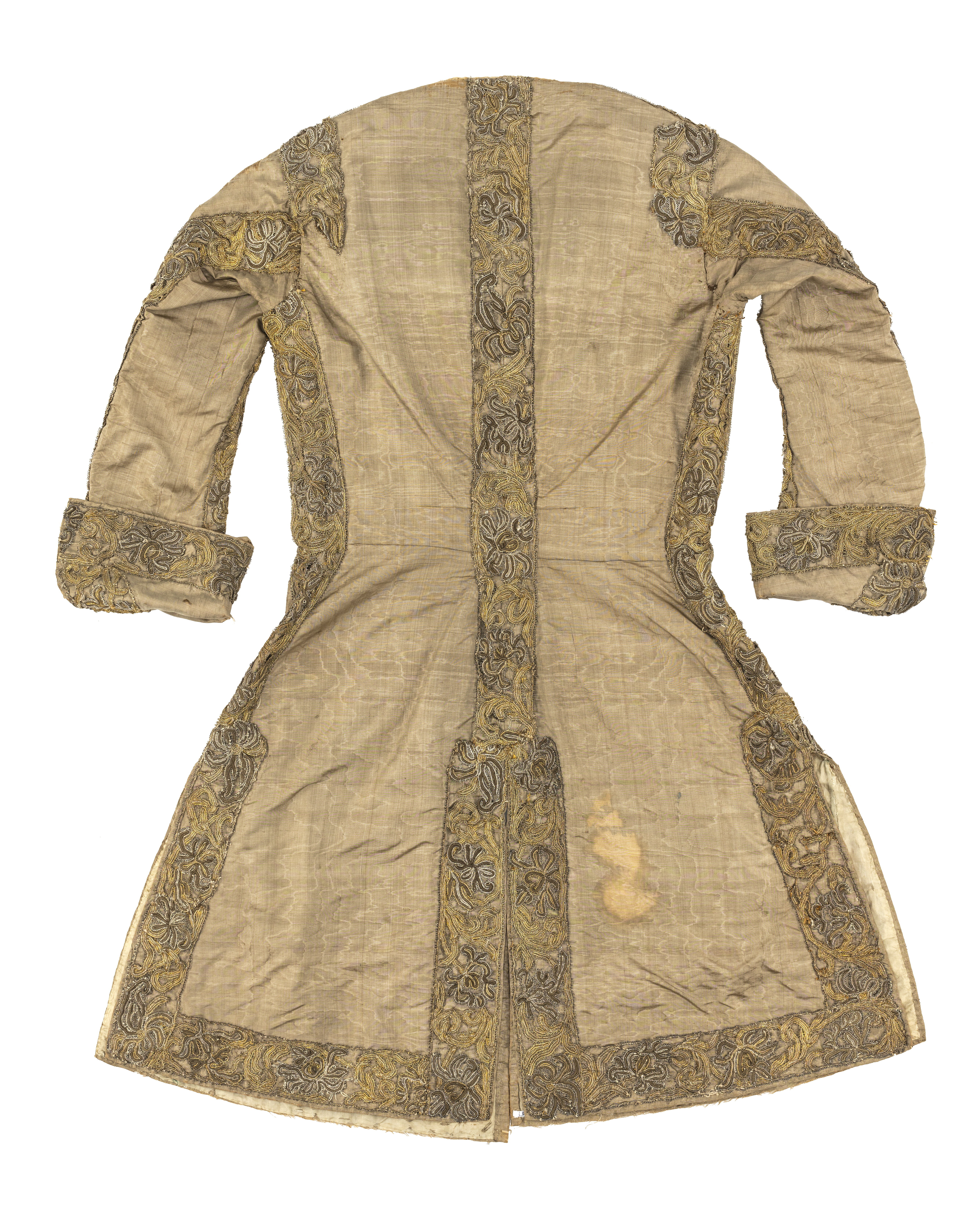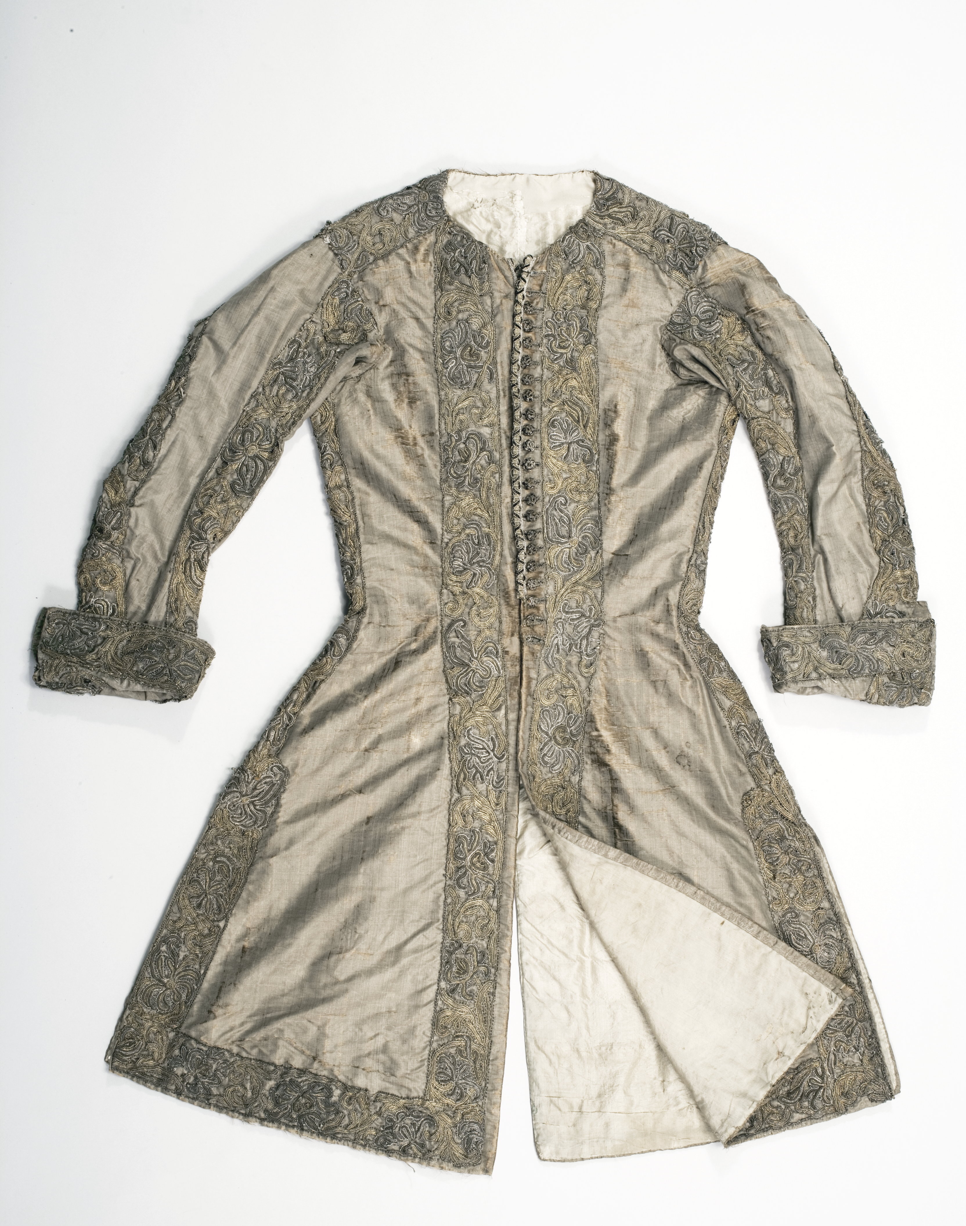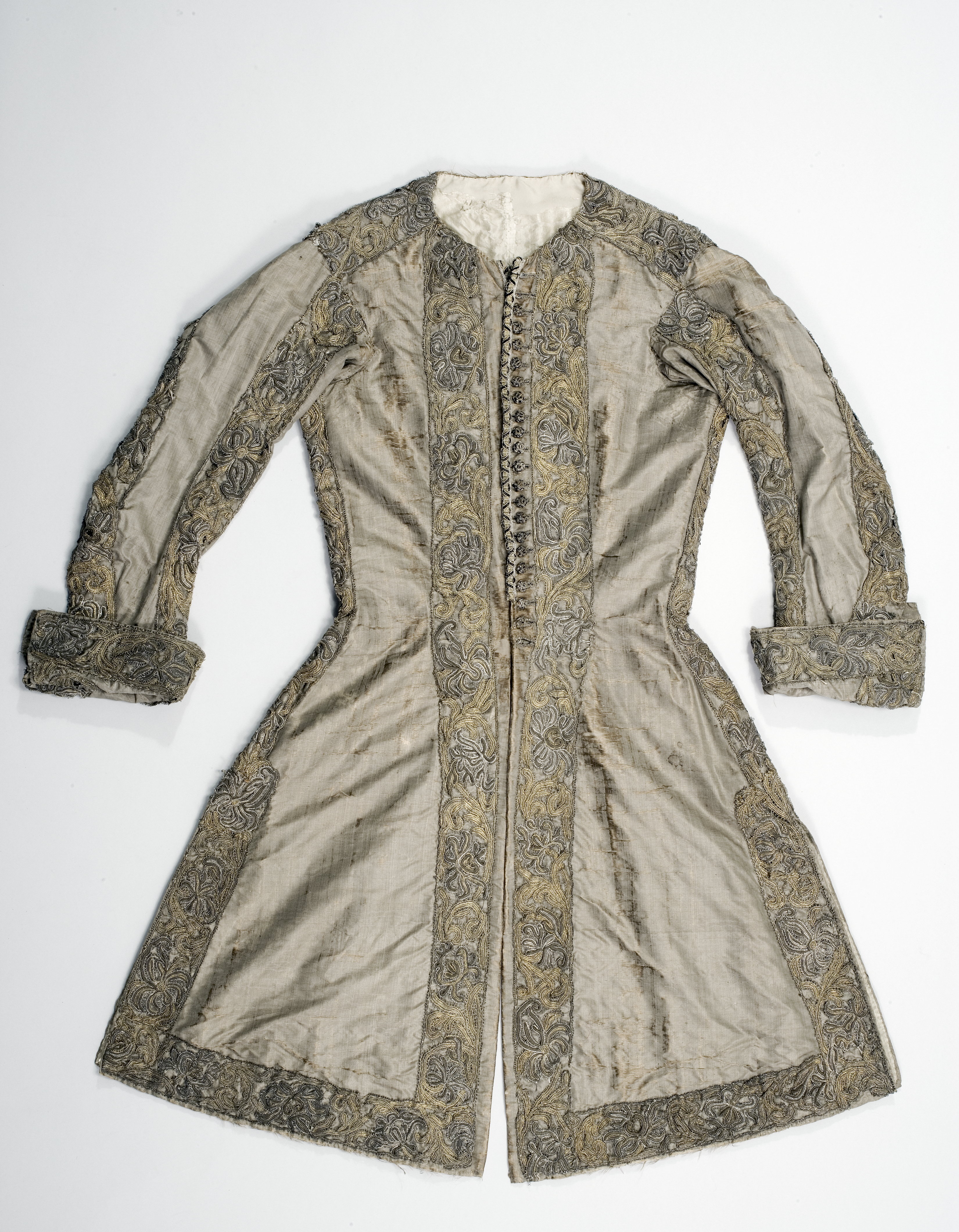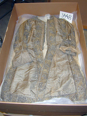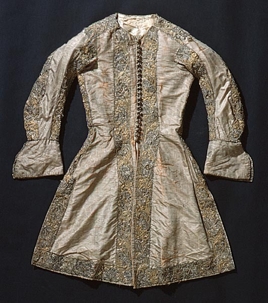 Lång väst av gråbrun, vattrad sidenmoaré, dekorerad med en bred gipyrspets i silver och guld och även en liten snodd i silver, guld och silke. Västen sydd av 4 delar med en mycket smal midja och från midjan och neråt utsvängd med tre sprund. Långa smala ärmar med stora manschetter. Västen fodrad med sidentaft och mellanfoder av linnelärft. Längd mitt fram 910 mm, bredd mitt fram 285 mm. Längd mitt bak 980 mm, bredd mitt bak 410 mm. Ryggsöm 680 mm. Ärmlängd 595 mm, största ärmvidden 360 mm, ärmvidd nedtill 260 mm. Axelsöm 125 mm. Sprund mitt bak 300 mm och sidsprund 290 mm. Manschett, höjd 135 mm, omkrets 370 mm. Västen dekorerad 35 mm från framkanten, längs med nederkanten och sprunden, sidsömmarna, axelsömmarna och ärmens sömmar med en 60 mm bred gipyrspets. Spetsen sammansatt av olika element (sjöstjärnor ?) i silver, guld och brungrått silke. Även manschetterna dekorerade med denna spets. I vänster framkant 22 st knapphål, 20 mm långa av silvertråd. I höger framkant 22 st knappar med svart silkesbotten, överdragen med guld- och silvertråd på trästomme. Längs framkanten under knapparna och utanför knapphålen löper en 20 mm bred snodd.