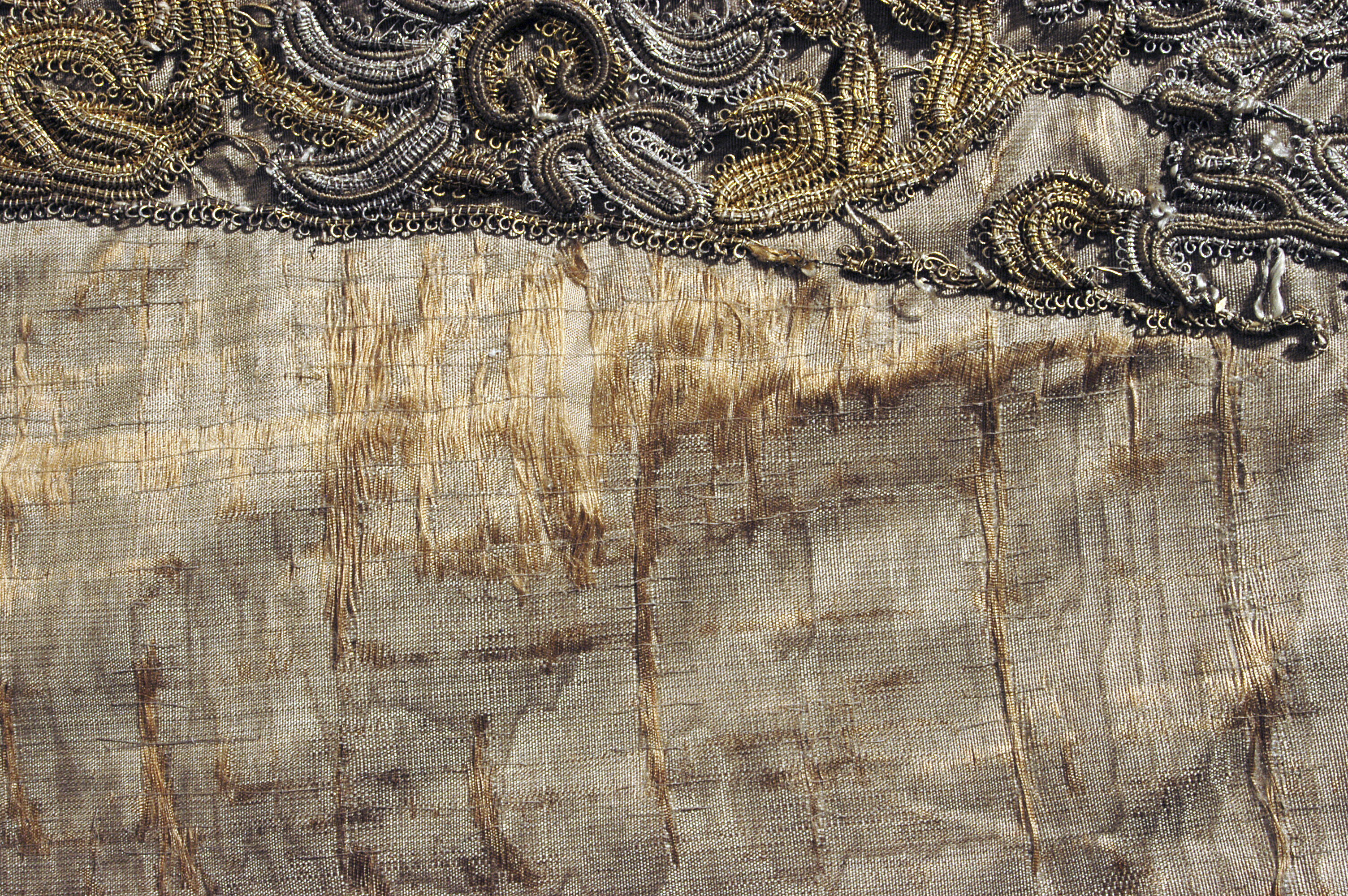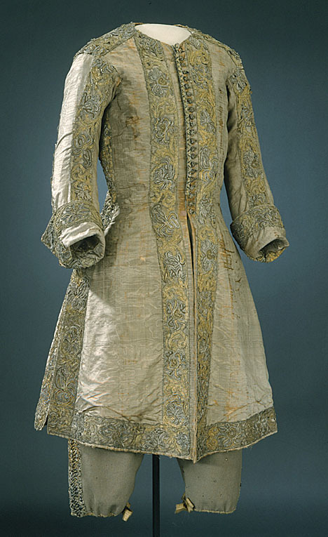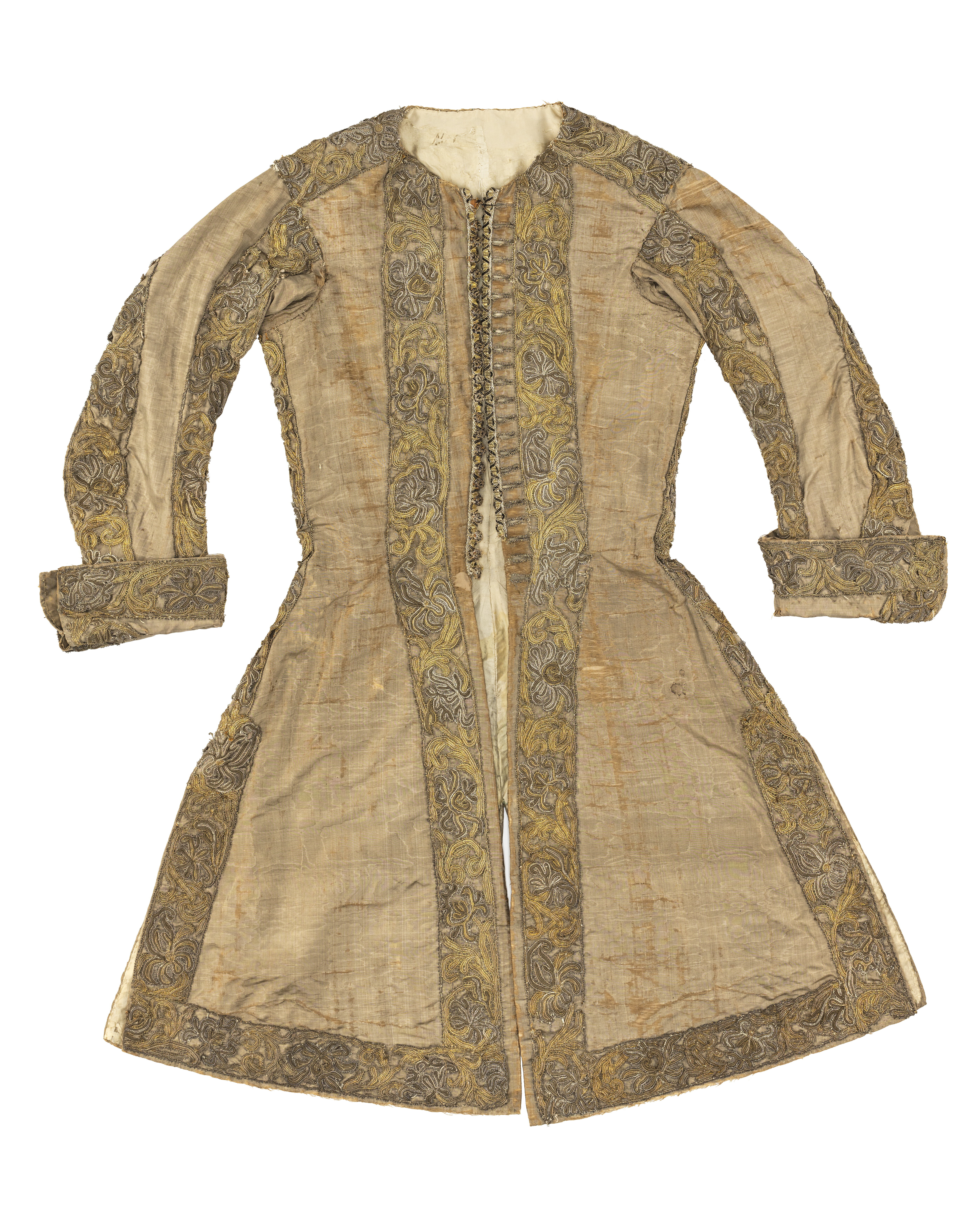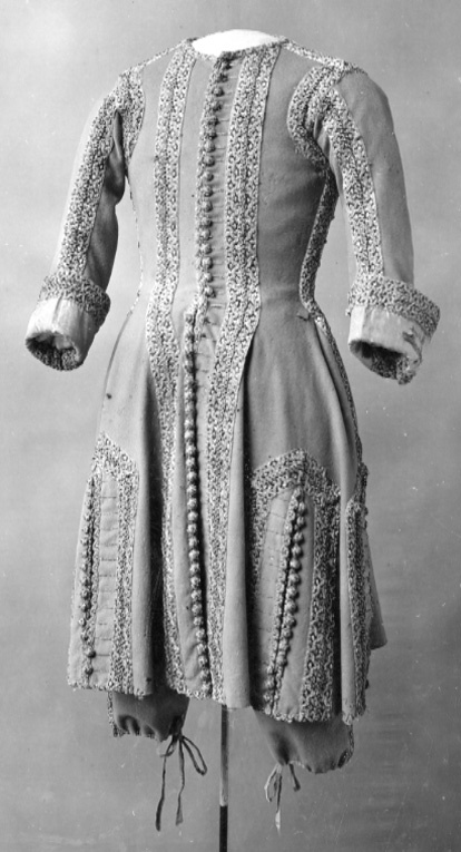 Lång väst av gråbrun, vattrad sidenmoaré, dekorerad med en bred gipyrspets i silver och guld och även en liten snodd i silver, guld och silke. Västen sydd av 4 delar med en mycket smal midja och från midjan och neråt utsvängd med tre sprund. Långa smala ärmar med stora manschetter. Västen fodrad med sidentaft och mellanfoder av linnelärft. Längd mitt fram 910 mm, bredd mitt fram 285 mm. Längd mitt bak 980 mm, bredd mitt bak 410 mm. Ryggsöm 680 mm. Ärmlängd 595 mm, största ärmvidden 360 mm, ärmvidd nedtill 260 mm. Axelsöm 125 mm. Sprund mitt bak 300 mm och sidsprund 290 mm. Manschett, höjd 135 mm, omkrets 370 mm. Västen dekorerad 35 mm från framkanten, längs med nederkanten och sprunden, sidsömmarna, axelsömmarna och ärmens sömmar med en 60 mm bred gipyrspets. Spetsen sammansatt av olika element (sjöstjärnor ?) i silver, guld och brungrått silke. Även manschetterna dekorerade med denna spets. I vänster framkant 22 st knapphål, 20 mm långa av silvertråd. I höger framkant 22 st knappar med svart silkesbotten, överdragen med guld- och silvertråd på trästomme. Längs framkanten under knapparna och utanför knapphålen löper en 20 mm bred snodd.