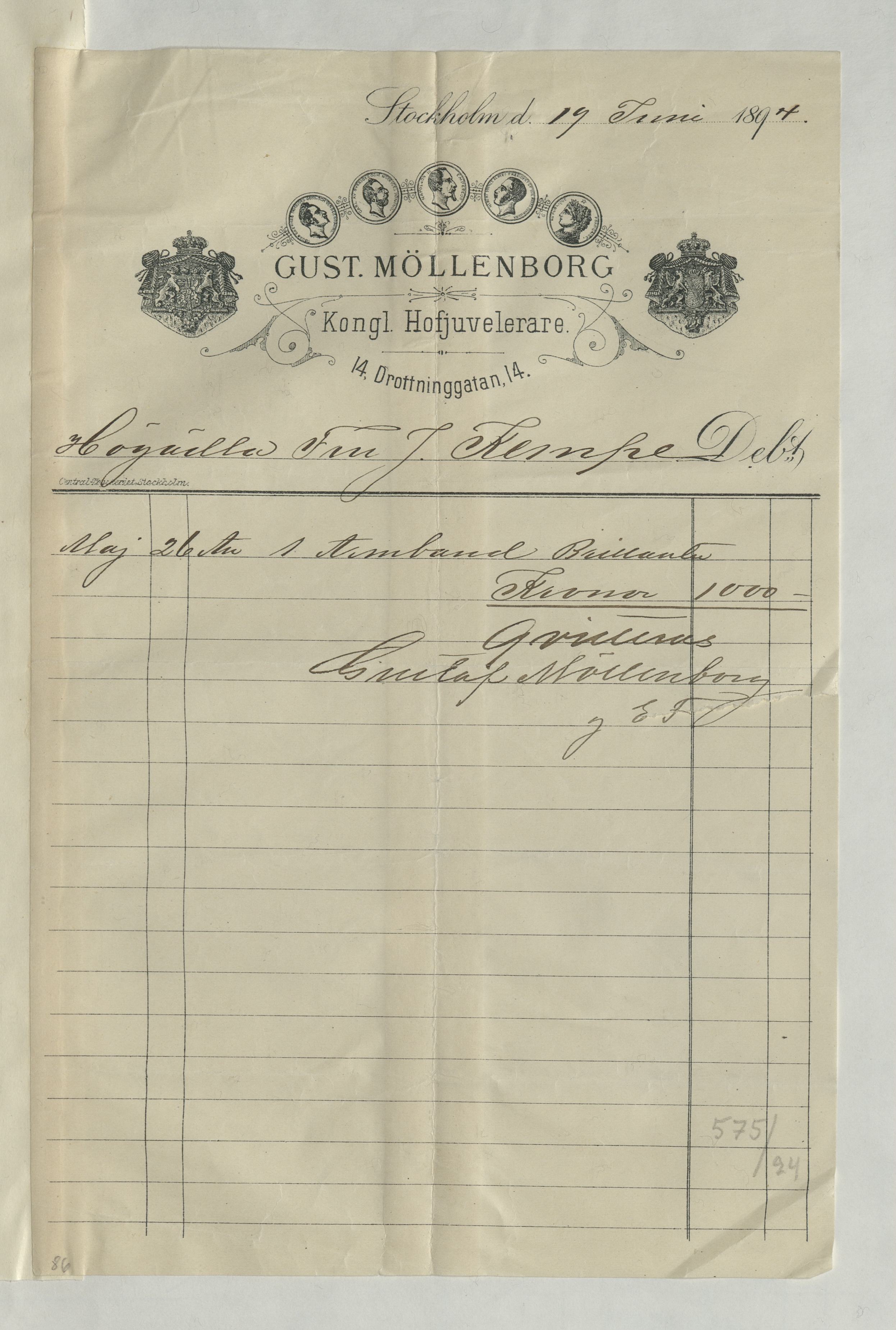 Kvitto från Gustaf Möllenborg, Juvelerare, 1894