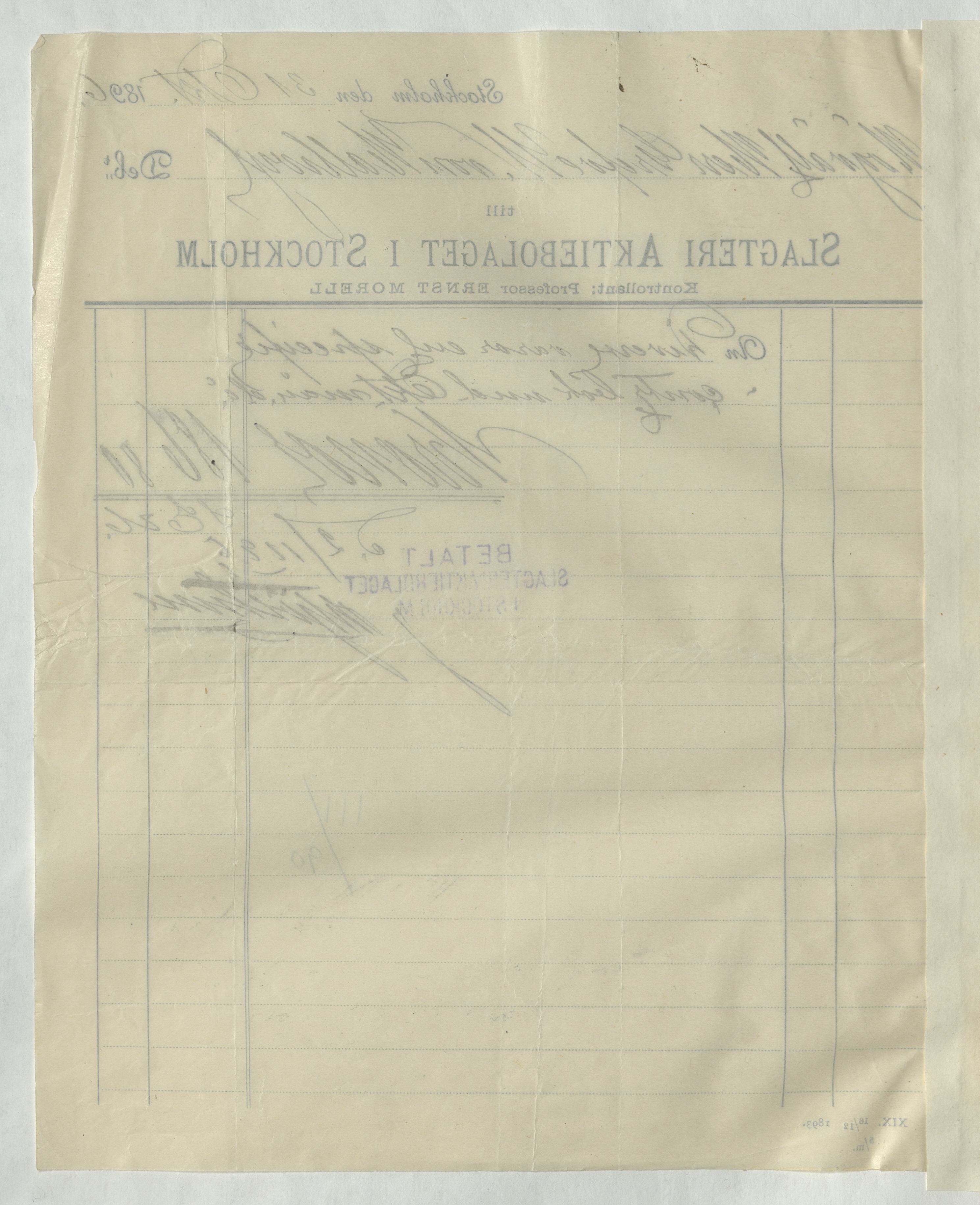 Kvitto från Slagteri Aktiebolaget i Stockholm