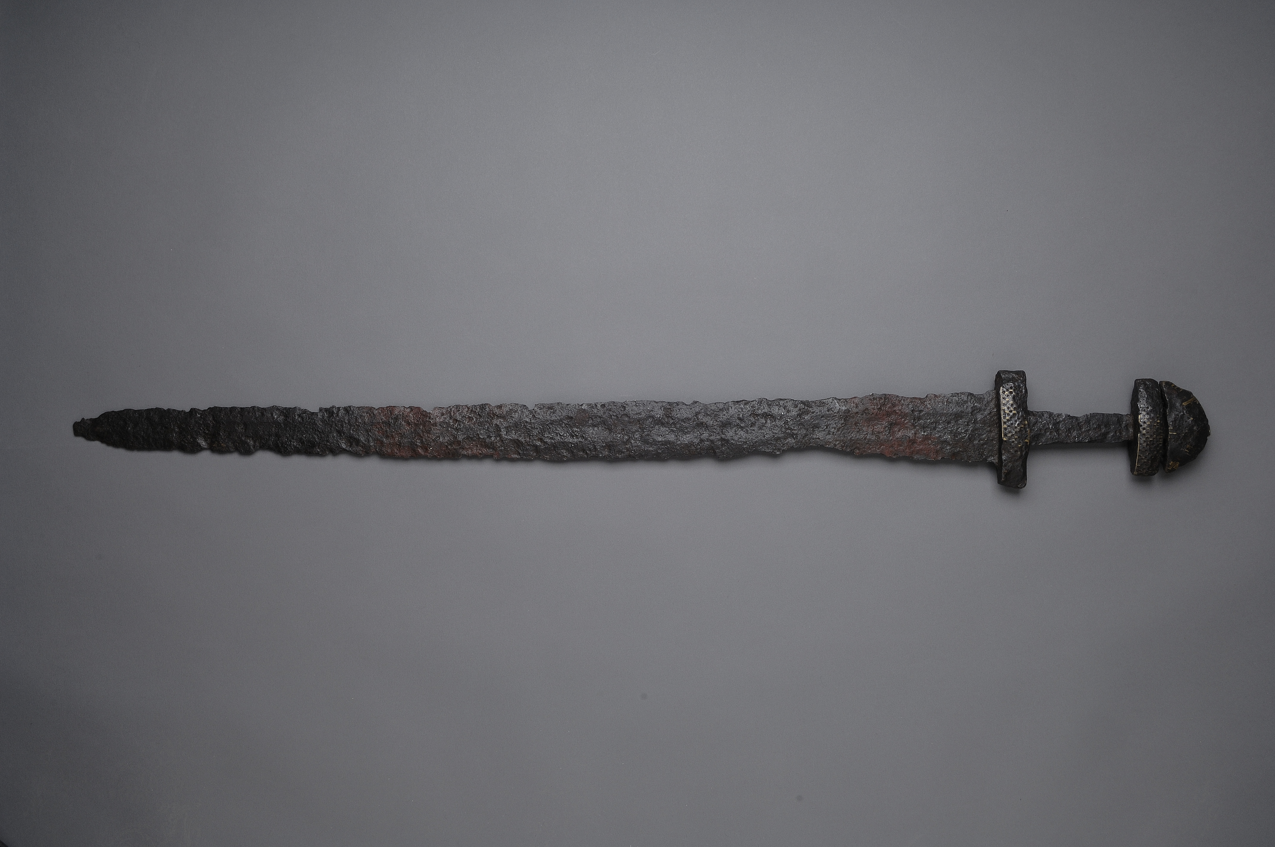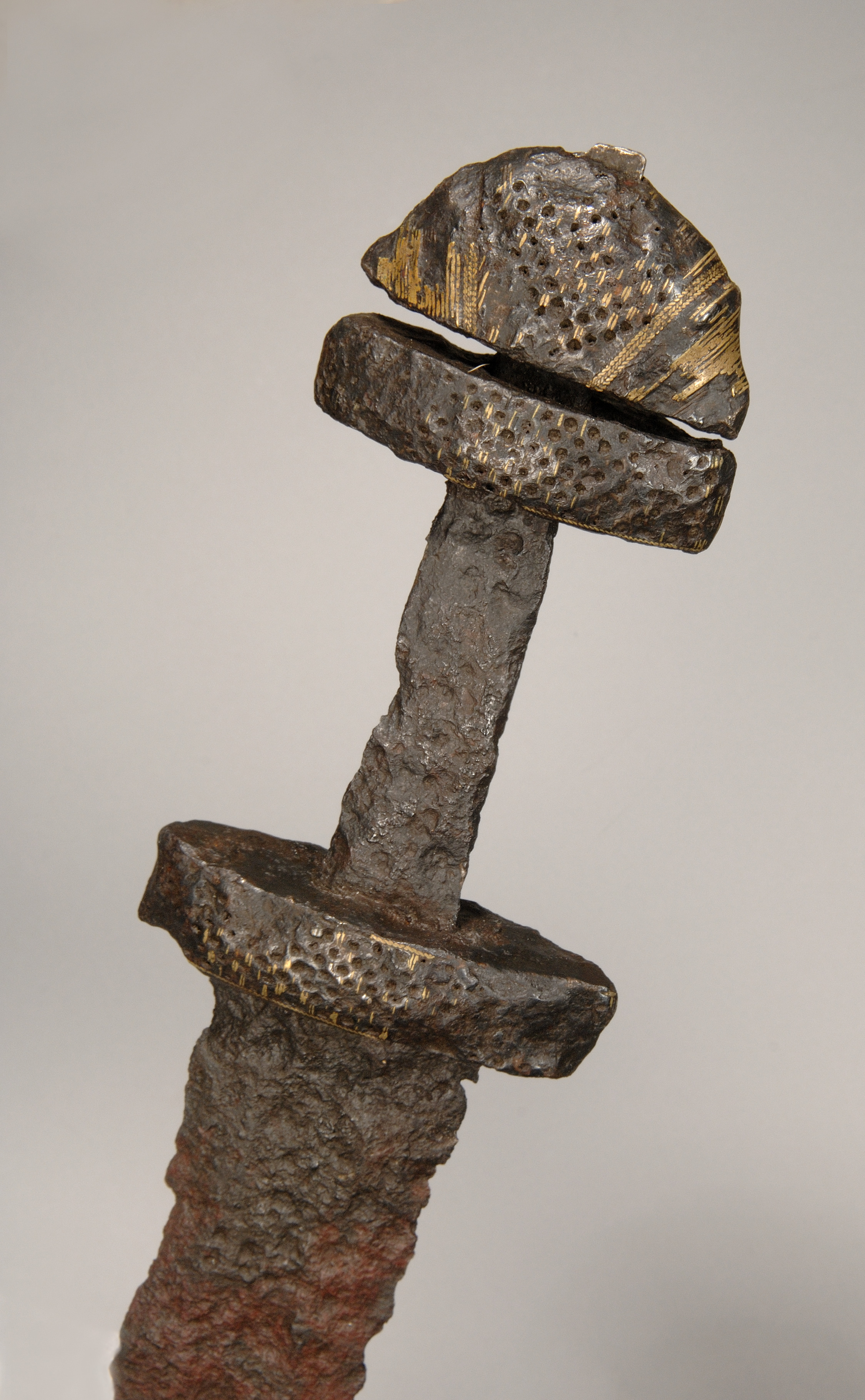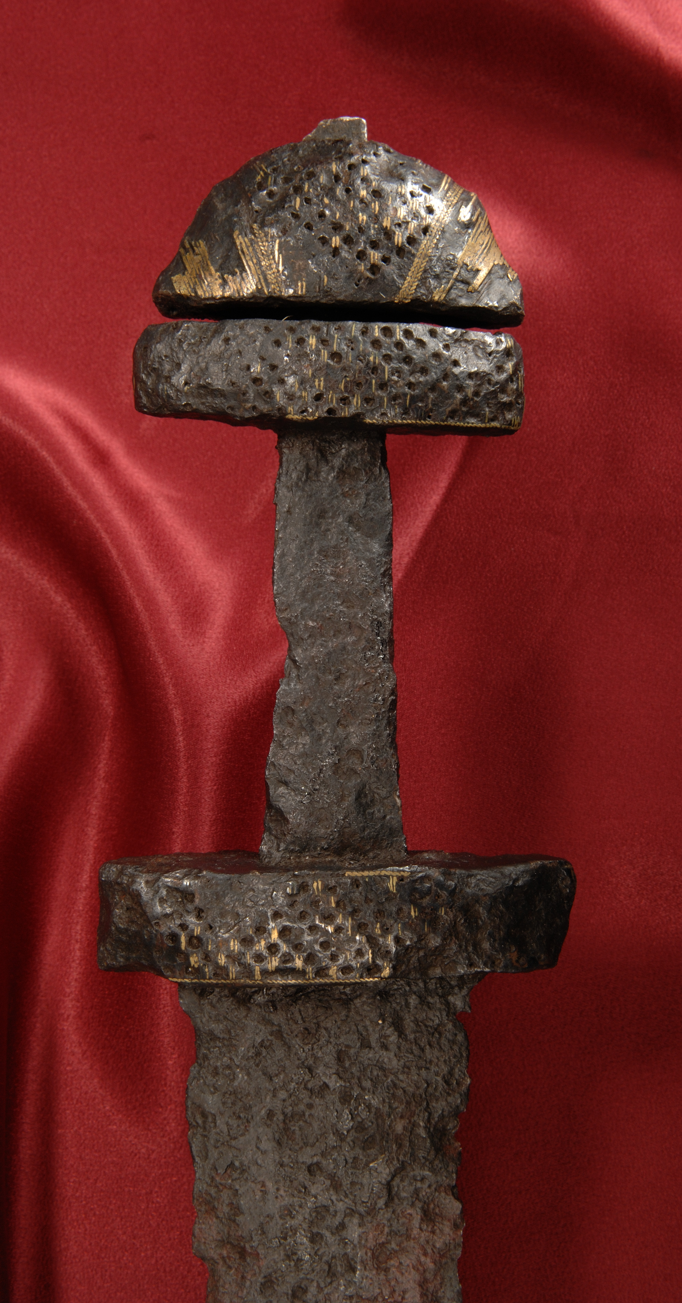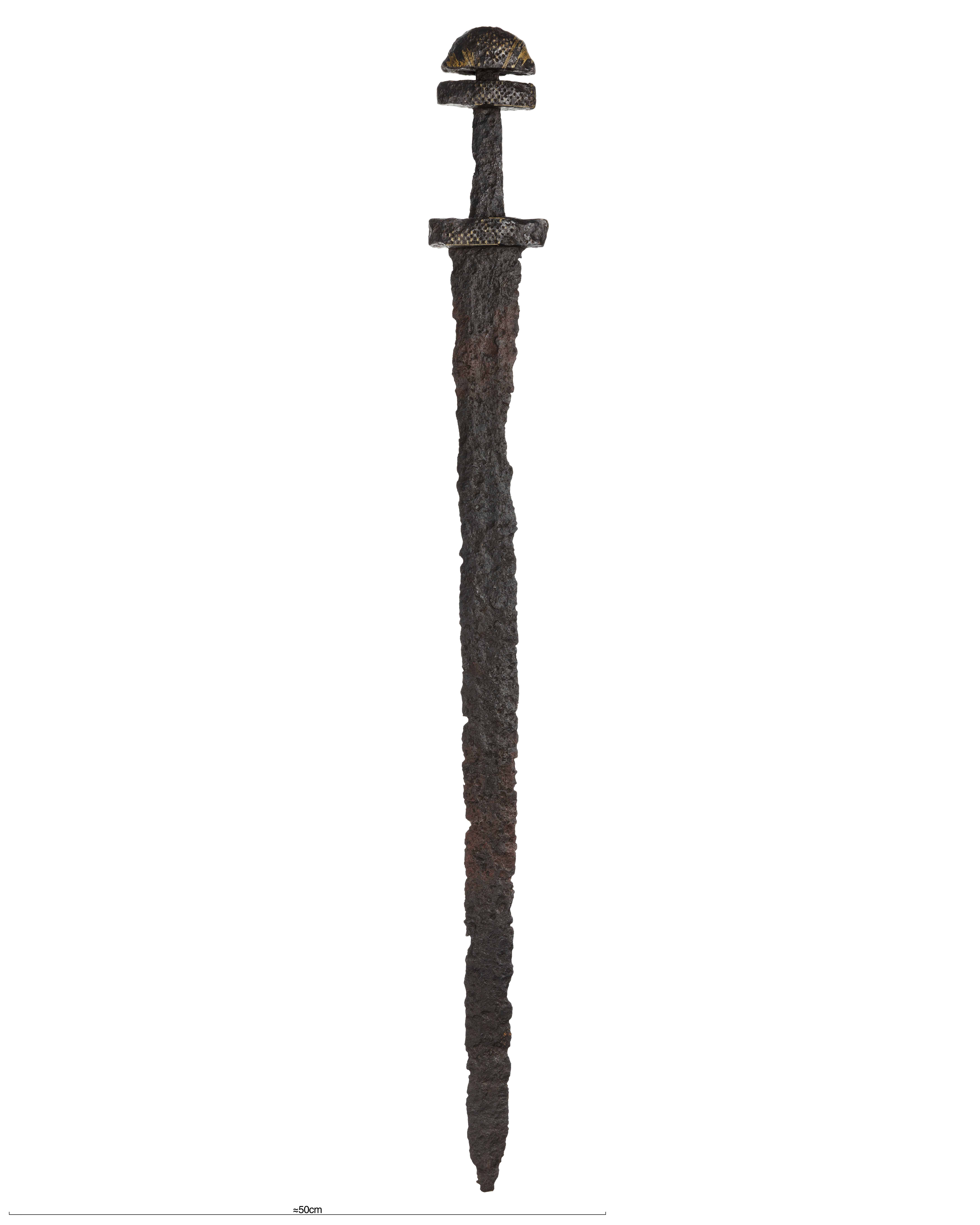 Tveeggat svärd vars klinga har en svag blodränna. knappen, parerstången och överhjaltet är dekorerade med tätt ställda ränder och gropar.