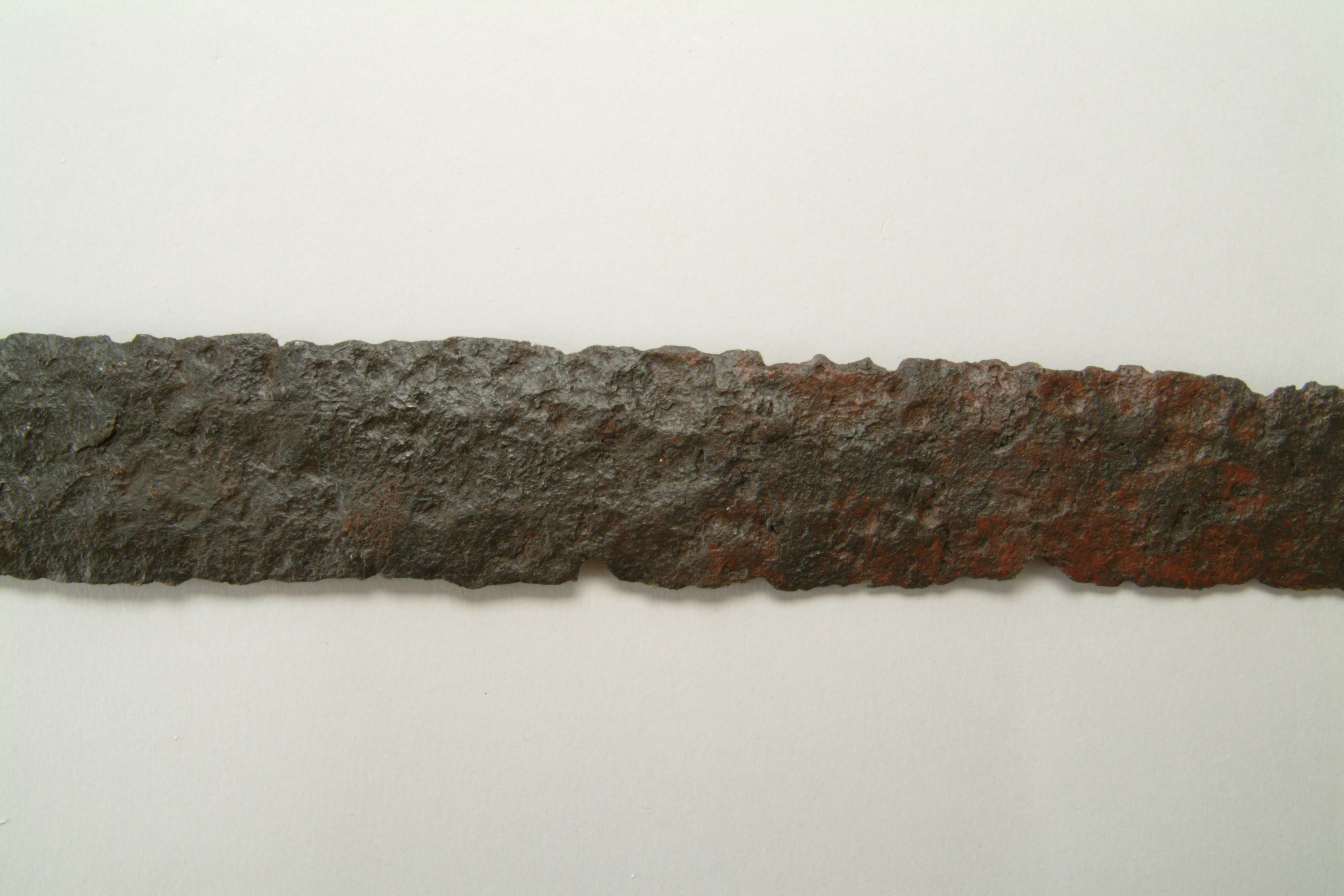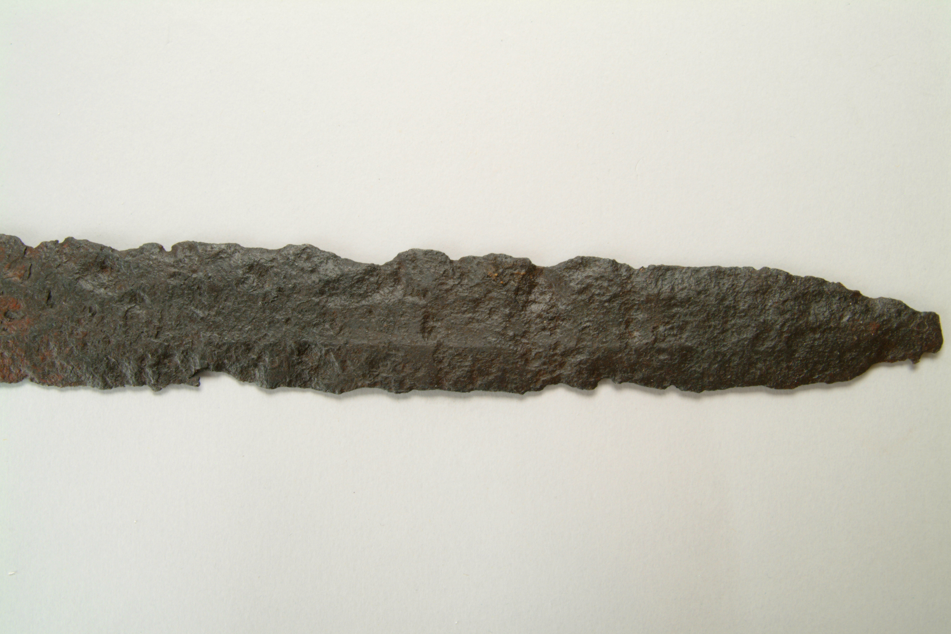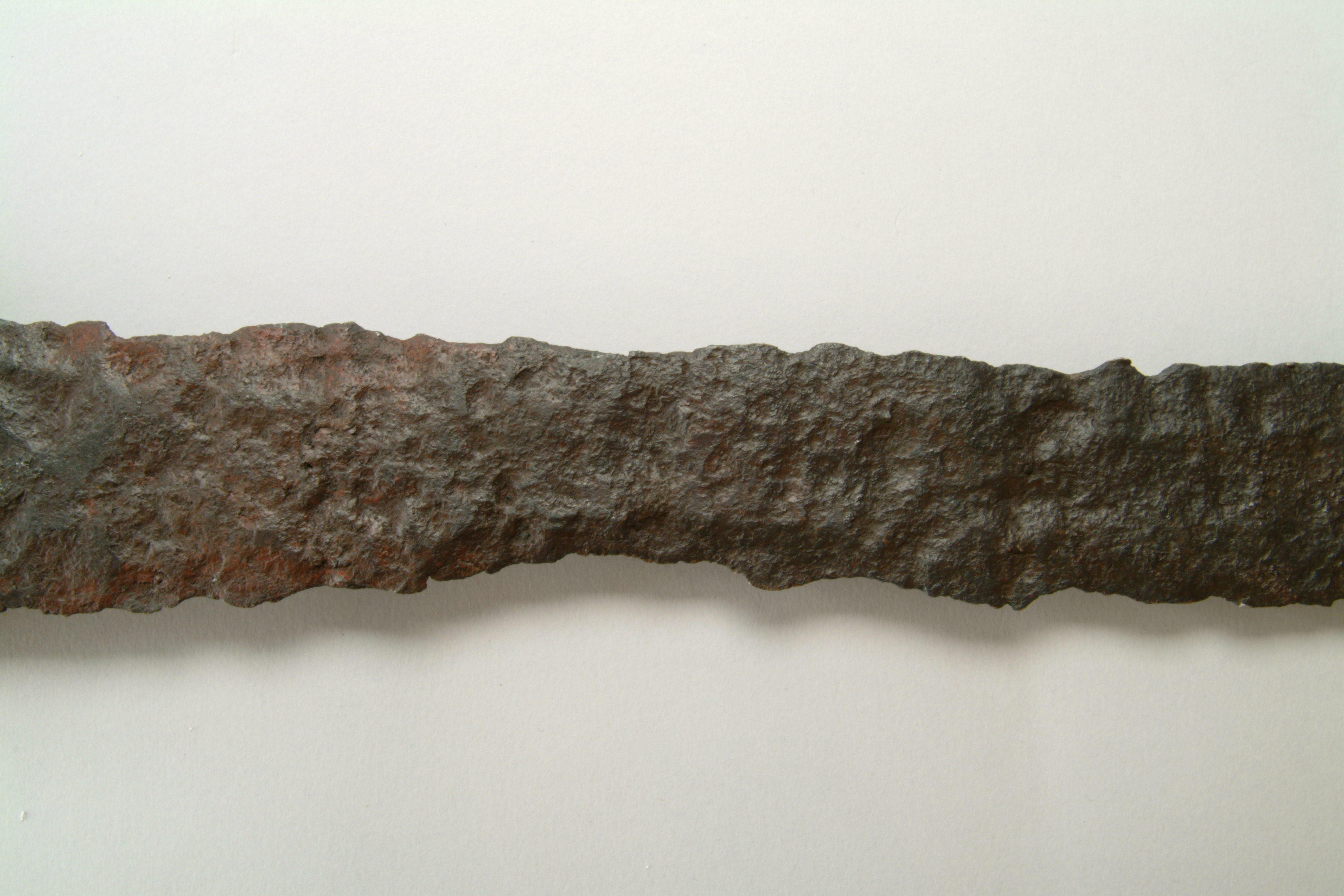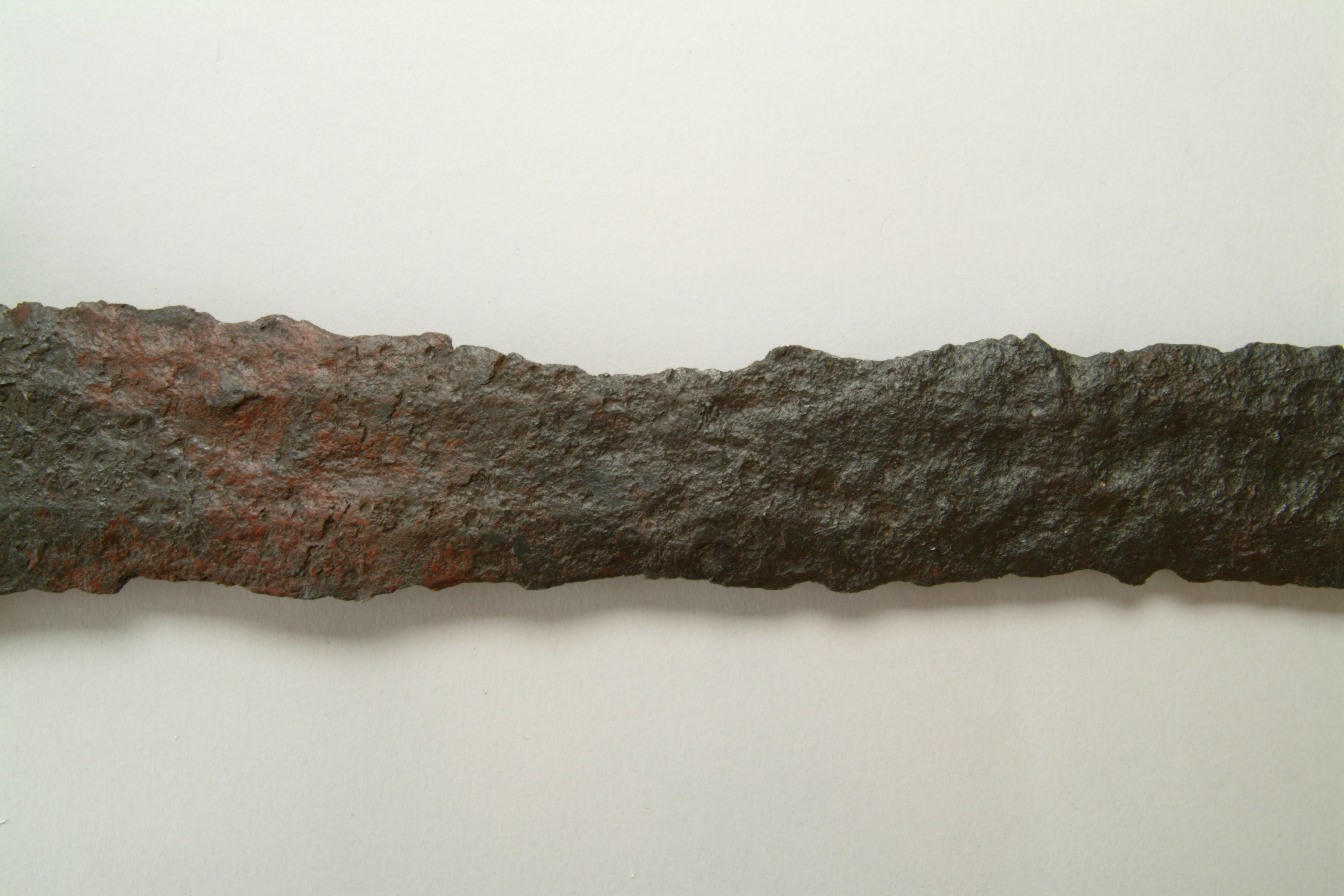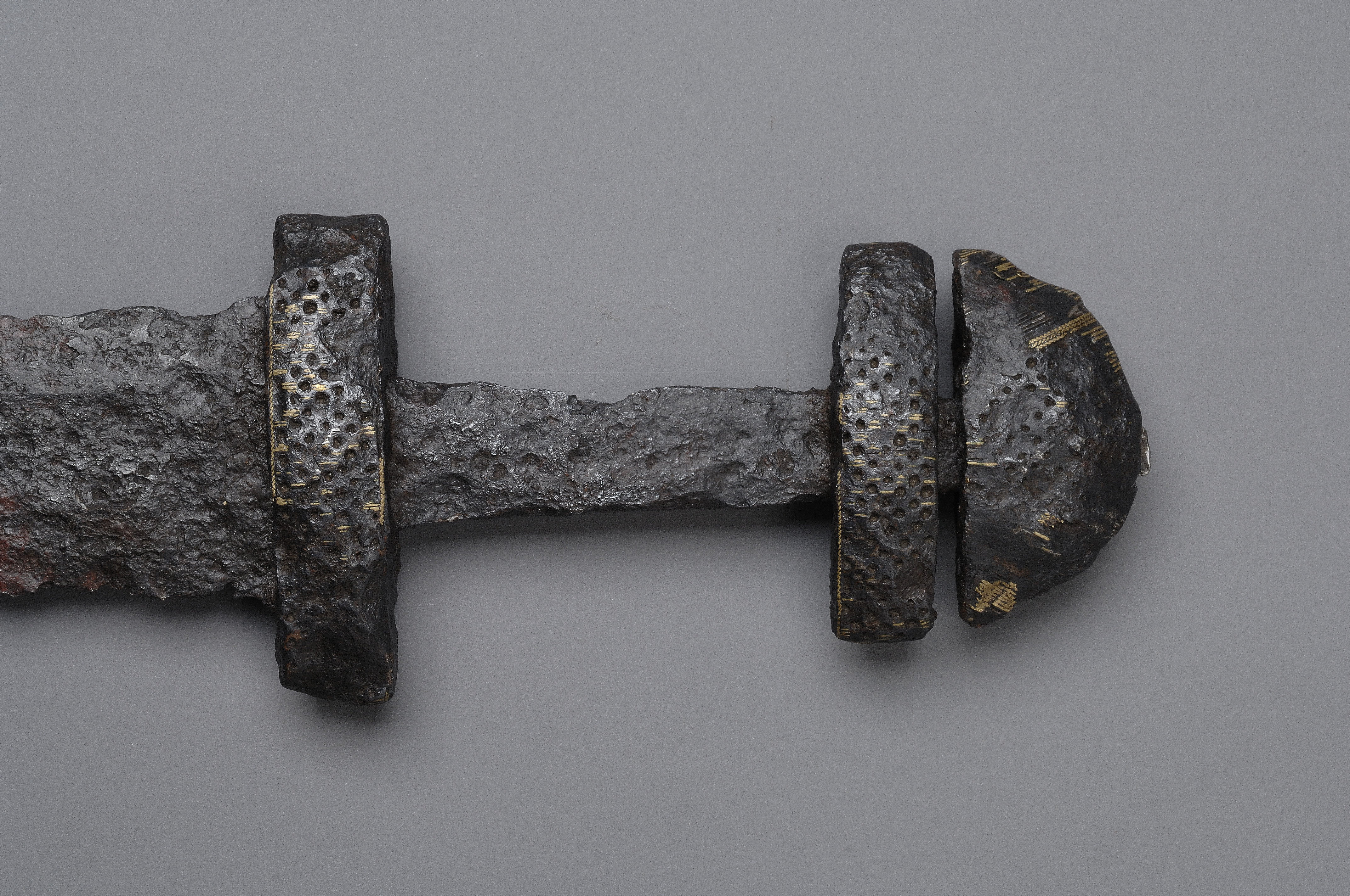 Tveeggat svärd vars klinga har en svag blodränna. knappen, parerstången och överhjaltet är dekorerade med tätt ställda ränder och gropar.