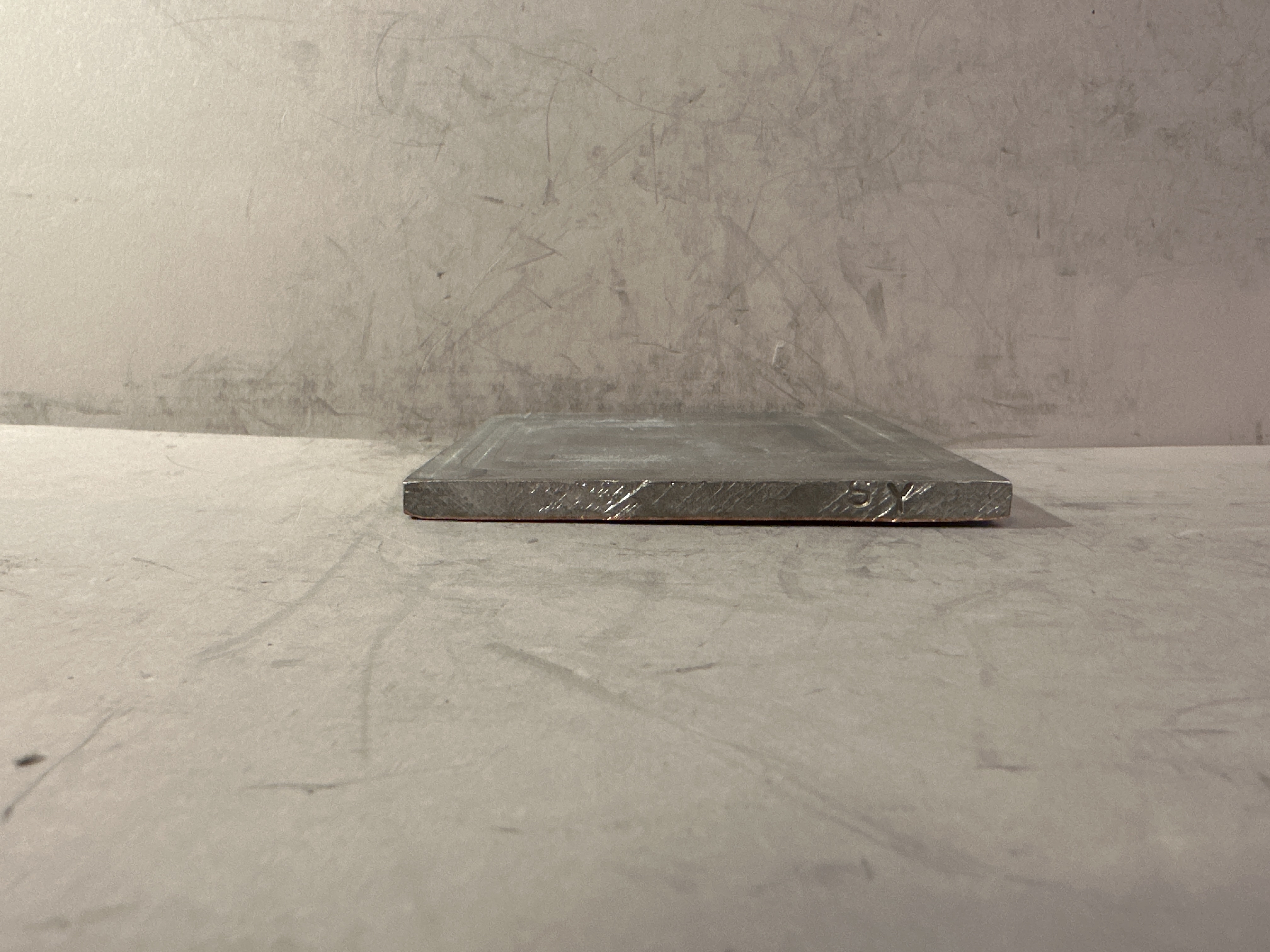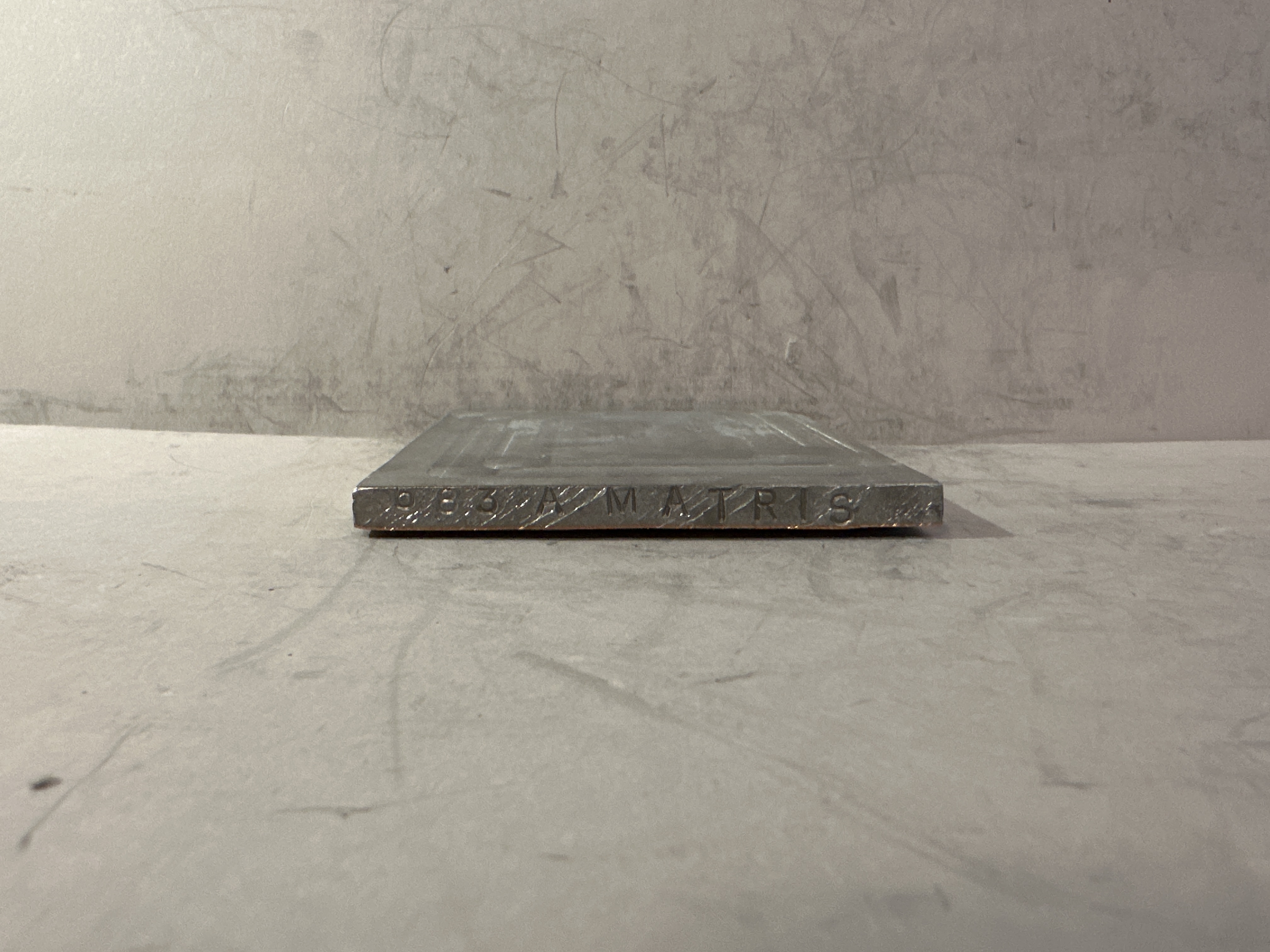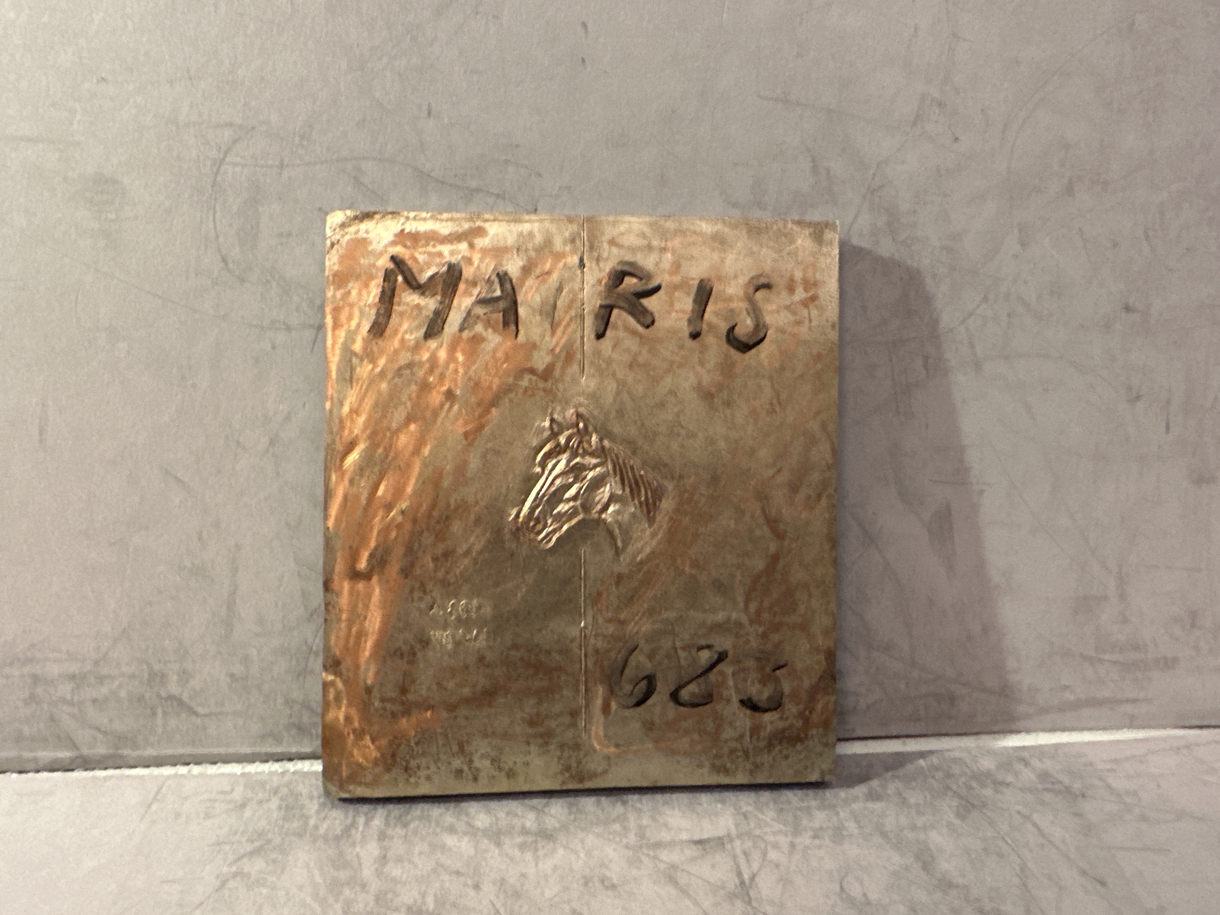 Pressplatta för vattenmärkestillverkning. Plattan tillverkad i bly och koppar, med motiv föreställande hästhuvud. Plattans framsida med påskrift i tusch: "MATRIS 683". Framsidan även med signatur: "LW 87". Två av plattans sidor med inskrifter: "683 A MATRIS" samt "SY".