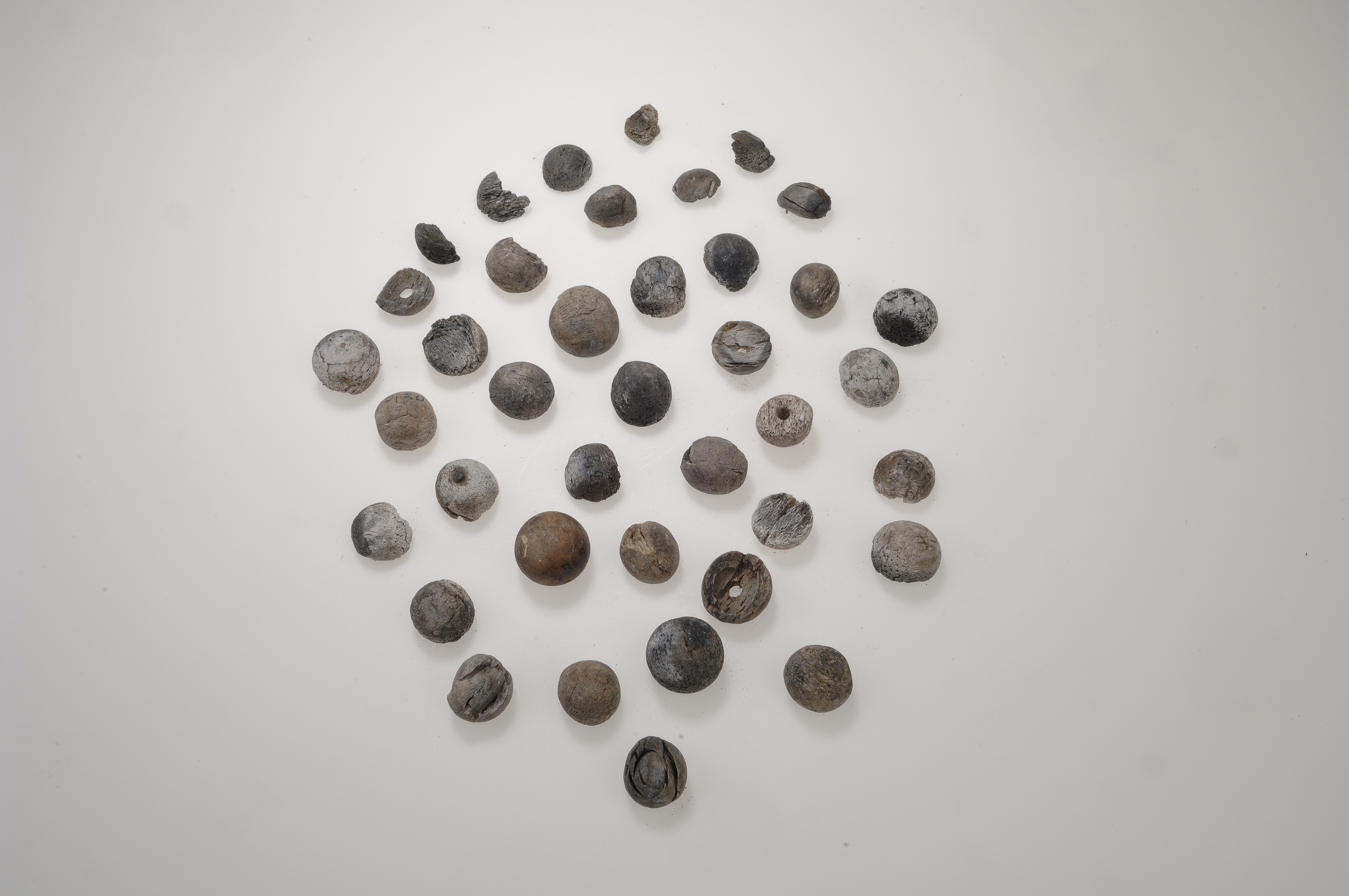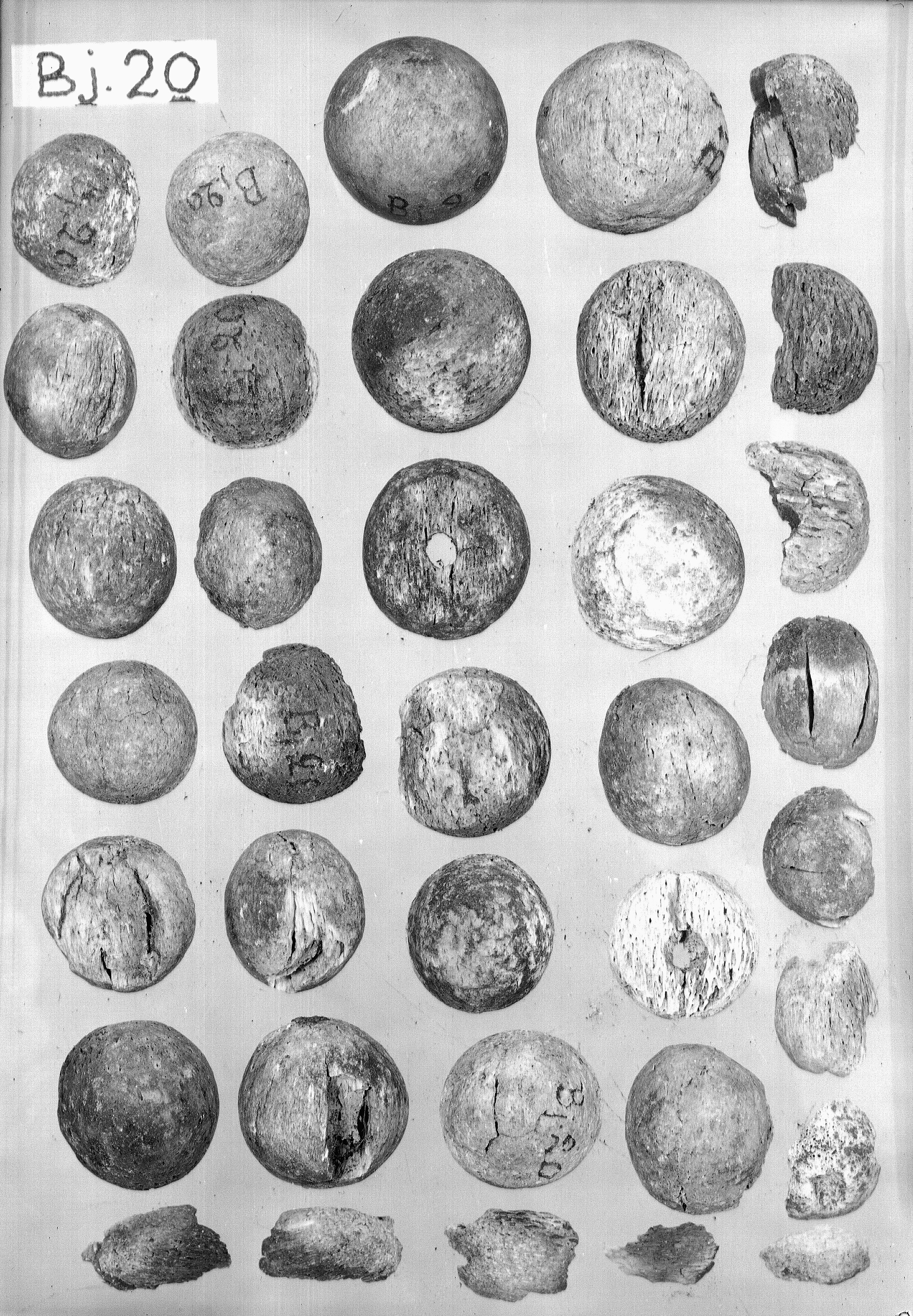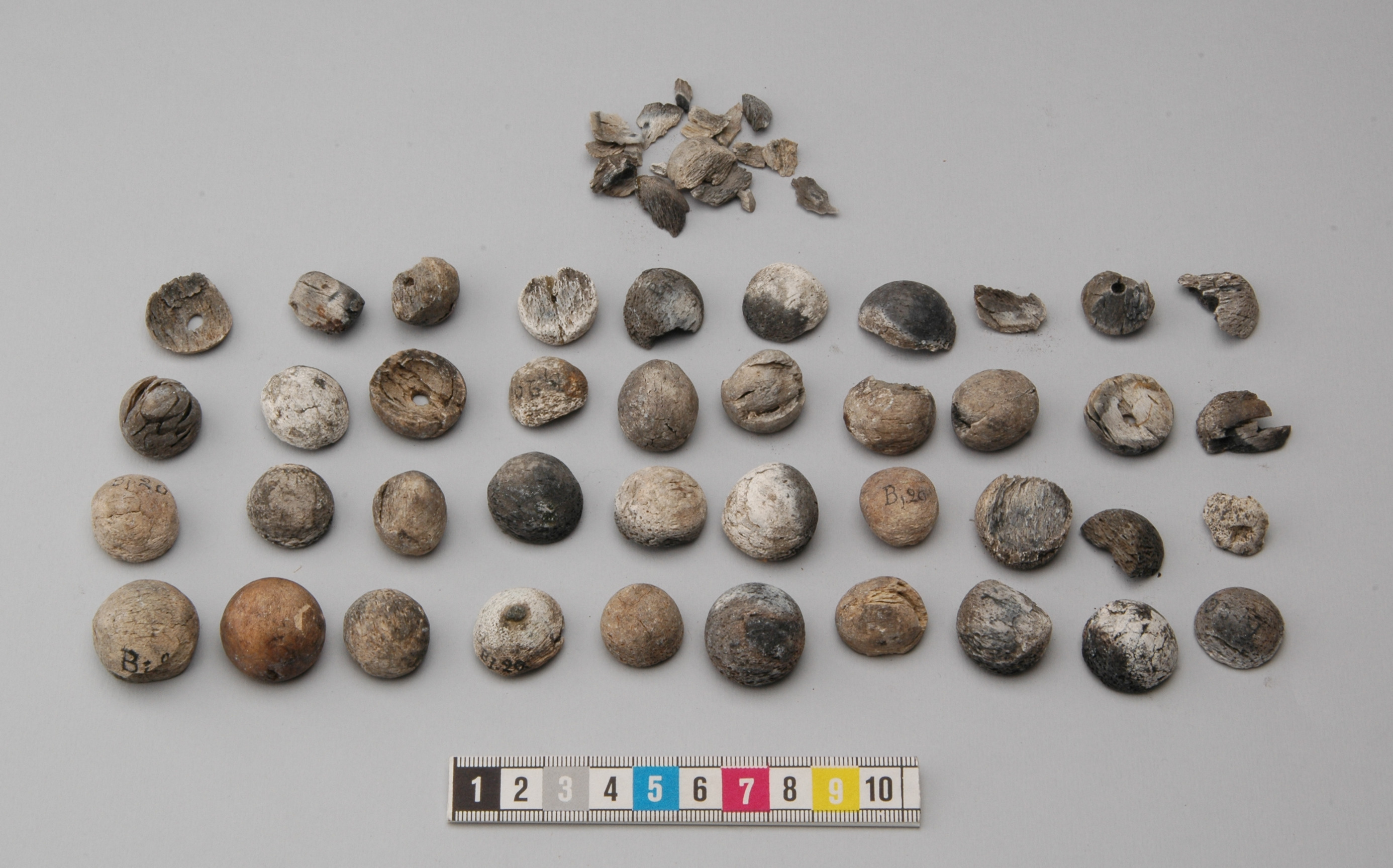 Spelbrickor, halvklotformiga med ett hål på undersida. En del är fragmentariska. Antalet är minst 36.
