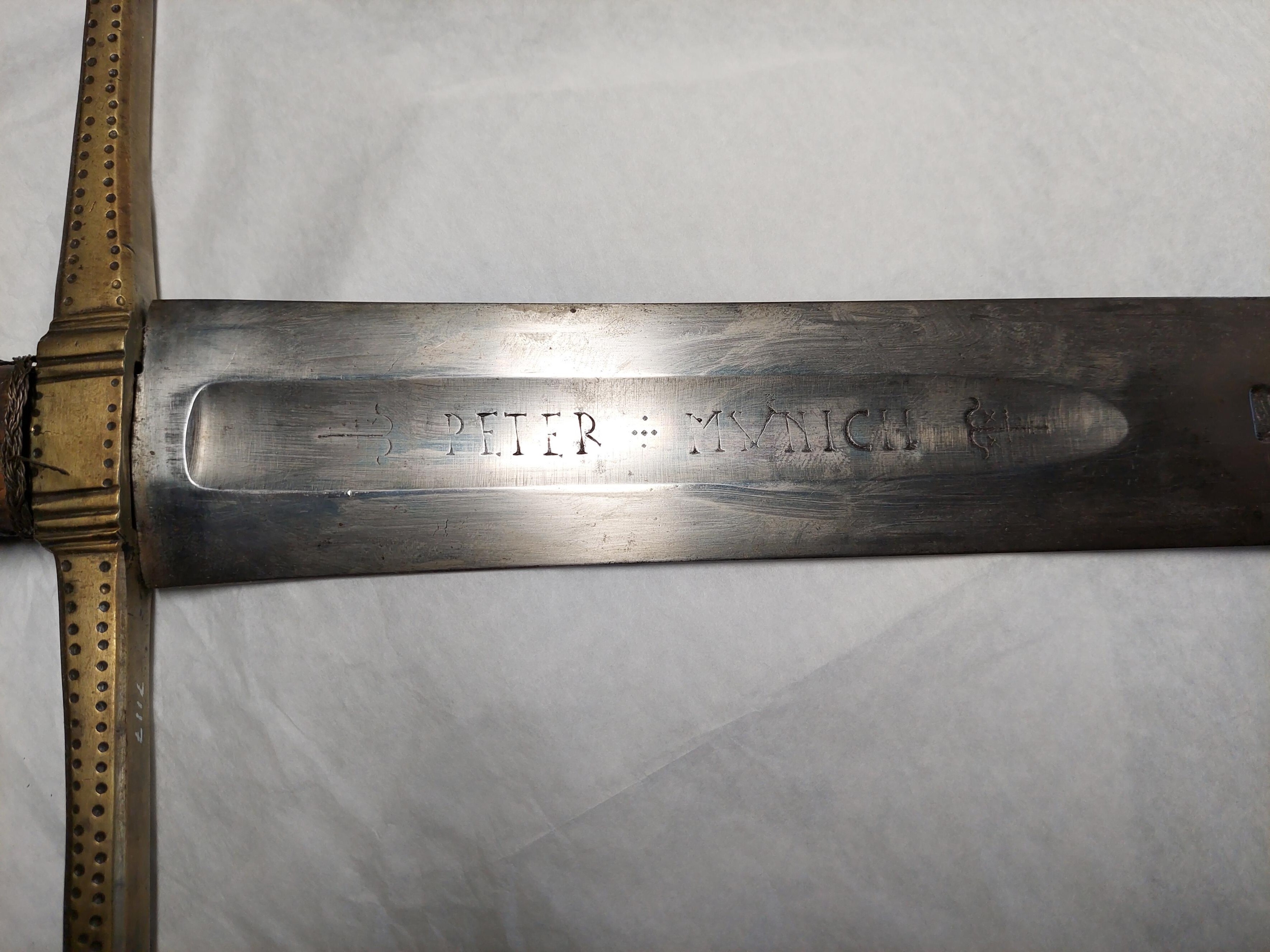 Korsfäste med knapp och parerstänger av slät mässing. Knapp omvänt konisk och något insvängd, runt mitten två punsade ränder, raka parerstänger, fyrsidiga, med små kulformiga ändar. Upptill och nedtill på kaveln rester av lindning av silvertråd. Tvåeggad klinga 60 mm bred med rundad ytterände, utmed starka delen en ca 19 cm lång hålkäl vari punsat på den ena sidan "PETER MUNICH" på den andra "IHN (S)OLINGEN", före på och efter inskriptionerna ett stiliserat rankornament. På båda sidor ovanför hålkälen en kraftigt inslagen större mästerstämpel, ett biskopshuvud (signum för Peter Mynich eller Munich, Munch, verksam i Solingen ca 1595-1610, Seitz. Blankwaffen I sid. 341, 344-345). Vid basen på ena sidan en liknande mästarstämpel, men mindre.