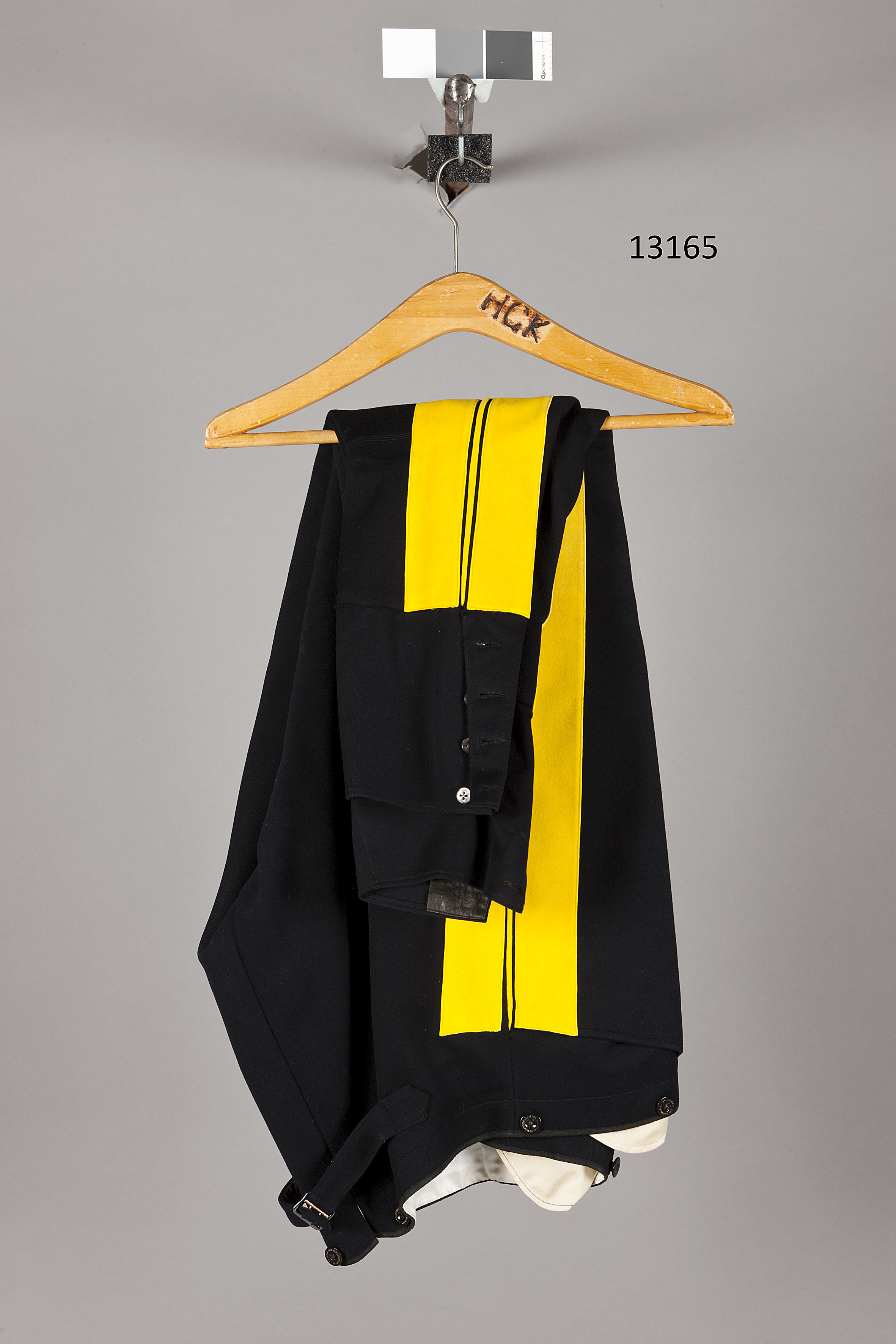 Ridbyxor av mörkblått kläde, knäppta med gylf med fyra knappar märkta: "ZITTORIN & LUNDVIK". Linningmed sex knappar märkta: "ZITTORIN & LUNDVIK STOCKHOLM". Två tvärställda fickor fram. mitt bakspänntampar med svart sölja märkt: "SOLIDE". På enaspänntampen firmaetikett: "F. KAEDINGSEFTERTRÄDARE )) STOCKHOLM Feb1912 )) H. M. Konungen".Utmed sidsömmarna två breda gula klädesgaloner med mellanliggande passpoal. Vid knäna på insidan'strykjärns'formad stickad förstärkning av byxans tyg. Nedtill på utsidan sprund knäppta med fyrasmå pärlemorknappar. Foder i hela byxan av blå-vit rutigt ylletyg. i linningen vitt siden.Fickor av gulvit bomullssatin.