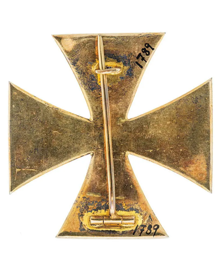 Malteserkors av förgyllt silver, på framsidan klätt med rött kläde. På baksidan säkerhetsnål.