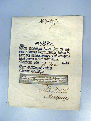 Sedel i samma utförande som nr 9620. Den tryckta texten:"Sch. 8 Banco. // Åtta Schillingar Banco, som uti Rik- // sens Ständers Wäxel-Banque blifwit in- // satte har Sedelhafwaren at af Banquen emot denna Sedel utbekomma. // Stockholm den 30 Jan 1849." ( 30 Jan skrivet med bläck). "Åtta Schillingar Specia // Kahdexans Skillingiä." Nedtill varningstext inom en sjudubbel ram: "Den som denne Sedel efterapar eller förfalskar skall warda hängd; // Men den som upptäcker Efteraparen, Förfalskaren, eller Utprångla- // ren, undfår belöning enligt Kungl. Kungörelsen af den 8 Juli 1818.". Nedtill två otydliga underskrifter. Av den tryckta texten är Sp:, Banco, Specia, Banquen, och Stockholm tryckta med antikva, resten med frakturstil.
