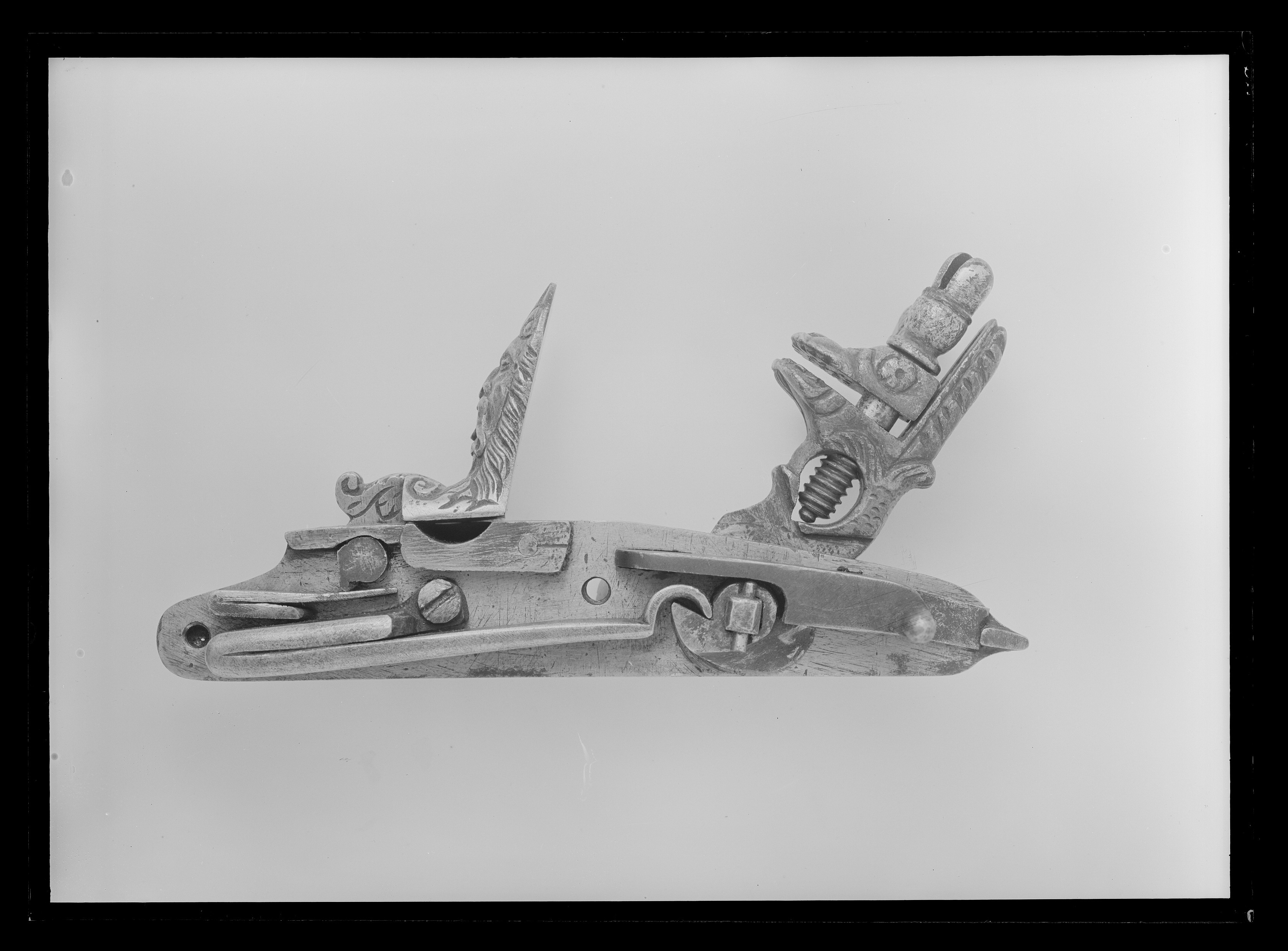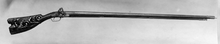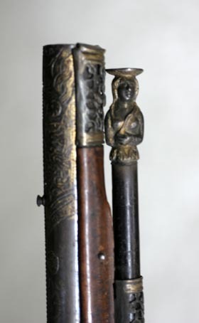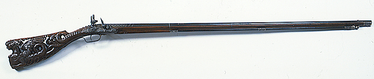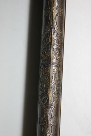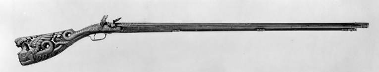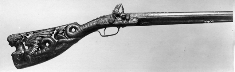 Rund, slätborrad, blånerad pipa. Dekor med pärlstavsmittås längs hela pipan. På kammaren ytterligare två lister, alla förgyllda. Vid pipbasen förgyllda blad, på vardera sidan av mittlisten inskruvat en kulknapp av silver. På v. sida stämpel: oval med I P krönt av en öppen krona, därframför en otydlig stämpel(?). På kammaren därframför ett förgyllt fält med punsad blomdekor, rader av påslagna, fyrbladiga blommor av silver mellan listerna, listerna slät och dekorerade med fyrkantiga knappar av silver. Därframför mot mittlisten konvergerande, framåtriktade, punsade linjer, varannan försilvrad, mittlinje i form av pärlstav, framtill voluter. Därframför silverknappar och blad på mittfaserna, vid sidorna punsade rankor.Vid sidolisternas spetsar silverknappar. Mitt på pipan vidgar sig mittlisten till en förgylld kartusch i låg relief med vapensköld, riksvapen Frankrike, tre liljor, två och en, krönt av öppen krona (prinsarnas av blodet krona enl. Lenk). Runt vapnet en lagerkrans. Vid mynningen ett punsat, förgyllt fält med rankdekor. Rektangulärt svansskruvblad, förgyllt och dekorerat med kvadrater och fyrkantiga silverknappar, bakre delen försänkt, däröver stålplatta till samma höjd, dekorerad på samma sätt som resten av svansskruvbladet. På pipans undersida stämpel I P som på ovansidan, samt en fembladig blomma (Stöckelnr 5914). Riktmedel: Knoppkorn av silver. Fästning: Två (urspr. fyra) fästen. Pipan fäst med krysskruv underifrån, dold av avtryckarblecket, skruven fäst i gängat hål i plattan över svansskruvbladets bakre del. Dessutom ett pipstift av stål. Snapplås helt i stålsnitt med halvspänn på stångtand gm låsblecket, helspänn på nöten, horisontellt arbetande avtryckare. Plant låsbleck, förgyllt och dekorerat i form av en liggande drake, vänd framåt. Hane med kropp i form av en delfin, droppformiga käkar i form av lejonmaskaron. Hög, rak hangren i form av blad, lös överkäke, käkskruv med ekollonformigt huvud. Rundad fängpanna, på undersidan maskaron i stålsnitt. Batteri med dekor i form av en skäggig maskaron på eldstålsryggen, runt batteriaxeln solstrålar. Invändig batterifjäder. Nöt utan studel, fäst på hanaxeln med stift genom axeln, nederdelen avfasad för avtryckarstången. Blånerad stång. Fästning: Två låsskruvar med x-skåra. Svagt böjd, förgylld avtryckare med bakåtsvängd spets. Förgyllt avtryckarbleck av stål. Helstock av valnöt med kolv av tidig fransk typ, snidad och genombruten i form av en kvinnlig sfinx, vänd bakåt och med vingar och ormstjärt. På sfinxens bröst fäst en oval silverplåt med en tom, graverad vapensköld, krönt av visirhjälm och omgiven av lövverk. Ovanför plåten ett kors av fasetterade stålplattor, hängande i kedja av silverstift(?) om sfinxens hals,, hårprydnad i form av en oval, fasetterad stålplatta och därbakom kvadratiska, fasetterade stift. Kolvhals i form av en framåtvänd drake, huvud utskuret på stockens v. sida. På kolvhalsens ovansida kvadratiska, förgyllda, fasetterade stålnitar med silvertoppar. På båda sidor om svansskruvbladet stålplattor med dekor som på kammarens bakre del. En + två rörkor samt näsband av delvis förgyllt silver, genombrutna i rankmönster. Förgylld varbygel med kluven framstolpe och lång bakre arm, på bygeln dekor som på kammaren, på armen punsade rankor, två skruvar. Tillbehör: Laddstock av svartbetsat trä, l: 817 mm (avbruten). I framänden silverbeslag i form av en flicka, höftbild, på huvudet stötplatta i form av skivformig korg med frukter.