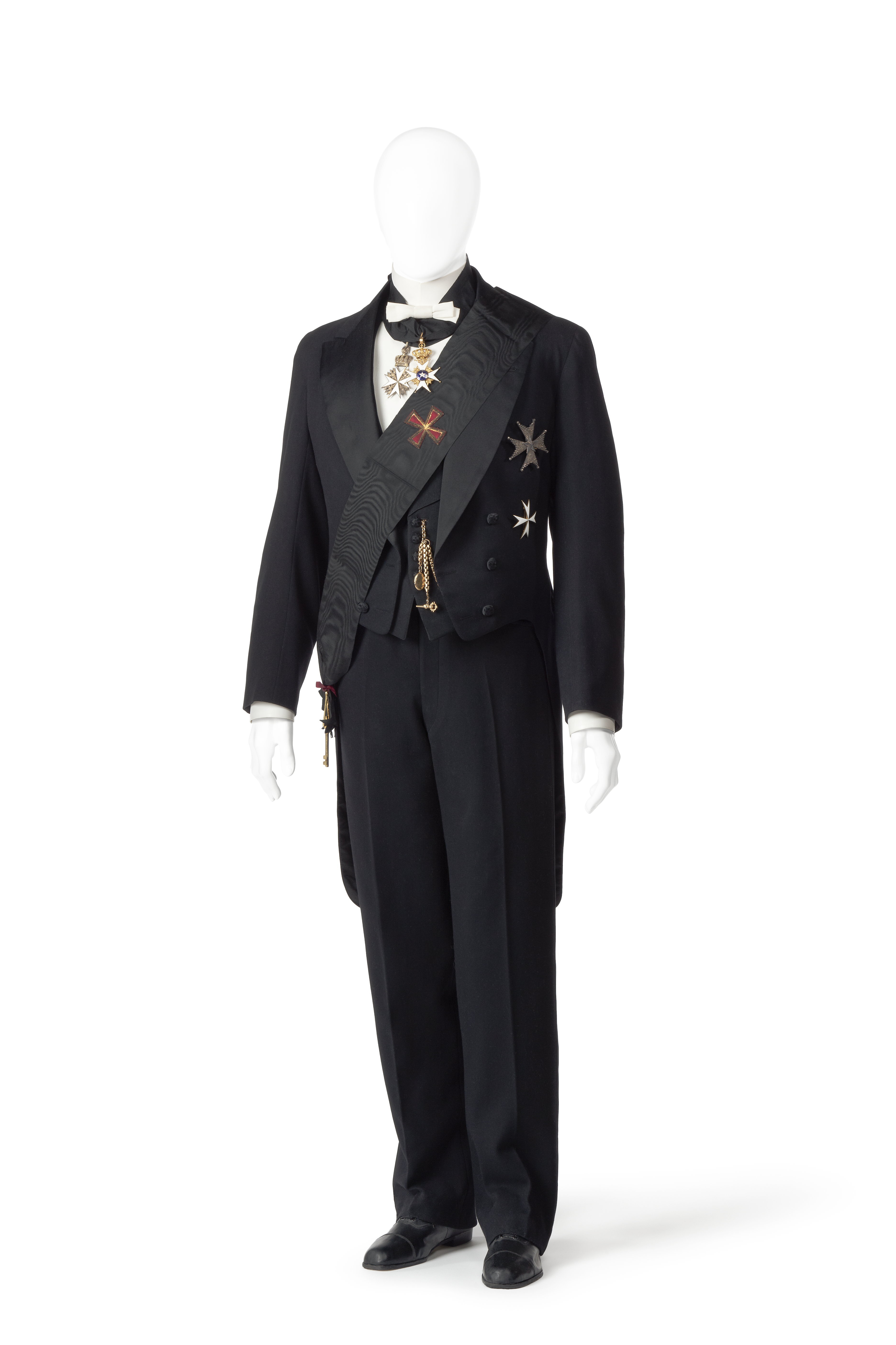 KOSTYM (frack-) Bestående av frack, väst och byxor. Av svart crêpetyg, med svarta slagna knappar. Hand- och maskinsydd. Frack: Tvåradig, rygg- och sidstycken livskurna, framstyckena baktill i dylikt snitt, framtill kortskurna, med rundade hörn; tre par knappar, nedviken krage och långa slag, i det vänstra ett knapphål. Långa skört, upptill med två knappar samt med främre hörnen rundade, de bakre raka och med fickor. Ryggen med mittsöm, samt sid-, skulder- och axelsömmar. Knapparna runda, svagt kupiga, med smårutigt svart siden. Knapparna fram- och baktill lika stora, de på ärmarna mindre. Foder av svart sidensars, på vardera framstycket en bröstficka; ärmfoder av vit sidensatin. Alla fickor av vitt bomullstyg. Mått: Ärmhålsdjup: 23 cm.; livlängd: 50 cm.; längd, hel: 105 cm.; ryggbredd, halv: 19 cm.; ärmlängd: 82 cm.; bröstvidd, fram: 48 cm.; bröstvidd, hel: 108 cm.; livvidd: 96 cm. Väst: Enradig, med fyra knappar som de mindre i fracken samt sjalkrage, på båda framstyckena ficka nedtill, på det vänstra en bröstficka. Ryggstycke av svart sidensars, ett stycke från nedre kanten två spänntampar med svartlackerat spänne med två taggar (tornar). Fodret av gulvit bomullssatin. Fickorna av svart bomullstyg. Mått: Schalöppning: 48 cm. Hel västlängd: 67 cm. Byxor: Upptill på vardera sidan en tvärficka. Midjeband med hake och hyska, knapp och knapphål samt sex hängselknappar. Knapparna av svartlackerad metall, runda, fyrhåliga, med plana kanter, ytterst svagt uppåtböjda samt med insänkt mitt. Gylfen med fyra knappar. Midjebandet fodrat med rött skinn (saffian), bak- och gylffoder av vit kypert. Fickor av gulvit grov bomullssatin. Knapphålen handsydda med svart grovt silke eller vit bomullstråd. Mått: Yttersöm, längd: 106 cm.; innersöm, längd: 83 cm.; livvidd: 86 cm.; stussvidd: 106 cm.; lårvidd: 68 cm.; knävidd: 48 cm.; vidd nedtill: 46 cm. Frackens ärmfoder nött och lagat. Förfärdigade efter beställning av Walther von Hallwyl den 22 Januari 1912 hos skrädderifirman Fr. Kaedings Efterträdare, Zittorin & Lundvik, hovleverantörer.