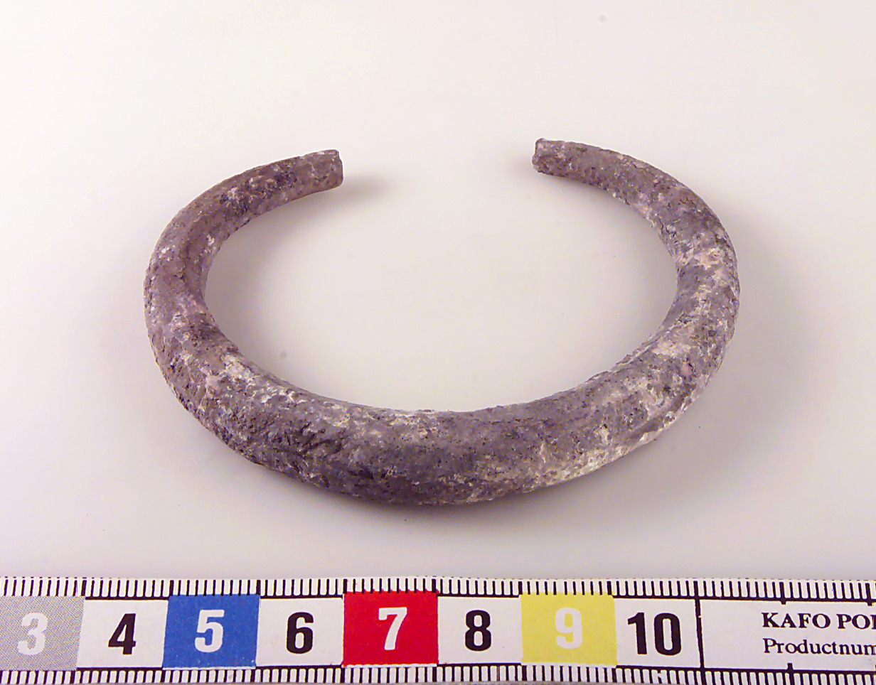 Svagt mångkantig ten med avsmalnande ändar. Ornerad med motställda trianglar i tre rader. Korroderat ytskikt.