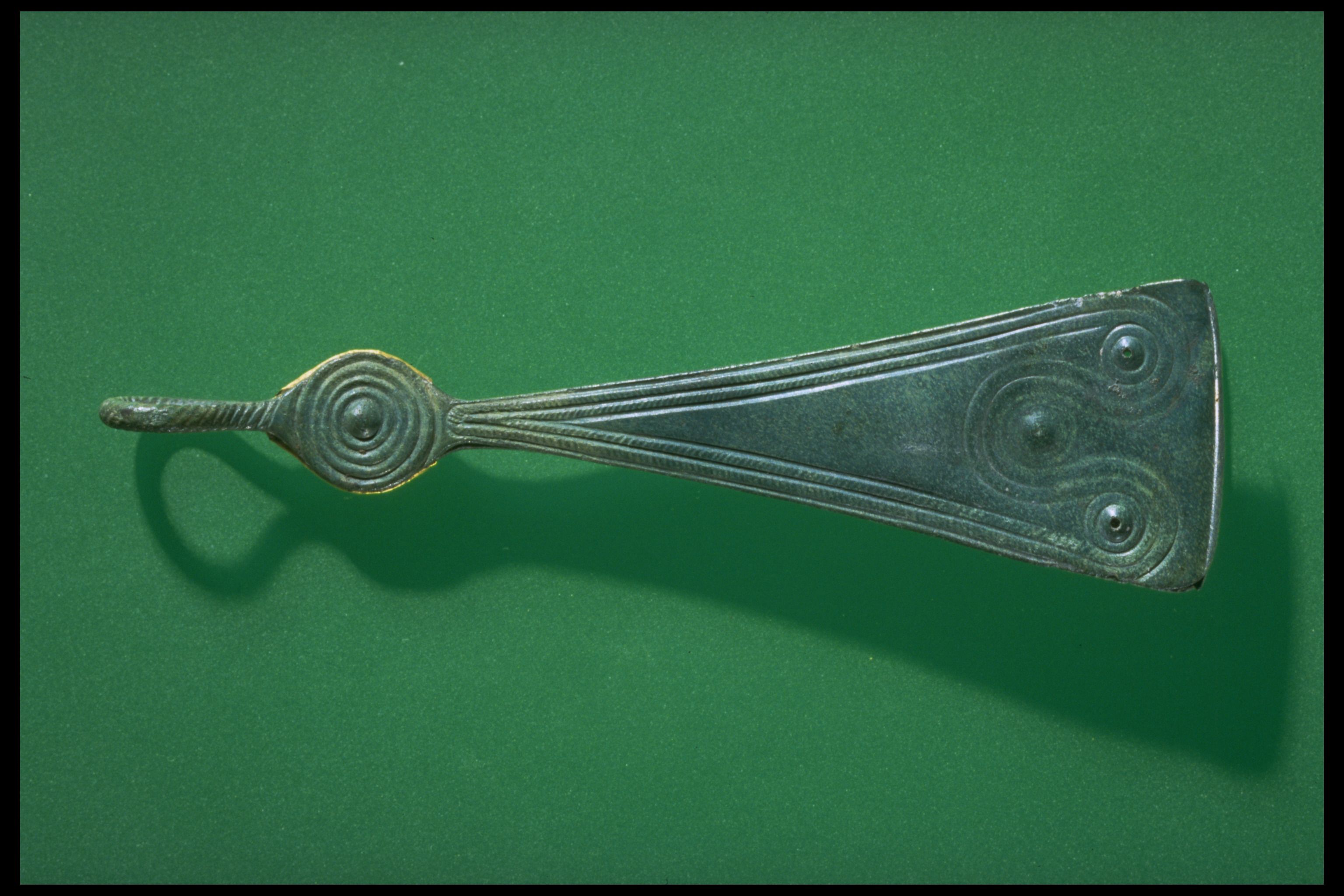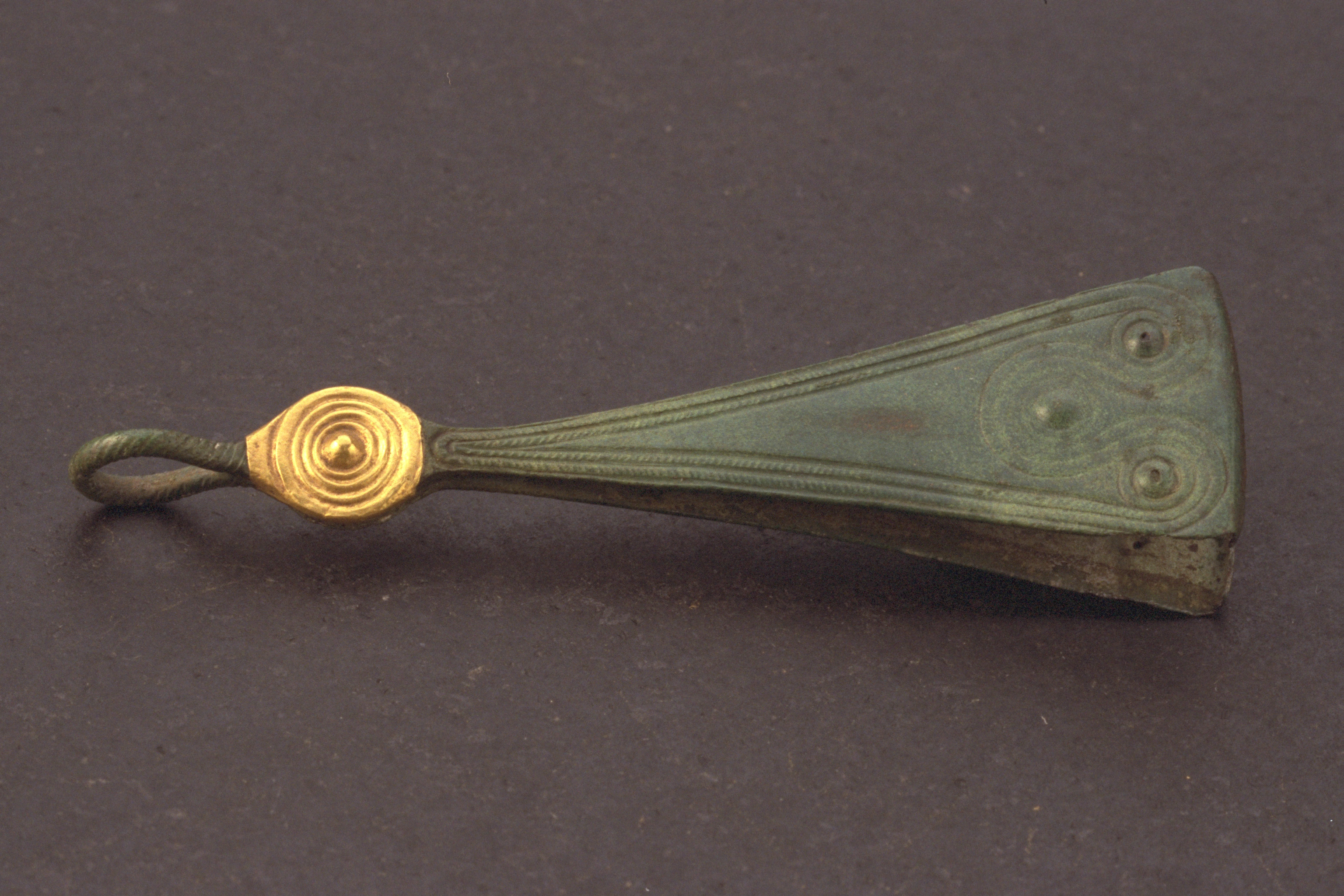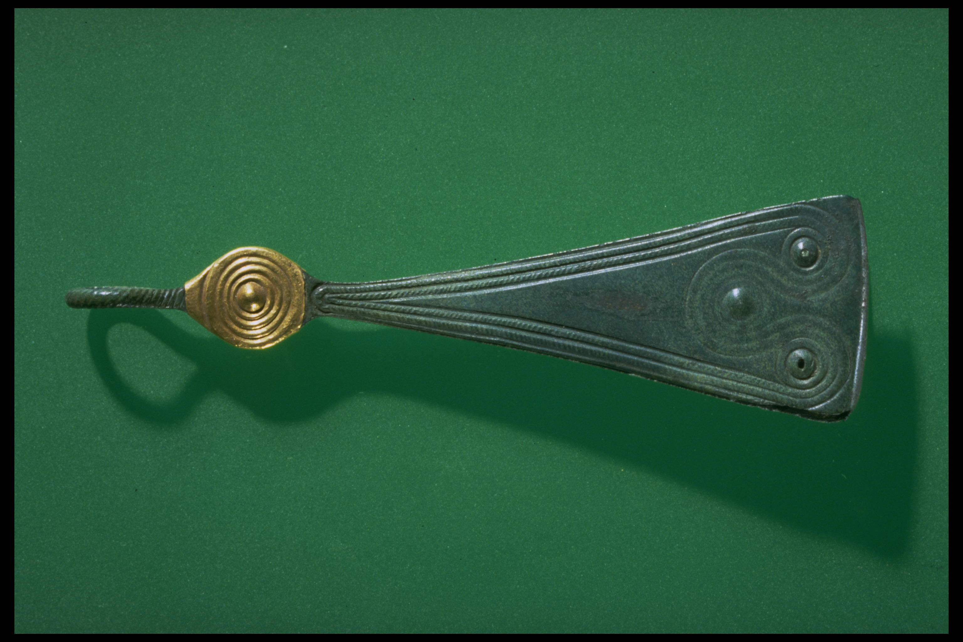 Bronspincett, belagt med tunt guldbleck på skivan vid fästet. M per IV. Funnen vid plöjning.