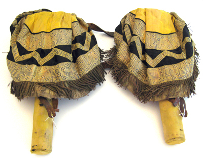 Hölster av svart läder, flaskformat med två iskurna hällor upptill. Genom hällorna är trätt ett svart läderband med ett rektangulärt spänne i ena änden samt med sex skärphål i motstående ände. Hölstret är nedtill klätt med gul sidendamast, kantat av en röd bård. Hölstret är i övre kanten på insidan fodrat med gult kläde. Över hölstret är trätt och fastspännt en rund hölsterkappa med en rund öppning upptill. Hölsterkappan är av gul sidendamast med svart sidedamast nedtill samt garnerad med galoner. Två breda galoner, b.55 mm, löper runtom i nederkanten. Mellan dessa är i ett viggmönster på det svarta sidentyget påsytt en smalare galon, b. 20 mm. Upptill kantas hölsterkappan av en omvikt galon, b. 10 mm. Samtliga galoner av silverlan och av förgyllda silverlan samt av gul silkestråd. En 58 mm lång frans kantar nedtill. Fransen är av tvinnad förgylld silvertråd samt av tvinnad rödaktig koppartråd och av buljoner av förgylld silvertråd. Under fransen sitter påsytt en kappa av förgyllda lan. Hölsterkappan är fodrad med beige säckväv. I nedre kanten sitter påsytt ett ljusbrunt läderband som spänts runtom hölstrets nedre del.