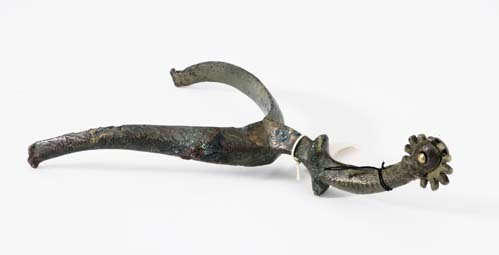 Sporre av mässing. U-formade något nedåtsvängda skänklar , med konvex utsida varpå punsad bladbård. Hals 65 mm först svängd i båge med utskott på över- och undersidan sedan nedåtsvängd, dekorerad med punsning. Fintandad klinga. Gåva av antikhandlare Erik Olofsson, Fleminggatan 9, Stockholm. Funnen vid grundgrävning Kungsgatan 29, Stockholm.