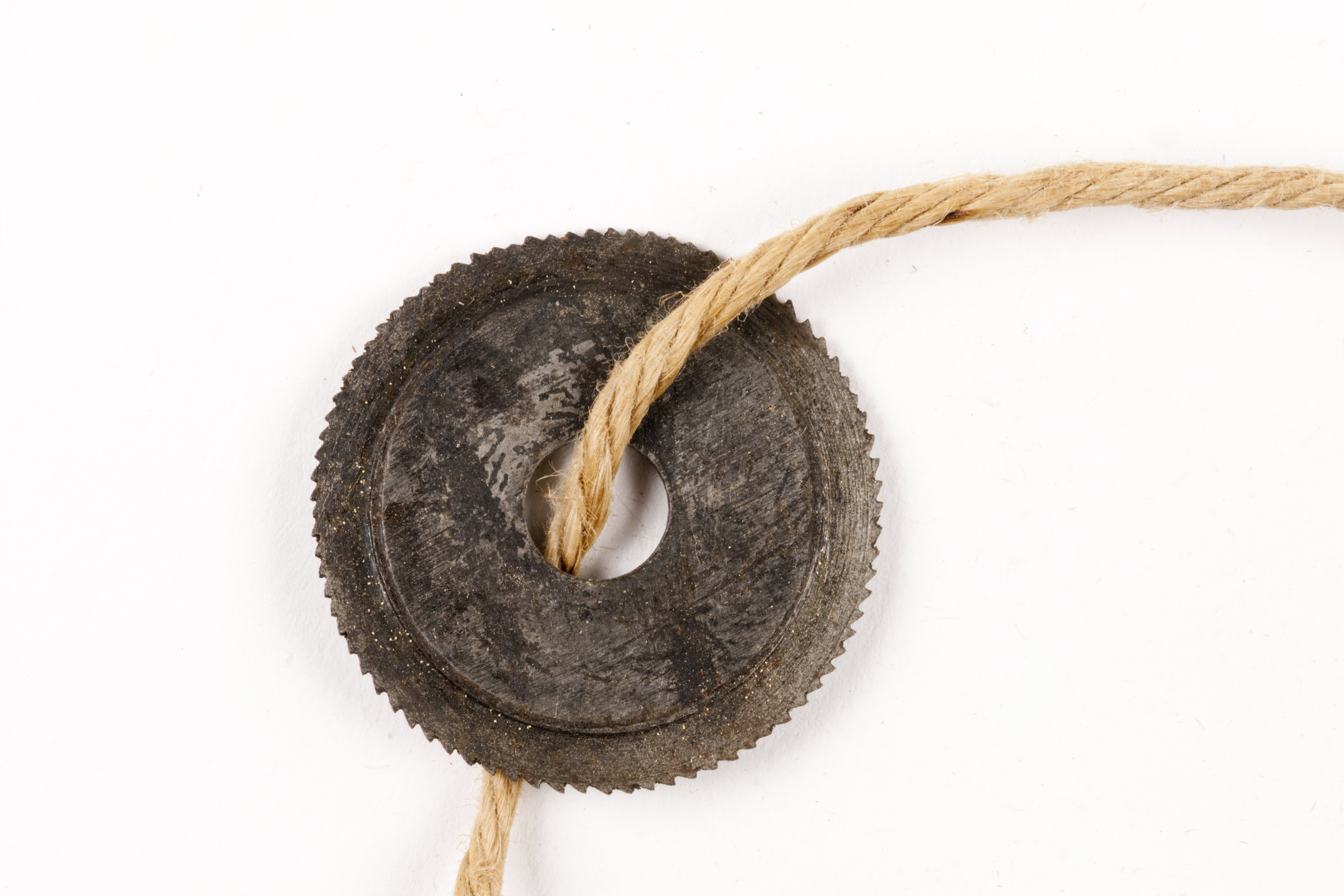 Rund, tjockare mot mitten, tvärgående tänder. Hålets diam 7 mm. Stämplad med en punkt.