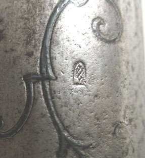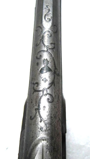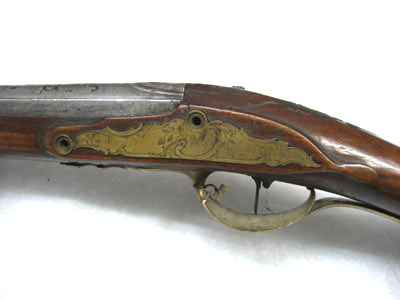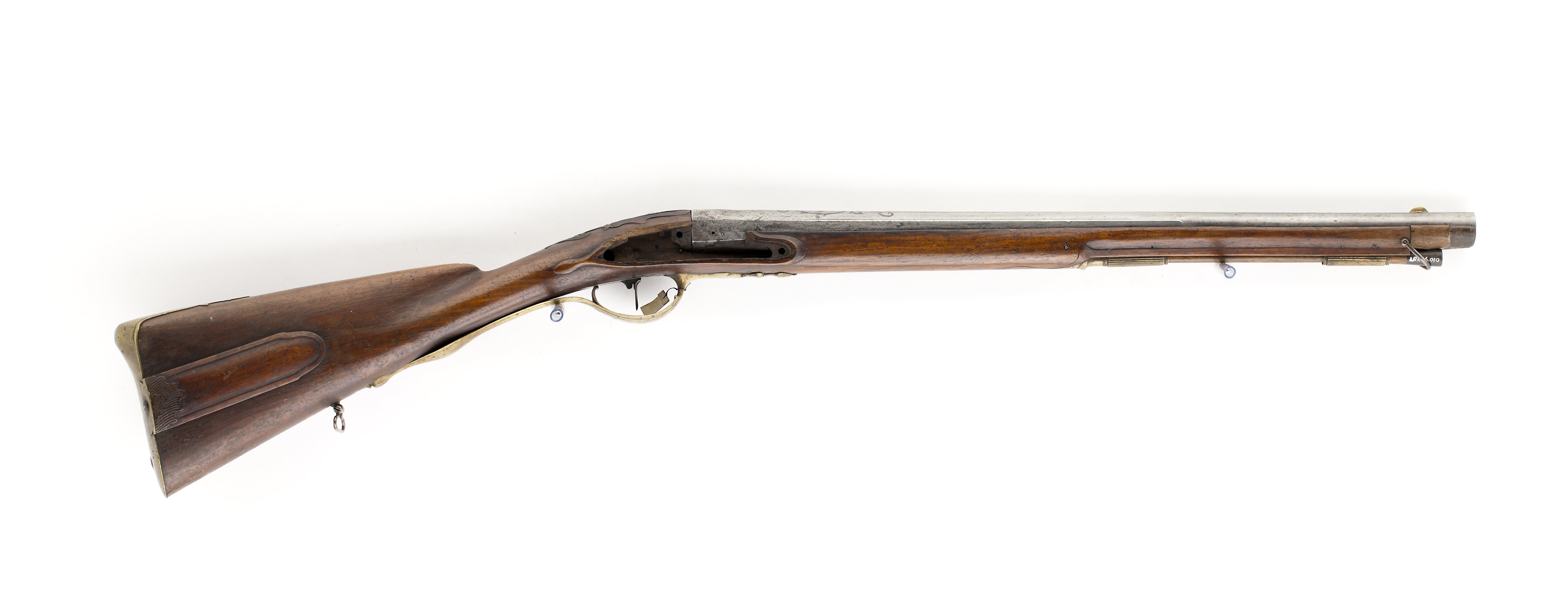 Pipa av stål. Åttsidig kammare med baktill slät ovansida med inlagd dekor av silver förställande slät byst (Diana med månskäran ?) omgärdad av slingrande mönster. Platt ås från kammarens mitt till mynningen. På ovansidan 3 mm stämpel, sköldformig med snedställda linjer. På undersidan en tvärställd urtagning och under denna två inslagna smedsstämplar. Riktmedell: Siktskåra över svansskruvbladet. Ovalt stolpkorn av mässing. Avtryckarbleck av stål, rektangulärt med utdragna rundade ändar. Avtryckaren rak, platt och med framsidan svagt välvd. Varbygel av mässing. Rundat fingerläge med graverad blomma med utskjutande blad åt sidorna inom fält med skurna kantlinjer. Främre delen utdragen till rikt konturerat ornament med räfflad bred spets. Bakre delen slät, lätt välvd och utdragen ända till kolvens mitt. Helstock av brunfärgat trä. Framstocken slät med öppen kanal för laddstock. Två rörkor av mässing med längsgående räffling och drivna ringar i ändarna, inre rörkan med utdragen spets. Kolv av europeisk typ, riktad nedåt med rund hals och hög rygg. Runt svansskruven skuren dekor. Kolvlåda med välvt lock, skuren dekor av två utskjutande blad. Bakplåt av mässing, upptill utdragen över kolvryggen i form av osymmetriskt ornament med graverad blomsterdekor. På anslagssidan kindstöd med baktill skuren volut och blomma, framtill ett flikigt ornament. Sidbleck av mässing med osymmetriska kanter och gravyr av rocaille växtslingor. Hål för två låsskruvar. Rembygel av stål i framstock och kolv. Tillbehör: Laddstock, l 535 mm, av ljusbrunt trä. I ena änden svagt konisk skoning av mörkbrunt horn, andra änden avbruten.