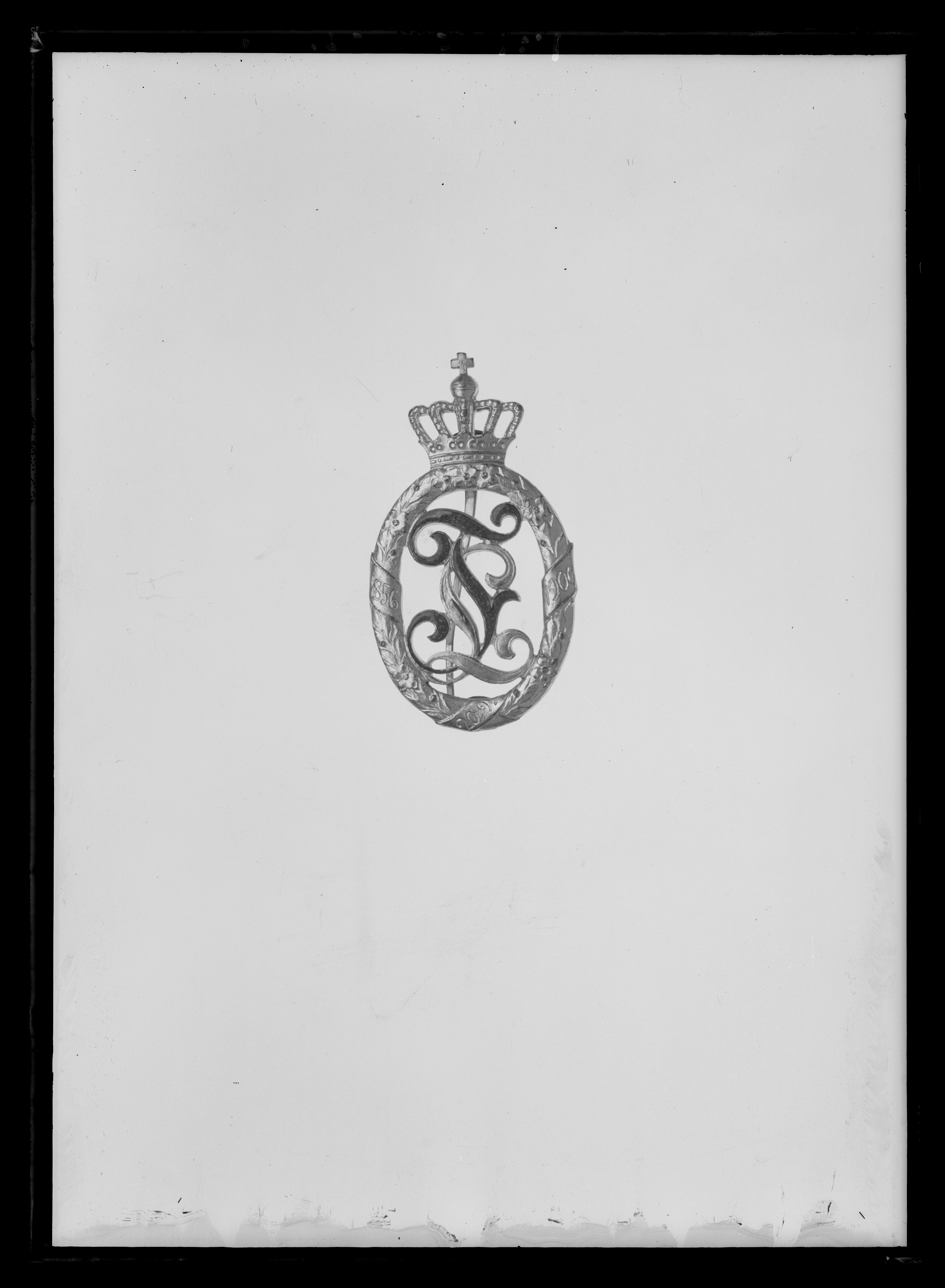 Namnchiffer av förgyllt silver, L samt rödemaljerat F. Däromkring oval, krönt lagerkransmed instuckna blommor, omlindad med textband: "1856 20.9 1906". På baksidan fäst en vertikalt placerad säkerhetsnål, på kransens baksida graverat ifrakturstil: G.