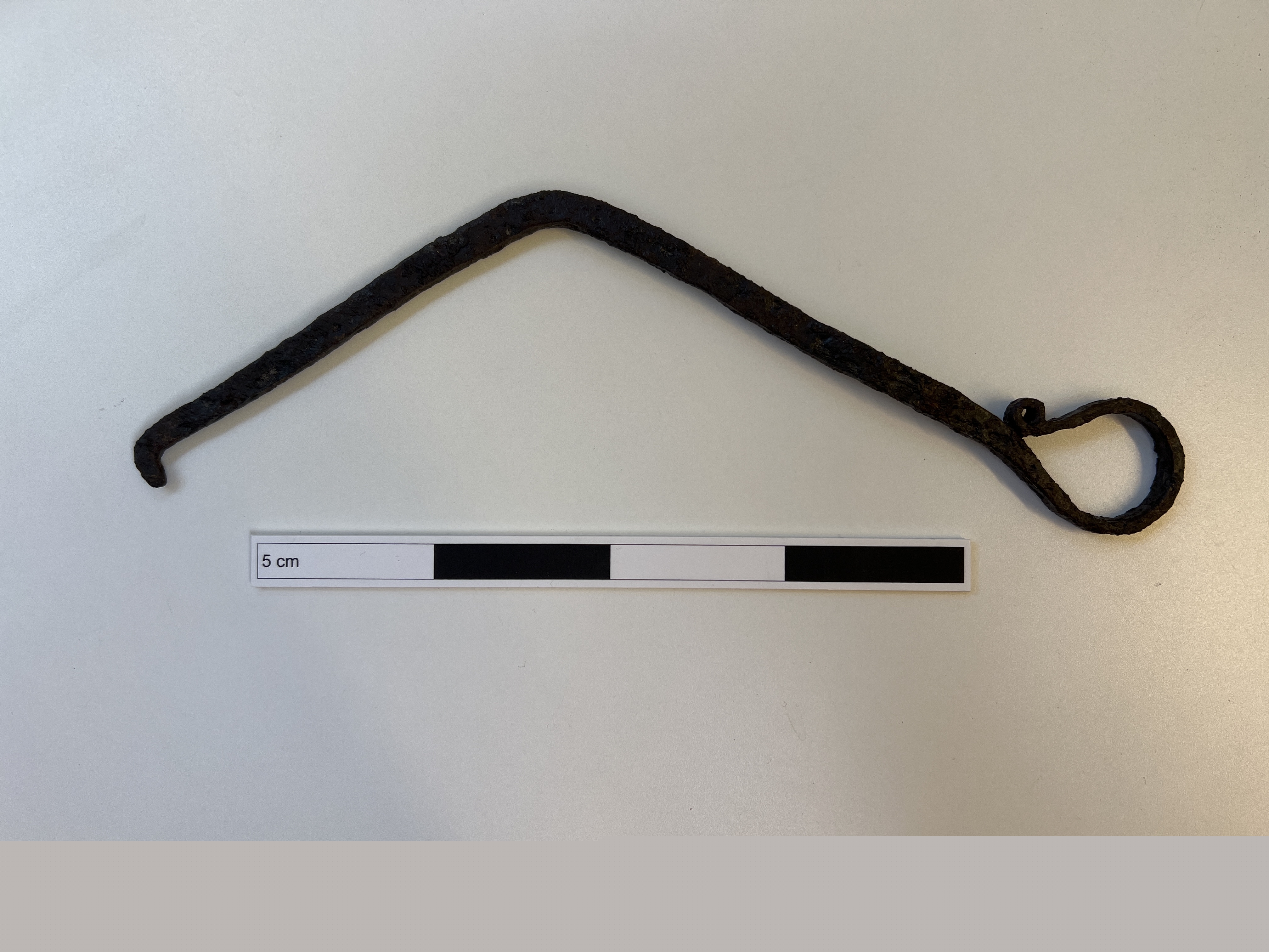 av plan järnten, böjd i vinkel med ögleformat handtag och tenens ände hakformigt uppböjd
