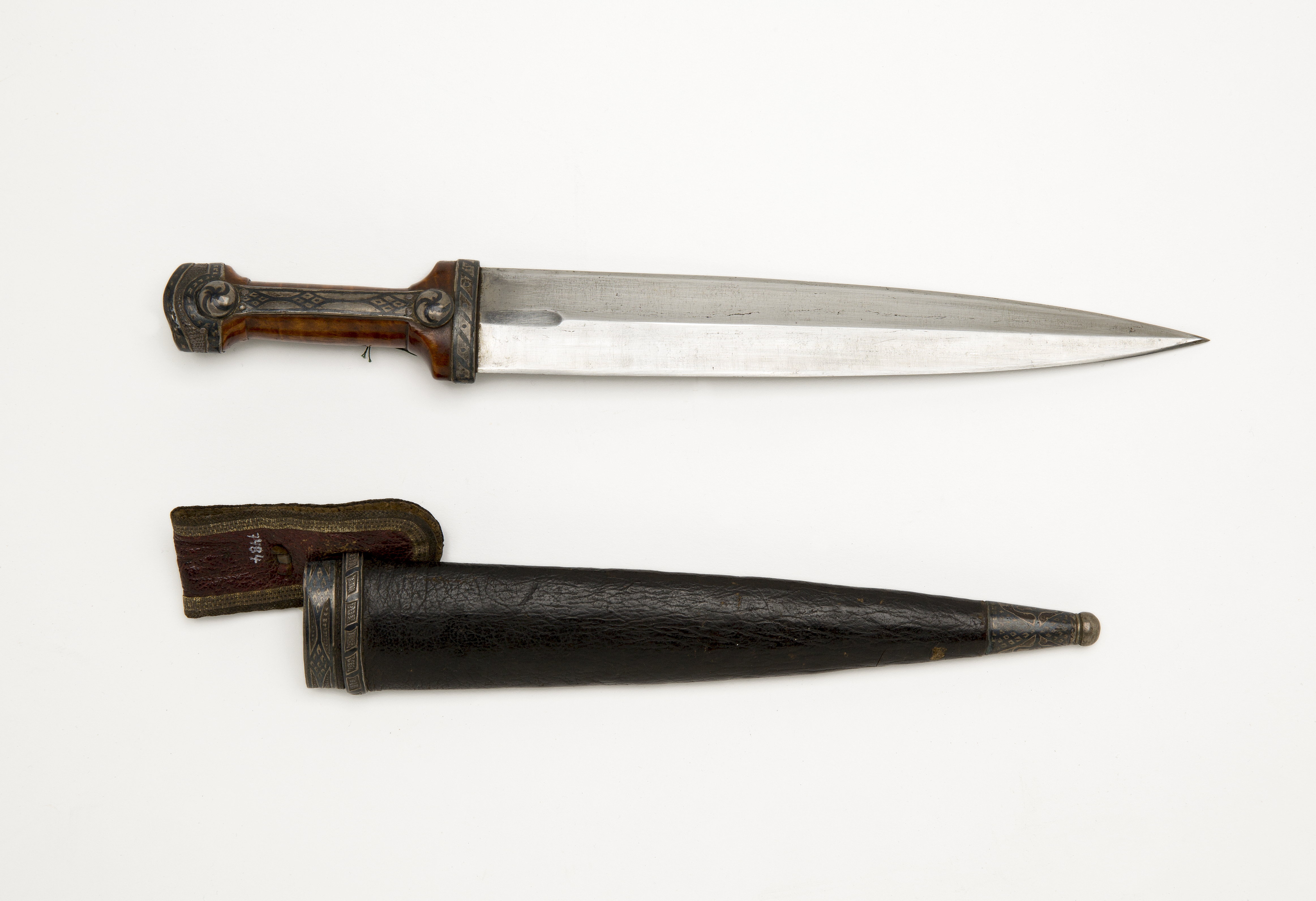 Fäste av trä (citronträ?) med beslag av silver band med dekor i niello. Fästet har oval genomskärning, med formsnidat mittparti. Ytteränden har ett beslag med punsad dekor och kantdekor i niello. På fästet finns längsgående silverband med, på framsidan, två nitar med runda huvuden. Tvåeggad klinga av stål med jämnbreda mötande skär, invid basen är den smala ryggåsen utplanad.
