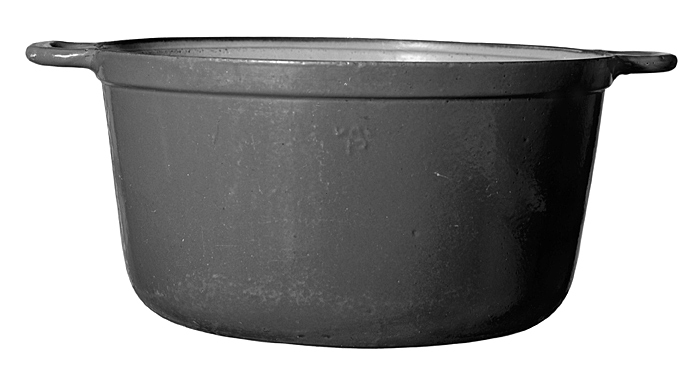 GRYTA Av järn; gjuten, utanpå brunemaljerad, inuti gråemaljerad. Omvänt svagt konisk, med rundad bottenkant, plan botten och två öron. Kring bräddens utsida ett utstående band, kring insidan en fals för locket. Öron rakt utstående, flackstaviga och bågformiga samt med utvidgade fästen. Höjd: 17,7 cm.; diameter: 33,8 cm.