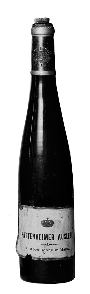 HATTENHEIMER Auslese, två helbuteljer Av mörkbrunt glas. Kägelformiga, med stärkring kring mynning; bottnen skålig. Etikett vit, på denna text med exportfirmans namn (A. Koch Söhne in Mainz) i svart, däröver en sluten krona i guld. Kapsylfragment av förtent bly, blåfärgat, på detsamma exportfirmans namn och stadens vapensköld i relief, upptill och nedtill en guldbård. Höjd: 35,5 cm.; diameter: 7,7 cm.