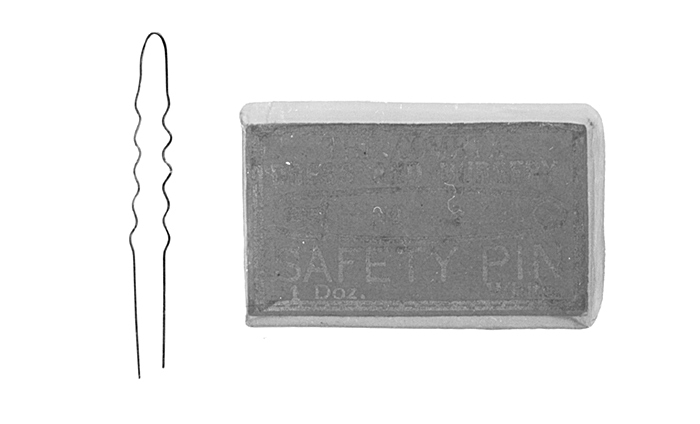 HÅRNÅLAR, 10 st, i ask Av rundstavig mässingtråd, med vågig mitt. Längd: ca 5 cm A s k (original): Av papp, klädd med glättat vitt papper. Rektangulär med utanpå- gående trycklock. På översidan en etikett med engelsk text. Höjd: 1,2 cm; längd: 5,2 cm; bredd 3,2 cm Inköpta av Wilhelmina von Hallwyl i början av 1900-talet. Dylika hårnålar framlades i Stora kapprummet vid större fester till användning för gästerna.