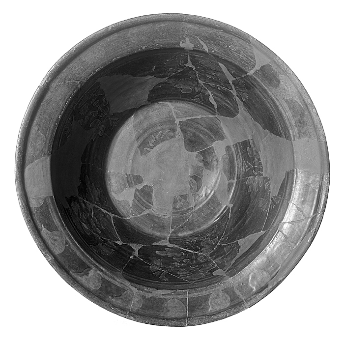 KÄRL, skål Av ljusbrunt lergods, med grön blyglaserad insidan. Hopsatt av ett flertal fragment Stympad trattformig, brädd rakt utsående med uppböjd kant. Dekor av piplera pålagd under glasyren (synlig som ljusgrön genom denna). På väggen fem nejliknande växtermed tre blommor upptill, på botten några otydliga ornament. På brädden en rad oregelbundet formade fläckar. Runt botten och brädden koncenrtiska ränder. Höjd: 12 cm Brädd diameter: 32,5 cm Botten diameter: 18 cm Från omkring 1600-talet.